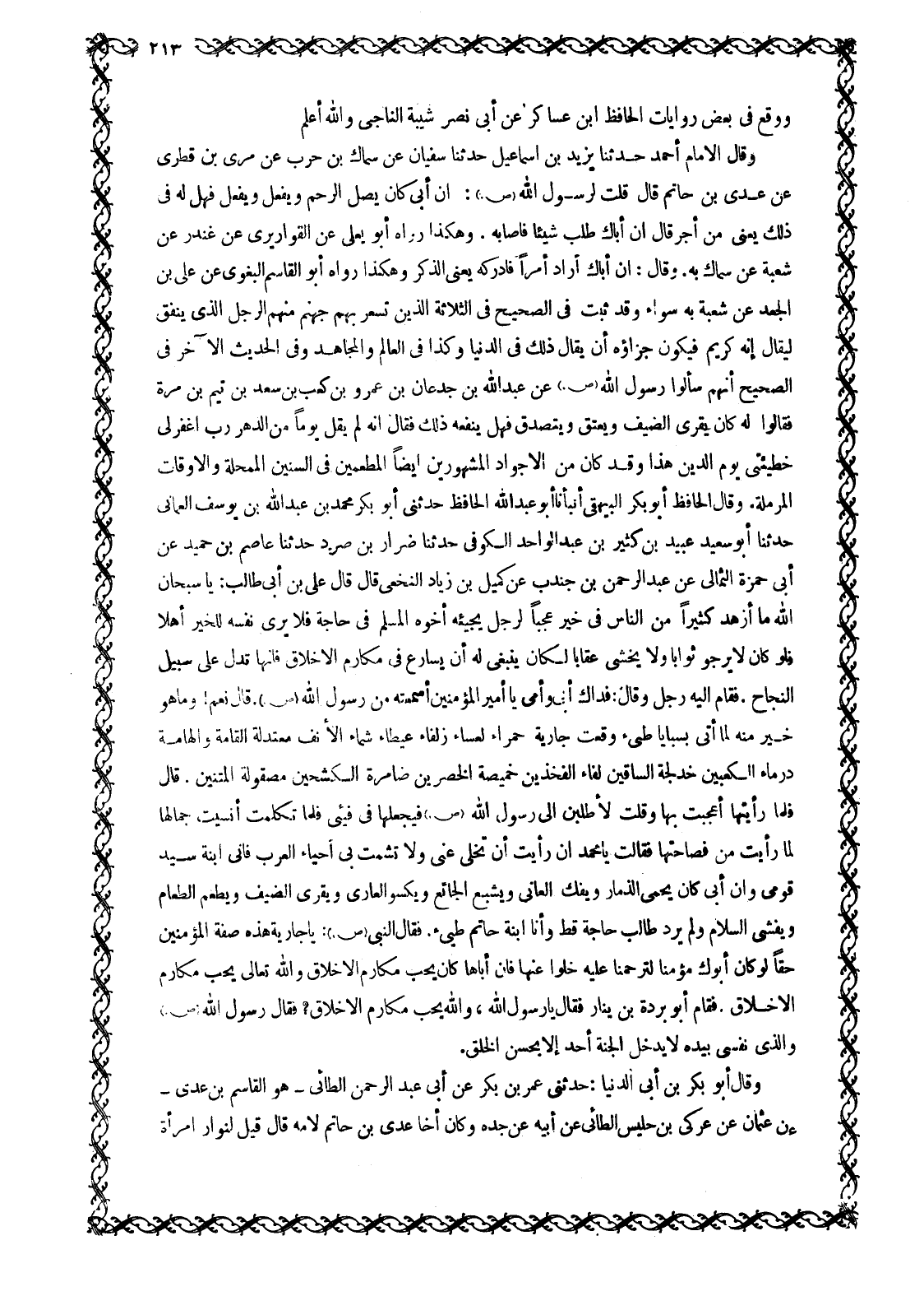 وَقَالَ الْإِمَامُ أَحْمَدُ حَدَّثَنَا يَزِيدُ بْنُ إِسْمَاعِيلَ حَدَّثَنَا سُفْيَانُ عَنْ سِمَاكِ بْنِ حَرْبٍ عَنْ مُرَيِّ بْنِ قَطَرِيٍّ عَنْ عَدِيِّ بْنِ حَاتِمٍ قَالَ قُلْتُ لِرَسُولِ اللَّهِ صَلَّى اللَّهُ عَلَيْهِ وَسَلَّمَ: إِنَّ أَبِي كَانَ يَصِلُ الرَّحِمَ وَيَفْعَلُ وَيَفْعَلُ فَهَلْ لَهُ فِي ذَلِكَ يَعْنِي مِنْ أَجْرٍ قَالَ إِنَّ أَبَاكَ طَلَبَ شَيْئًا فَأَصَابَهُ. وَهَكَذَا رَوَاهُ أَبُو يَعْلَى عَنِ الْقَوَارِيرِيِّ عَنْ غُنْدَرٍ عَنْ شُعْبَةَ عَنْ سِمَاكٍ بِهِ. وَقَالَ: إِنَّ أَبَاكَ أَرَادَ أَمْرًا فَأَدْرَكَهُ يَعْنِي الذِّكْرَ وَهَكَذَا رَوَاهُ أَبُو الْقَاسِمِ الْبَغَوِيُّ عَنْ عَلِيِّ بْنِ الْجَعْدِ عَنْ شُعْبَةَ بِهِ سَوَاءً وَقَدْ ثَبَتَ فِي الصَّحِيحِ فِي الثَّلَاثَةِ الَّذِينَ تُسَعَّرُ بِهِمْ جَهَنَّمُ مِنْهُمُ الرَّجُلُ الَّذِي يُنْفِقُ لِيُقَالَ إِنَّهُ كَرِيمٌ فَيَكُونُ جَزَاؤُهُ أَنْ يُقَالَ ذَلِكَ فِي الدُّنْيَا وَكَذَا فِي الْعَالَمِ وَالْمُجَاهِدِ وَفِي الْحَدِيثِ الْآخَرِ فِي الصَّحِيحِ أَنَّهُمْ سَأَلُوا رَسُولَ اللَّهِ صَلَّى اللَّهُ عَلَيْهِ وَسَلَّمَ عَنْ عَبْدِ اللَّهِ بْنِ جُدْعَانَ بْنِ عَمْرِو بْنِ كَعْبِ بْنِ سَعْدِ بْنِ تَيْمِ بْنِ مُرَّةَ فَقَالُوا لَهُ كَانَ يَقْرِي الضَّيْفَ وَيَعْتِقُ وَيَتَصَدَّقُ فَهَلْ يَنْفَعُهُ ذَلِكَ فَقَالَ إِنَّهُ لَمْ يَقُلْ يَوْمًا مِنَ الدَّهْرِ رَبِّ اغْفِرْ لِي خَطِيئَتِي يَوْمَ الدِّينِ هَذَا وَقَدْ كَانَ مِنَ الْأَجْوَادِ الْمَشْهُورِينَ أَيْضًا الْمُطْعِمِينِ فِي السِّنِينَ الْمُمْحِلَةِ وَالْأَوْقَاتِ الْمُرْمِلَةِ. وَقَالَ الْحَافِظُ أَبُو بَكْرٍ الْبَيْهَقِيُّ أَنْبَأَنَا أَبُو عَبْدِ اللَّهِ الْحَافِظُ حَدَّثَنِي أَبُو بَكْرٍ مُحَمَّدُ بْنُ عَبْدِ اللَّهِ بْنُ يُوسُفَ الْعُمَانِيُّ حَدَّثَنَا أَبُو سَعِيدٍ عُبَيْدُ بْنُ كَثِيرِ بْنِ عَبْدِ الْوَاحِدِ الْكُوفِيُّ حَدَّثَنَا ضِرَارُ بْنُ صُرَدَ حَدَّثَنَا عَاصِمُ بْنُ حُمَيْدٍ عَنْ أَبِي حَمْزَةَ الثُّمَالِيِّ عَنْ عَبْدِ الرَّحْمَنِ بْنِ جُنْدُبٍ عَنْ كُمَيْلِ بْنِ زِيَادٍ النَّخَعِيِّ قَالَ قَالَ عَلِيُّ بْنُ أَبِي طَالِبٍ: يَا سُبْحَانَ اللَّهِ مَا أَزْهَدَ كَثِيرًا مِنَ النَّاسِ فِي خَيْرٍ عَجَبًا لِرَجُلٍ يَجِيئُهُ أَخُوهُ الْمُسْلِمُ فِي حَاجَةٍ فَلَا يَرَى نَفْسَهُ لِلْخَيْرِ أَهْلًا فَلَوْ كَانَ لَا يَرْجُو ثَوَابًا وَلَا يَخْشَى عِقَابًا لَكَانَ يَنْبَغِي لَهُ أَنْ يُسَارِعَ فِي مَكَارِمِ الْأَخْلَاقِ فَإِنَّهَا تَدُلُّ عَلَى سَبِيلِ النَّجَاحِ. فَقَامَ إِلَيْهِ رَجُلٌ وَقَالَ: فِدَاكَ أَبِي وَأمِّي يَا أَمِيرَ الْمُؤْمِنِينَ أَسَمِعْتَهُ مِنْ رَسُولِ اللَّهِ صَلَّى اللَّهُ عَلَيْهِ وَسَلَّمَ. قَالَ نَعَمْ! وَمَا هُوَ خَيْرٌ مِنْهُ لَمَّا أُتِيَ بِسَبَايَا طيِّئ وَقَعَتْ جَارِيَةٌ حَمْرَاءُ لَعْسَاءُ ذَلْفَاءُ عَيْطَاءُ شَمَّاءُ الْأَنْفِ مُعْتَدِلَةُ القامة والهامة درماء الكعبين خدلجة السَّاقَيْنَ لَفَّاءُ الْفَخِذَيْنِ خَمِيصَةُ الْخَصْرَيْنِ ضَامِرَةُ الْكَشْحَيْنِ مَصْقُولَةُ الْمَتْنَيْنِ. قَالَ فَلَمَّا رَأَيْتُهَا أُعْجِبْتُ بِهَا وَقُلْتُ لَأَطْلُبَنَّ إِلَى رَسُولِ اللَّهِ صَلَّى اللَّهُ عَلَيْهِ وَسَلَّمَ فَيَجْعَلُهَا فِي فَيْئِي فَلَمَّا تَكَلَّمْتُ أُنْسِيتُ جَمَالَهَا لِمَا رَأَيْتُ مِنْ فَصَاحَتِهَا فَقَالَتْ يَا مُحَمَّدُ إِنْ رَأَيْتَ أَنْ تُخَلِّيَ عَنِّي وَلَا تُشْمِتْ بِيَ أَحْيَاءَ الْعَرَبِ فَإِنِّي ابْنَةُ سَيِّدِ قَوْمِي وَإِنَّ أَبِي كَانَ يَحْمِي الذِّمَارَ وَيَفُكُّ الْعَانِيَ وَيُشْبِعُ الْجَائِعَ وَيَكْسُو الْعَارِيَ وَيَقْرِي الضَّيْفَ وَيُطْعِمُ الطَّعَامَ وَيُفْشِي السَّ