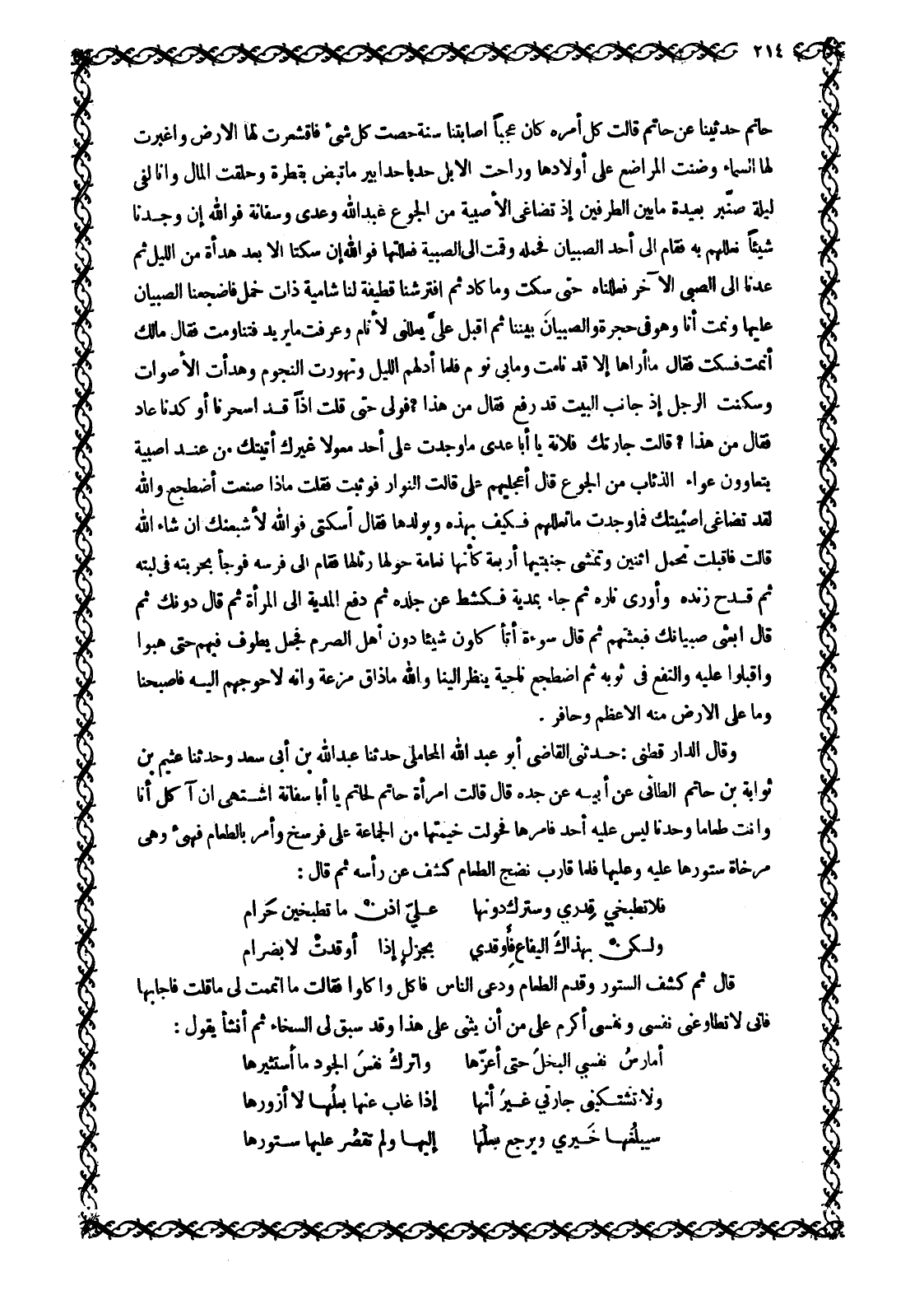 حَاتِمٍ حَدِّثِينَا عَنْ حَاتِمٍ قَالَتْ كُلُّ أَمْرِهِ كَانَ عَجَبًا أَصَابَتْنَا سَنَةٌ حَصَّتْ كُلَّ شَيْءٍ فَاقْشَعَرَّتْ لَهَا الْأَرْضُ وَاغْبَرَّتْ لَهَا السَّمَاءُ وَضَنَّتِ المراضع على أولادها وراحت الإبل حدبا حدابير ما تبض بقطرة وحلقت الْمَالُ وَإِنَّا لَفِي لَيْلَةٍ صِنَّبْرٍ بَعِيدَةِ مَا بَيْنَ الطَّرَفَيْنِ إِذْ تَضَاغَى الْأَصْبِيَةُ مِنَ الْجُوعِ عبد الله وعدي وسفانة فو الله إِنْ وَجَدْنَا شَيْئًا نُعَلِّلُهُمْ بِهِ فَقَامَ إِلَى أحد الصبيان فحمله وقمت الى الصبية فعللتها فو الله إِنْ سَكَتَا إِلَّا بَعْدَ هَدْأَةٍ مِنَ اللَّيْلِ ثُمَّ عُدْنَا إِلَى الصَّبِيِّ الْآخَرِ فَعَلَّلْنَاهُ حَتَّى سَكَتَ وَمَا كَادَ ثُمَّ افْتَرَشْنَا قَطِيفَةً لَنَا شَامِيَّةً ذَاتَ خَمْلٍ فَأَضْجَعْنَا الصِّبْيَانَ عَلَيْهَا وَنِمْتُ أَنَا وَهُوَ فِي حُجْرَةٍ وَالصِّبْيَانُ بَيْنَنَا ثُمَّ أَقْبَلَ عَلَيَّ يُعَلِّلُنِي لِأَنَامَ وَعَرَفْتُ مَا يُرِيدُ فتناومت فقال ما لك أَنِمْتِ فَسَكَتُّ فَقَالَ مَا أُرَاهَا إِلَّا قَدْ نَامَتْ وَمَا بِيَ نَوْمٌ فَلَمَّا ادْلَهَمَّ اللَّيْلُ وتهورت النجوم وهدأت الأصوات وسكنت الرجل إذ جَانَبُ الْبَيْتِ قَدْ رُفِعَ فَقَالَ مَنْ هَذَا؟ فولى حتى قلت إذا قَدْ أَسْحَرْنَا أَوْ كِدْنَا عَادَ فَقَالَ مَنْ هَذَا؟ قَالَتْ جَارَتُكَ فُلَانَةُ يَا أَبَا عَدِيٍّ مَا وَجَدْتُ عَلَى أَحَدٍ مُعَوَّلًا غَيْرَكَ أَتَيْتُكَ من عند اصبية يتعاوون عواء الذئاب مِنَ الْجُوعِ قَالَ أَعَجِلِيهِمْ عَلَيَّ قَالَتْ النَّوَارُ فوثبت فقلت ماذا صنعت أضطجع وَاللَّهِ لَقَدْ تَضَاغَى أَصَبِيَتُكَ فَمَا وَجَدْتَ مَا تعللهم فكيف بهذه وبولدها فقال اسكتي فو الله لأشبعنك إِنْ شَاءَ اللَّهُ قَالَتْ فَأَقْبَلَتْ تَحْمِلُ اثْنَيْنِ وَتَمْشِي جَنْبَتَيْهَا أَرْبَعَةٌ كَأَنَّهَا نَعَامَةٌ حَوْلَهَا رِئَالُهَا فَقَامَ إِلَى فَرَسِهِ فَوَجَأَ بِحَرْبَتِهِ فِي لِبَتِّهِ ثُمَّ قَدَحَ زِنْدَهُ وَأَوْرَى نَارَهُ ثُمَّ جَاءَ بِمُدْيَةٍ فَكَشَطَ عَنْ جِلْدِهِ ثُمَّ دَفَعَ الْمُدْيَةَ إِلَى الْمَرْأَةِ ثُمَّ قَالَ دُونَكِ ثُمَّ قَالَ ابعثي صبيانك فبعثتهم ثم قال سوءة أَتَأْكَلُونَ شَيْئًا دُونَ أَهْلِ الصِّرْمِ فَجَعَلَ يُطَوِّفُ فِيهِمْ حَتَّى هَبُّوا وَأَقْبَلُوا عَلَيْهِ وَالْتَفَعَ فِي ثوبه ثم اضطجع ناحية ينظر إلينا وَاللَّهِ مَا ذَاقَ مِزْعَةً وَإِنَّهُ لِأَحْوَجُهُمْ إِلَيْهِ فأصبحنا وما على الأرض منه الأعظم وحافر.