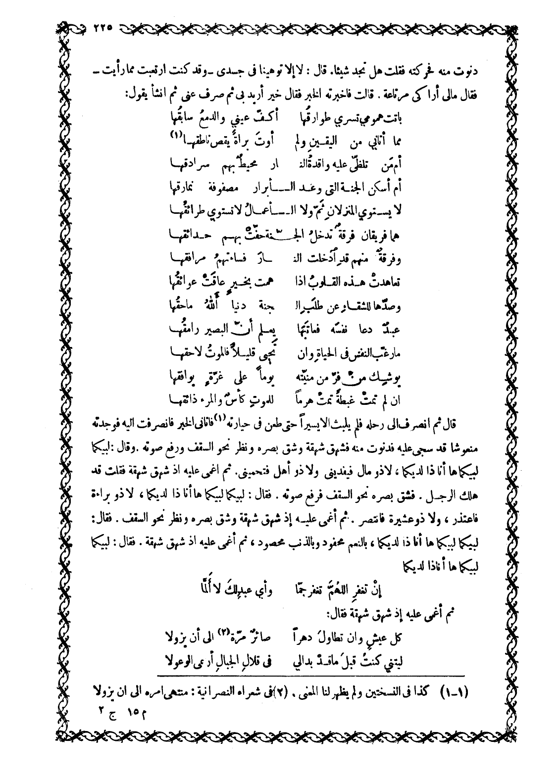 قال ثُمَّ انْصَرَفَ إِلَى رَحْلِهِ فَلَمْ يَلْبَثْ إِلَّا يسيرا حتى طعن في حيارته [1] فَأَتَانِي الْخَبَرُ فَانْصَرَفْتُ إِلَيْهِ فَوَجَدْتُهُ مَنْعُوشًا قَدْ سُجِيَ عَلَيْهِ فَدَنَوْتُ مِنْهُ فَشَهِقَ شَهْقَةً وَشَقَّ بَصَرُهُ وَنَظَرَ نَحْوَ السَّقْفِ وَرَفَعَ صَوْتَهُ. وَقَالَ: لَبَّيْكُمَا لَبَّيْكُمَا هَا أَنَا ذَا لَدَيْكُمَا، لَا ذُو مَالٍ فَيَفْدِينِي وَلَا ذُو أَهْلٍ فَتَحْمِينِي. ثُمَّ أُغْمِيَ عَلَيْهِ إِذْ شَهِقَ شَهْقَةً فَقُلْتُ قَدْ هَلَكَ الرَّجُلُ. فَشَقَّ بَصَرُهُ نَحْوَ السَّقْفِ فَرَفَعَ صَوْتَهُ. فَقَالَ: لَبَّيْكُمَا لَبَّيْكُمَا هَا أَنَا ذَا لَدَيْكُمَا، لَا ذُو بَرَاءَةٍ فَأَعْتَذِرُ، وَلَا ذُو عَشِيرَةٍ فَأَنْتَصِرُ. ثُمَّ أُغْمِيَ عَلَيْهِ إِذْ شَهِقَ شَهْقَةً وَشَقَّ بَصَرُهُ وَنَظَرَ نَحْوَ السَّقْفِ. فَقَالَ:
