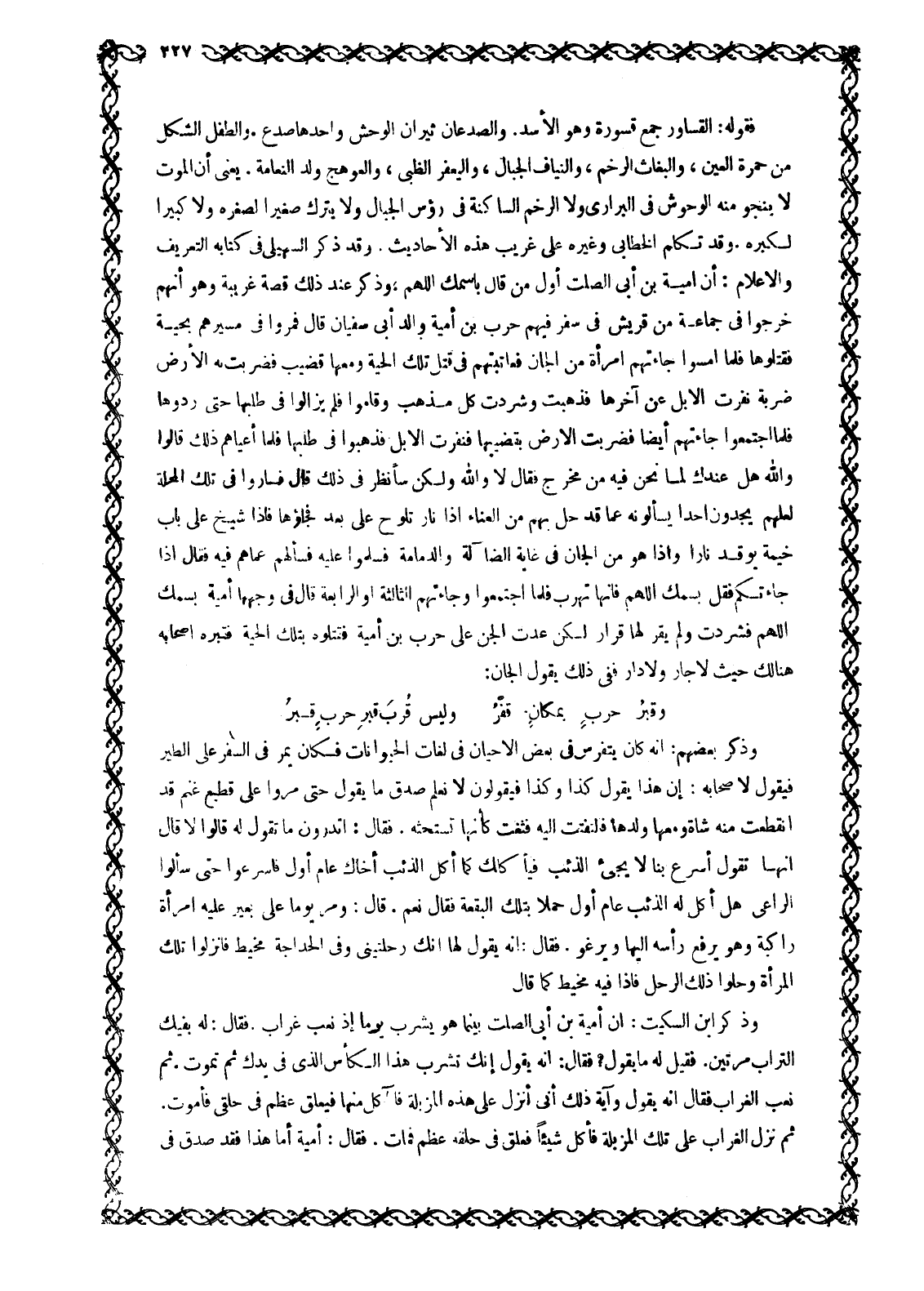 فَقَوْلُهُ: الْقَسَاوِرُ جَمْعُ قَسْوَرَةٍ وَهُوَ الْأَسَدُ. وَالصُّدْعَانُ ثِيرَانُ الْوَحْشِ وَاحِدُهَا صَدَعٌ. وَالطِّفْلُ الشَّكِلُ مِنْ حُمْرَةِ الْعَيْنِ، وَالْبُغَاثُ الرَّخَمُ، وَالنِّيَافُ الْجِبَالُ، وَالْيَعْفُرُ الظَّبْيُ، وَالْعَوْهَجُ وَلَدُ النَّعَامَةِ. يَعْنِي أَنَّ الْمَوْتَ لَا يَنْجُو مِنْهُ الْوُحُوشُ فِي الْبَرَارِي وَلَا الرَّخَمُ السَّاكِنَةُ فِي رُءُوسِ الْجِبَالِ وَلَا يَتْرُكُ صَغِيرًا لِصِغَرِهِ وَلَا كَبِيرًا لِكِبَرِهِ. وَقَدْ تَكَلَّمَ الْخَطَّابِيُّ وَغَيْرُهُ عَلَى غَرِيبِ هَذِهِ الْأَحَادِيثِ. وَقَدْ ذَكَرَ السُّهَيْلِيُّ فِي كِتَابِهِ التَّعْرِيفِ وَالْإِعْلَامِ: أَنَّ أُمَيَّةَ بْنَ أَبِي الصَّلْتِ أَوَّلُ مَنْ قَالَ بِاسْمِكَ اللَّهمّ، وَذَكَرَ عِنْدَ ذَلِكَ قِصَّةً غَرِيبَةً وَهُوَ أَنَّهُمْ خَرَجُوا فِي جَمَاعَةٍ مِنْ قُرَيْشٍ فِي سَفَرٍ فِيهِمْ حَرْبُ بْنُ أُمَيَّةَ وَالِدُ أَبِي سُفْيَانَ قَالَ فَمَرُّوا فِي مَسِيرِهِمْ بِحَيَّةٍ فَقَتَلُوهَا فَلَمَّا أَمْسَوْا جَاءَتْهُمُ امْرَأَةٌ مِنَ الْجَانِّ فَعَاتَبَتْهُمْ فِي قَتْلِ تِلْكَ الْحَيَّةِ وَمَعَهَا قَضِيبٌ فَضَرَبَتْ بِهِ الْأَرْضَ ضَرْبَةً نَفَّرَتِ الْإِبِلَ عَنْ آخِرِهَا فَذَهَبَتْ وَشَرَدَتْ كُلَّ مَذْهَبٍ وَقَامُوا فَلَمْ يَزَالُوا فِي طَلَبِهَا حَتَّى رَدُّوهَا فَلَمَّا اجْتَمَعُوا جَاءَتْهُمْ أَيْضًا فَضَرَبَتِ الْأَرْضَ بِقَضِيبِهَا فَنَفَرَتِ الْإِبِلُ فَذَهَبُوا فِي طَلَبِهَا فَلَمَّا أَعْيَاهُمْ ذَلِكَ قَالُوا وَاللَّهِ هَلْ عِنْدَكَ لِمَا نَحْنُ فِيهِ مِنْ مَخْرَجٍ فَقَالَ لَا وَاللَّهِ وَلَكِنْ سَأَنْظُرُ فِي ذلك قال فساروا في تلك المحلة لعلهم يجدون أحدا يسألونه عَمًّا قَدْ حَلَّ بِهِمْ مِنَ الْعَنَاءِ إِذَا نار تلوح على بعد فجاءوها فَإِذَا شَيْخٌ عَلَى بَابِ خَيْمَةٍ يُوقِدُ نَارًا وَإِذَا هُوَ مِنَ الْجَانِّ فِي غَايَةِ الضَّآلَةِ والدمامة فسلموا عليه فسألهم عماهم فِيهِ فَقَالَ إِذَا جَاءَتْكُمْ فَقُلْ بِاسْمِكَ اللَّهمّ فإنها تهرب فلما اجتمعوا وجاءتهم الثالثة أو الرابعة قَالَ فِي وَجْهِهَا أُمَيَّةُ بِاسْمِكَ اللَّهمّ فَشَرَدَتْ وَلَمْ يَقَرَّ لَهَا قَرَارٌ لَكِنْ عَدَتِ الْجِنُّ على حرب بن أُمَيَّةَ فَقَتَلُوهُ بِتِلْكَ الْحَيَّةِ فَقَبَرَهُ أَصْحَابُهُ هُنَالِكَ حَيْثُ لَا جَارَ وَلَا دَارَ فَفِي ذَلِكَ يَقُولُ الْجَانُّ: