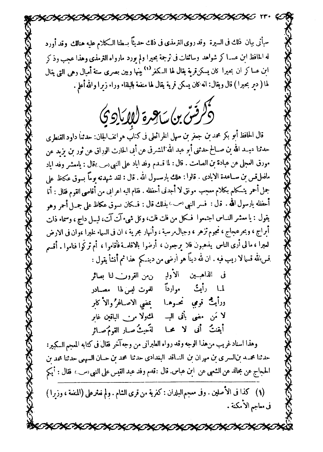 قَالَ الْحَافِظُ أَبُو بَكْرٍ مُحَمَّدُ بْنُ جَعْفَرِ بْنِ سَهْلٍ الْخَرَائِطِيُّ فِي كِتَابِ هَوَاتِفِ الْجَانِّ: حَدَّثَنَا دَاوُدُ الْقَنْطَرِيُّ حَدَّثَنَا عَبْدُ اللَّهِ بْنُ صَالِحٍ حَدَّثَنِي أَبُو عَبْدِ اللَّهِ الْمَشْرِقِيُّ عَنْ أَبِي الْحَارِثِ الْوَرَّاقِ عَنْ ثَوْرِ بْنِ يَزِيدَ عَنْ مُوَرِّقٍ الْعِجْلِيِّ عَنْ عُبَادَةَ بْنِ الصَّامِتِ. قَالَ: لَمَّا قَدِمَ وَفْدُ إِيَادٍ عَلَى النَّبِيِّ صَلَّى اللَّهُ عَلَيْهِ وَسَلَّمَ قَالَ: يَا مَعْشَرَ وَفْدِ إِيَادٍ مَا فَعَلَ قُسُّ بْنُ سَاعِدَةَ الْإِيَادِيُّ. قَالُوا: هَلَكَ يَا رَسُولَ اللَّهِ. قَالَ: لَقَدْ شَهِدْتُهُ يَوْمًا بِسُوقِ عُكَاظٍ عَلَى جَمَلٍ أَحْمَرَ يَتَكَلَّمُ بِكَلَامٍ مُعْجِبٍ مُونِقٍ لَا أَجِدُنِي أَحْفَظُهُ. فَقَامَ إِلَيْهِ أَعْرَابِيٌّ مِنْ أَقَاصِي الْقَوْمِ فَقَالَ: أَنَا أَحْفَظُهُ يَا رَسُولَ اللَّهِ. قَالَ: فَسُّرَ النَّبِيُّ صَلَّى اللَّهُ عَلَيْهِ وَسَلَّمَ بِذَلِكَ قَالَ: فَكَانَ بِسُوقِ عُكَاظٍ عَلَى جَمَلٍ أَحْمَرَ وَهُوَ يَقُولُ: يَا مَعْشَرَ النَّاسِ اجْتَمِعُوا فَكُلُّ مَنْ فَاتَ فَاتَ، وَكُلُّ شَيْءٍ آتٍ آتٍ، لَيْلٌ دَاجٍ، وَسَمَاءٌ ذَاتُ أَبْرَاجٍ، وَبَحْرٌ عَجَّاجٌ، نُجُومٌ تَزْهَرُ، وَجِبَالٌ مَرْسِيَّةٌ، وَأَنْهَارٌ مَجْرِيَّةٌ، إِنَّ فِي السَّمَاءِ لَخَبَرًا، وَإِنَّ فِي الْأَرْضِ لَعِبَرًا، مَا لِي أَرَى النَّاسَ يَذْهَبُونَ فَلَا يَرْجِعُونَ، أَرَضُوا بِالْإِقَامَةِ فَأَقَامُوا، أَمْ تُرِكُوا فَنَامُوا. أَقْسَمَ قُسٌّ باللَّه قَسَمًا لَا رَيْبَ فِيهِ. إِنَّ للَّه دِينًا هُوَ أَرْضَى مِنْ دِينِكُمْ هَذَا ثُمَّ أَنْشَأَ يَقُولُ: