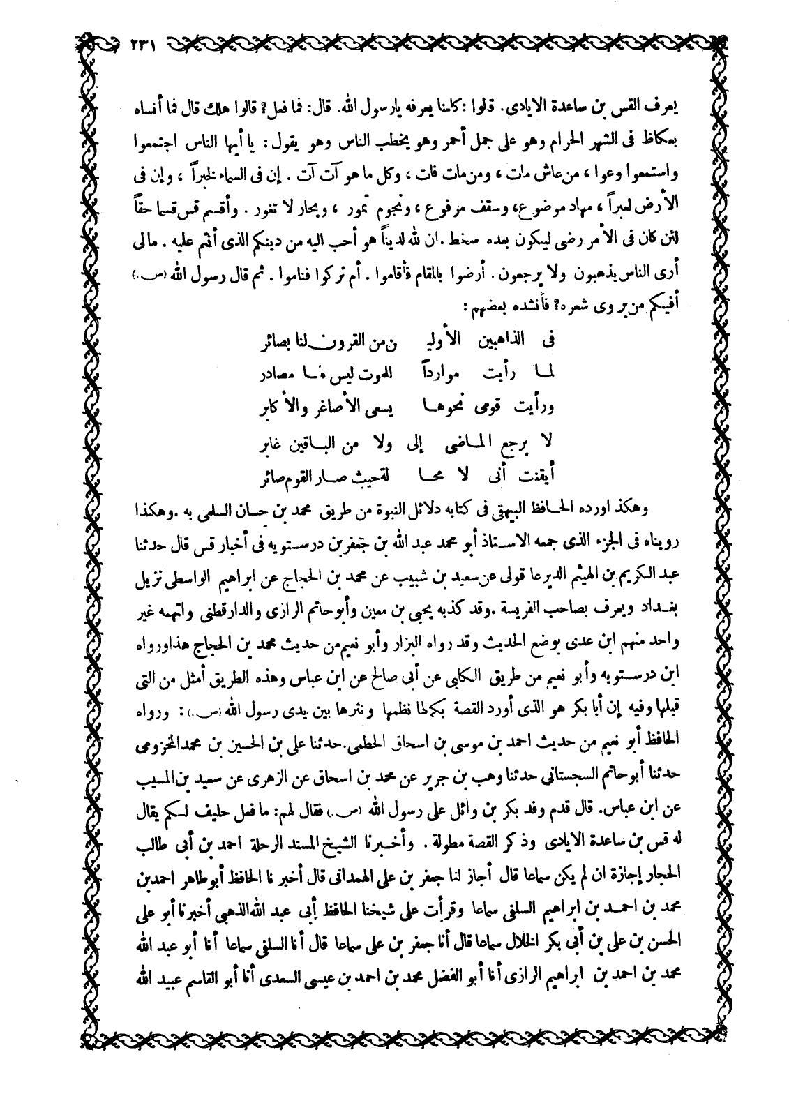 يَعْرِفُ الْقُسَّ بْنَ سَاعِدَةَ الْإِيَادِيَّ. قَالُوا: كُلُّنَا يَعْرِفُهُ يَا رَسُولَ اللَّهِ. قَالَ: فَمَا فَعَلَ؟ قَالُوا هَلَكَ قَالَ فَمَا أَنْسَاهُ بِعُكَاظٍ فِي الشَّهْرِ الْحَرَامِ وَهُوَ عَلَى جَمَلٍ أَحْمَرَ وَهُوَ يَخْطُبُ النَّاسَ وَهُوَ يَقُولُ: يَا أَيُّهَا النَّاسُ اجْتَمِعُوا وَاسْتَمِعُوا وَعُوا، مَنْ عَاشَ مَاتَ، وَمَنْ مَاتَ فَاتَ، وَكُلُّ مَا هُوَ آتٍ آتٍ. إِنَّ فِي السَّمَاءِ لَخَبَرًا، وَإِنَّ فِي الْأَرْضِ لَعِبَرًا، مِهَادٌ مَوْضُوعٌ، وَسَقْفٌ مَرْفُوعٌ، وَنُجُومٌ تَمُورُ، وَبِحَارٌ لَا تَغُورُ. وَأَقْسَمَ قُسٌّ قَسَمًا حَقًّا لئن كان في الأمر رضى ليكون بَعْدَهُ سُخْطٌ. إِنَّ للَّه لَدِينًا هُوَ أَحَبُّ إِلَيْهِ مِنْ دِينِكُمُ الَّذِي أَنْتُمْ عَلَيْهِ. مَا لِي أَرَى النَّاسَ يَذْهَبُونَ وَلَا يَرْجِعُونَ. أَرَضُوا بِالْمُقَامِ فَأَقَامُوا. أَمْ تُرِكُوا فَنَامُوا. ثُمَّ قَالَ رَسُولُ اللَّهِ صَلَّى اللَّهُ عَلَيْهِ وَسَلَّمَ أَفَيَكِمُ مَنْ يَرْوِي شِعْرَهُ؟ فَأَنْشَدَهُ بَعْضُهُمْ:
