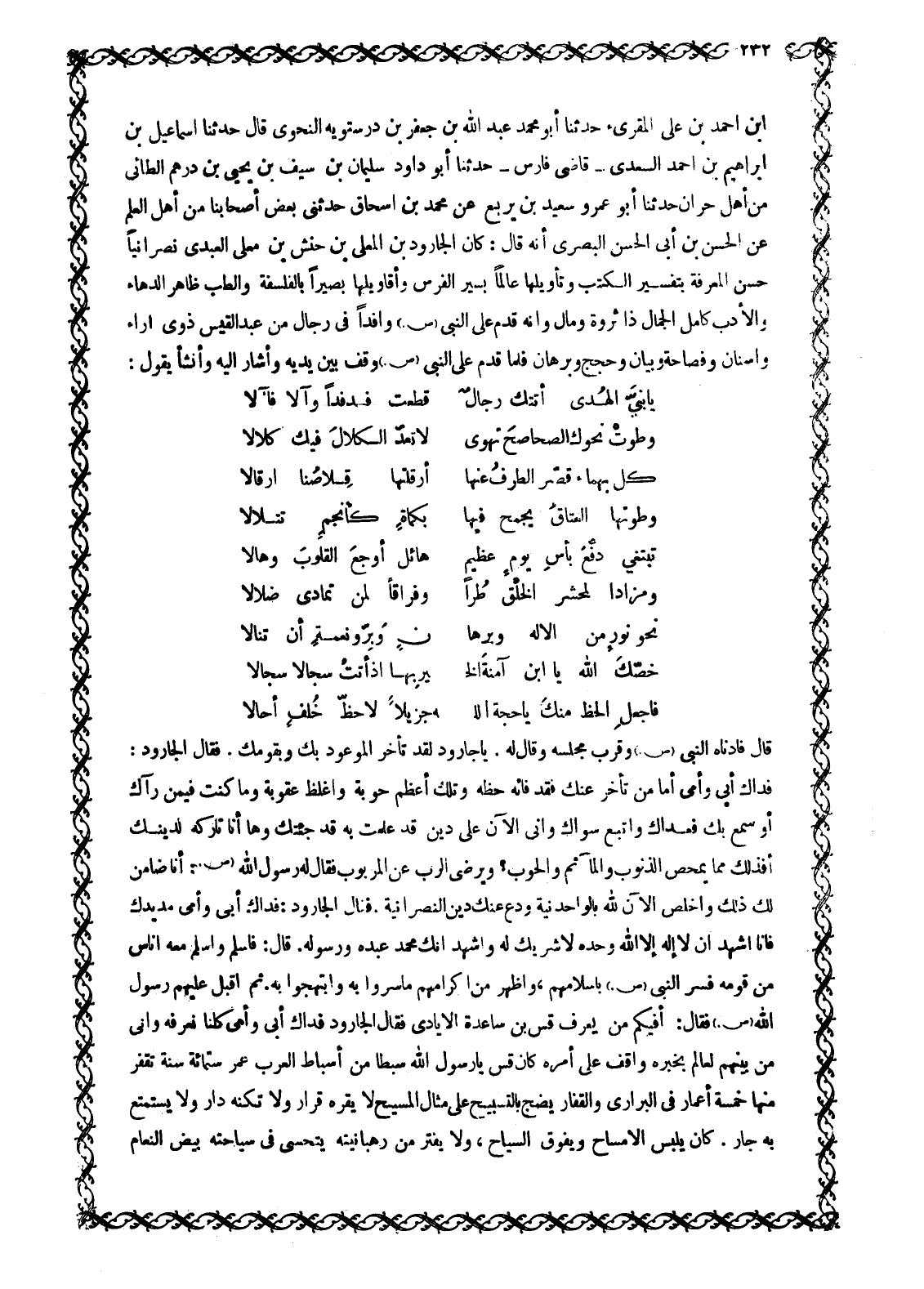 ابن أَحْمَدَ بْنِ عَلِيٍّ الْمُقْرِئُ حَدَّثَنَا أَبُو مُحَمَّدٍ عَبْدُ اللَّهِ بْنِ جَعْفَرِ بْنِ دَرَسْتَوَيْهِ النَّحْوِيُّ قَالَ حَدَّثَنَا إِسْمَاعِيلُ بْنُ إِبْرَاهِيمَ بْنِ أَحْمَدَ السَّعْدِيُّ- قَاضِي فَارِسَ- حَدَّثَنَا أَبُو دَاوُدَ سُلَيْمَانُ بْنُ سَيْفِ بْنِ يَحْيَى بْنِ دِرْهَمٍ الطَّائِيُّ مِنْ أَهْلِ حَرَّانَ حَدَّثَنَا أَبُو عَمْرٍو سَعِيدُ بن يربع عَنْ مُحَمَّدِ بْنِ إِسْحَاقَ حَدَّثَنِي بَعْضُ أَصْحَابِنَا مِنْ أَهْلِ الْعِلْمِ عَنِ الْحَسَنِ بْنِ أَبِي الْحَسَنِ الْبَصْرِيِّ أَنَّهُ قَالَ: كَانَ الْجَارُودُ بْنُ الْمُعَلَّى بْنِ حَنَشِ بْنِ مُعَلَّى الْعَبْدِيُّ نَصْرَانِيًّا حَسَنَ الْمَعْرِفَةِ بِتَفْسِيرِ الْكُتُبِ وَتَأْوِيلِهَا عَالِمًا بِسِيَرِ الْفُرْسِ وَأَقَاوِيلِهَا بَصِيرًا بِالْفَلْسَفَةِ وَالطِّبِّ ظَاهِرَ الدَّهَاءِ وَالْأَدَبِ كَامِلَ الْجَمَالِ ذَا ثَرْوَةٍ وَمَالٍ وَإِنَّهُ قَدِمَ عَلَى النَّبِيِّ صَلَّى اللَّهُ عَلَيْهِ وَسَلَّمَ وَافِدًا فِي رِجَالٍ مِنْ عَبْدِ الْقَيْسِ ذَوِي آرَاءٍ وَأَسْنَانٍ وَفَصَاحَةٍ وَبَيَانٍ وَحُجَجٍ وَبُرْهَانٍ فَلَمَّا قَدِمَ عَلَى النَّبِيِّ صَلَّى اللَّهُ عَلَيْهِ وَسَلَّمَ وَقَفَ بَيْنَ يَدَيْهِ وَأَشَارَ إِلَيْهِ وَأَنْشَأَ يَقُولُ: