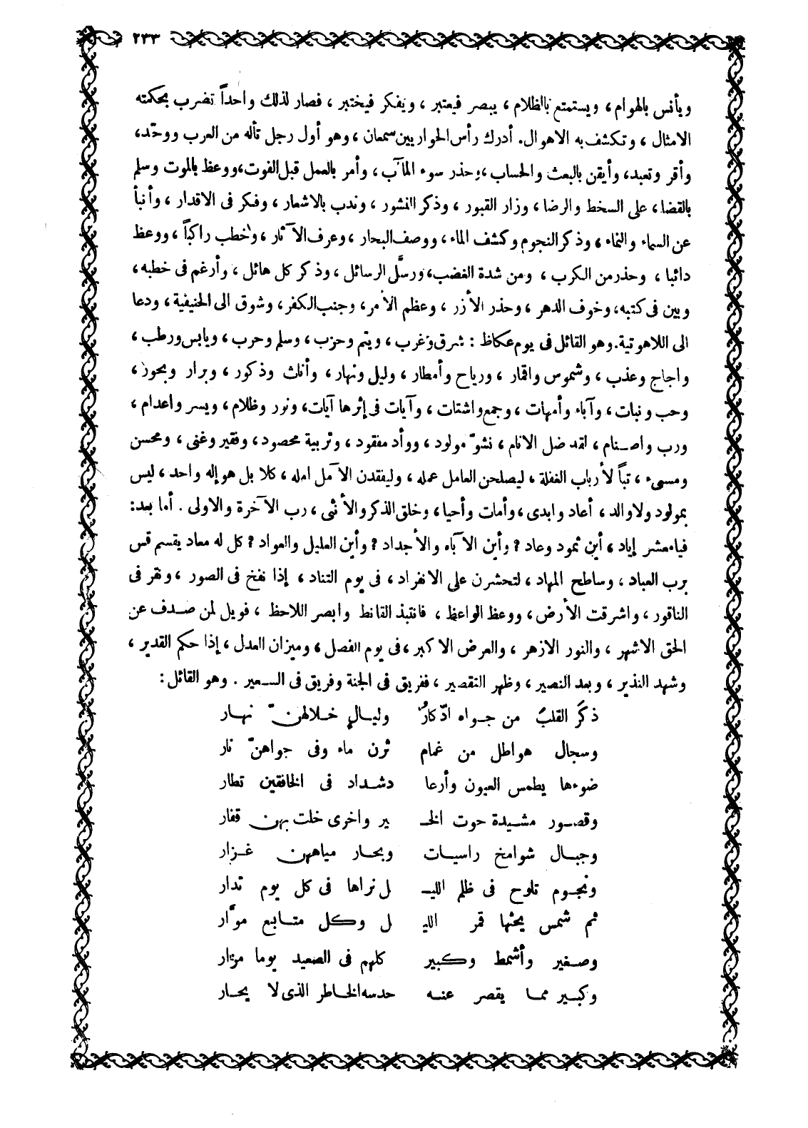 وَيَأْنَسُ بِالْهَوَامِّ، وَيَسْتَمْتِعُ بِالظَّلَامِ، يُبْصِرُ فَيَعْتَبِرُ، وَيُفَكِّرُ فيختبر، فَصَارَ لِذَلِكَ وَاحِدًا تُضْرَبُ بِحِكْمَتِهِ الْأَمْثَالُ، وَتُكْشَفُ بِهِ الْأَهْوَالُ. أَدْرَكَ رَأْسَ الْحَوَارِيِّينَ سَمْعَانَ، وَهُوَ أَوَّلُ رَجُلٍ تَأَلَّهَ مِنَ الَعَرَبِ وَوَحَّدَ، وَأَقَرَّ وَتَعَبَّدَ، وَأَيْقَنَ بِالْبَعْثِ وَالْحِسَابِ، وَحَذِرَ سُوءَ الْمَآبِ، وَأَمَرَ بِالْعَمَلِ قَبْلَ الْفَوْتِ، وَوَعَظَ بِالْمَوْتِ وَسَلَّمَ بالْقَضَا، عَلَى السُّخْطِ وَالرِّضَا، وَزَارَ الْقُبُورَ، وَذَكَرَ النُّشُورَ، وَنَدَبَ بِالْأَشْعَارِ، وَفَكَّرَ فِي الْأَقْدَارِ، وَأَنْبَأَ عَنِ السَّمَاءِ وَالنَّمَاءِ، وَذَكَرَ النُّجُومَ وَكَشَفَ الْمَاءَ، وَوَصَفَ الْبِحَارَ، وَعَرَفَ الْآثَارَ، وَخَطَبَ رَاكِبًا، وَوَعَظَ دَائِبًا، وَحَذَّرَ مِنَ الَكَرْبِ، وَمِنْ شَدَّةِ الْغَضَبِ، وَرَسَّلَ الرَّسَائِلَ، وَذَكَرَ كُلَّ هَائِلٍ، وَأَرْغَمَ فِي خُطَبِهِ، وَبَيَّنَ فِي كُتُبِهِ، وَخَوَّفَ الدَّهْرَ، وَحَذَّرَ الْأَزْرَ، وَعَظَّمَ الْأَمْرَ، وَجَنَّبَ الْكُفْرَ، وَشَوَّقَ إِلَى الْحَنِيفِيَّةِ، وَدَعَا إِلَى اللَّاهُوتِيَّةِ. وَهُوَ الْقَائِلُ فِي يَوْمِ عُكَاظٍ: شَرْقٌ وَغَرْبٌ، وَيُتْمٌ وَحِزْبٌ، وَسِلْمٌ وَحَرْبٌ، وَيَابِسٌ وَرَطْبٌ، وَأُجَاجٌ وَعَذْبٌ، وَشُمُوسٌ وَأَقْمَارٌ، ورياح وأمطار، وليل ونهار، وأناث وذكور، وبرار وبحور، وَحَبٌّ وَنَبَاتٌ، وَآبَاءٌ وَأُمَّهَاتٌ، وَجَمْعٌ وَأَشْتَاتٌ، وَآيَاتٌ فِي إِثْرِهَا آيَاتٌ، وَنُورٌ وَظَلَامٌ، وَيُسْرٌ وَإِعْدَامٌ، ورب وأصنام، لقد ضل الأنام، نشوّ مَوْلُودٍ، وَوَأْدُ مَفْقُودٍ، وَتَرْبِيَةُ مَحْصُودٍ، وَفَقِيرٌ وَغَنِيٌّ، وَمُحْسِنٌ وَمُسِيءٌ، تَبًّا لِأَرْبَابِ الْغَفْلَةِ، لَيُصْلِحَنَّ الْعَامِلُ عَمَلَهُ، وَلَيَفْقِدَنَّ الْآمِلُ أَمَلَهُ، كَلَّا بَلْ هُوَ إِلَهٌ وَاحِدٌ، لَيْسَ بِمَوْلُودٍ وَلَا وَالِدٍ، أَعَادَ وَأَبْدَى، وَأَمَاتَ وَأَحْيَا، وَخَلَقَ الذَّكَرَ وَالْأُنْثَى، رَبُّ الْآخِرَةِ وَالْأُولَى. أَمَّا بَعْدُ: