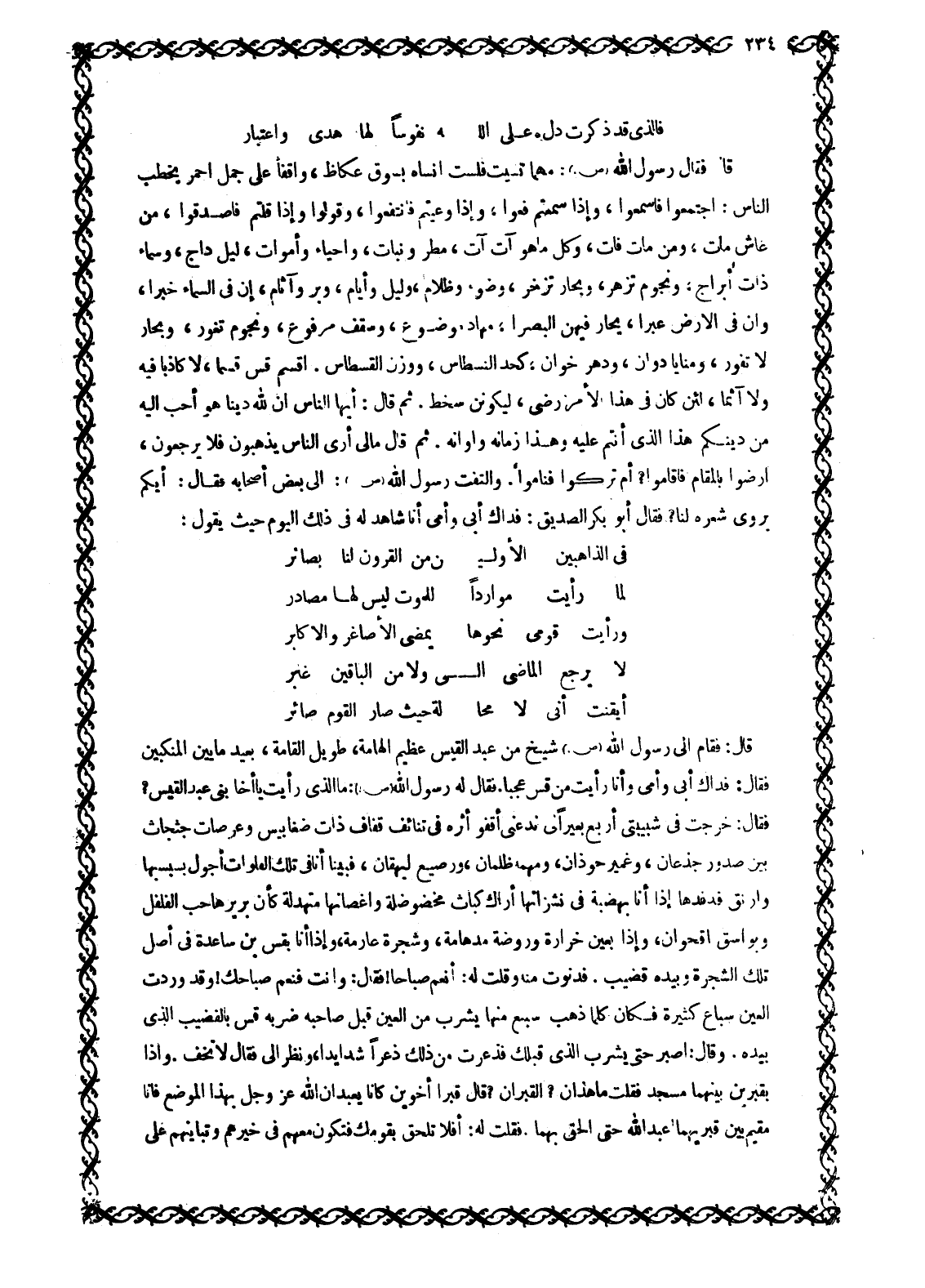 قَالَ فَقَالَ رَسُولُ اللَّهِ صَلَّى اللَّهُ عَلَيْهِ وَسَلَّمَ: مَهْمَا نَسِيتُ فَلَسْتُ أَنْسَاهُ بِسُوقِ عُكَاظٍ، وَاقِفًا عَلَى جَمَلٍ أَحْمَرَ يَخْطُبُ النَّاسَ: اجْتَمِعُوا فَاسْمَعُوا، وَإِذَا سَمِعْتُمْ فَعُوا، وَإِذَا وَعَيْتُمْ فَانْتَفِعُوا، وَقُولُوا وَإِذَا قُلْتُمْ فَاصْدُقُوا، مَنْ عَاشَ مَاتَ، وَمَنْ مَاتَ فَاتَ، وَكُلُّ مَا هُوَ آتٍ آتٍ، مَطَرٌ وَنَبَاتٌ، وَأَحْيَاءٌ وَأَمْوَاتٌ، لَيْلٌ دَاجٍ، وَسَمَاءٌ ذَاتُ أَبْرَاجٍ، وَنُجُومٌ تَزْهَرُ، وَبِحَارُ تَزْخَرُ، وَضَوْءٌ وَظَلَامٌ، وَلَيْلٌ وَأَيَّامٌ، وَبِرٌّ وَآثَامٌ، إِنَّ فِي السَّمَاءِ خَبَرًا، وَإِنَّ فِي الْأَرْضِ عِبَرًا، يَحَارُ فِيهِنَّ الْبُصَرَا، مِهَادٌ مَوْضُوعٌ، وَسَقْفٌ مَرْفُوعٌ، وَنُجُومٌ تَغُورُ، وَبِحَارٌ لَا تَفُورُ، وَمَنَايَا دَوَانٍ، وَدَهْرٌ خَوَّانٌ، كَحَدِّ النِّسْطَاسِ، وَوَزْنِ الْقِسْطَاسِ. أَقْسَمَ قُسٌّ قَسَمًا، لَا كَاذِبًا فِيهِ وَلَا آثِمًا، لَئِنْ كَانَ فِي هَذَا الْأَمْرِ رِضًى، لَيَكُونَنَّ سَخَطٌ. ثُمَّ قَالَ: أَيُّهَا النَّاسُ إِنَّ للَّه دِينًا هُوَ أَحَبُّ إِلَيْهِ مِنْ دِينِكُمْ هَذَا الَّذِي أَنْتُمْ عَلَيْهِ وَهَذَا زَمَانُهُ وَأَوَانُهُ. ثُمَّ قَالَ مَا لِي أَرَى النَّاسَ يَذْهَبُونَ فَلَا يَرْجِعُونَ، أَرَضُوا بِالْمُقَامِ فَأَقَامُوا؟ أَمْ تُرِكُوا فَنَامُوا. وَالْتَفَتَ رَسُولُ اللَّهِ صَلَّى اللَّهُ عَلَيْهِ وَسَلَّمَ: إِلَى بَعْضِ أَصْحَابِهِ فَقَالَ: أَيُّكُمْ يَرْوِي شِعْرَهُ لَنَا؟ فَقَالَ أَبُو بَكْرٍ الصِّدِّيقُ: فِدَاكَ أَبِي وَأُمِّي أَنَا شَاهِدٌ لَهُ فِي ذَلِكَ الْيَوْمِ حَيْثُ يَقُولُ: