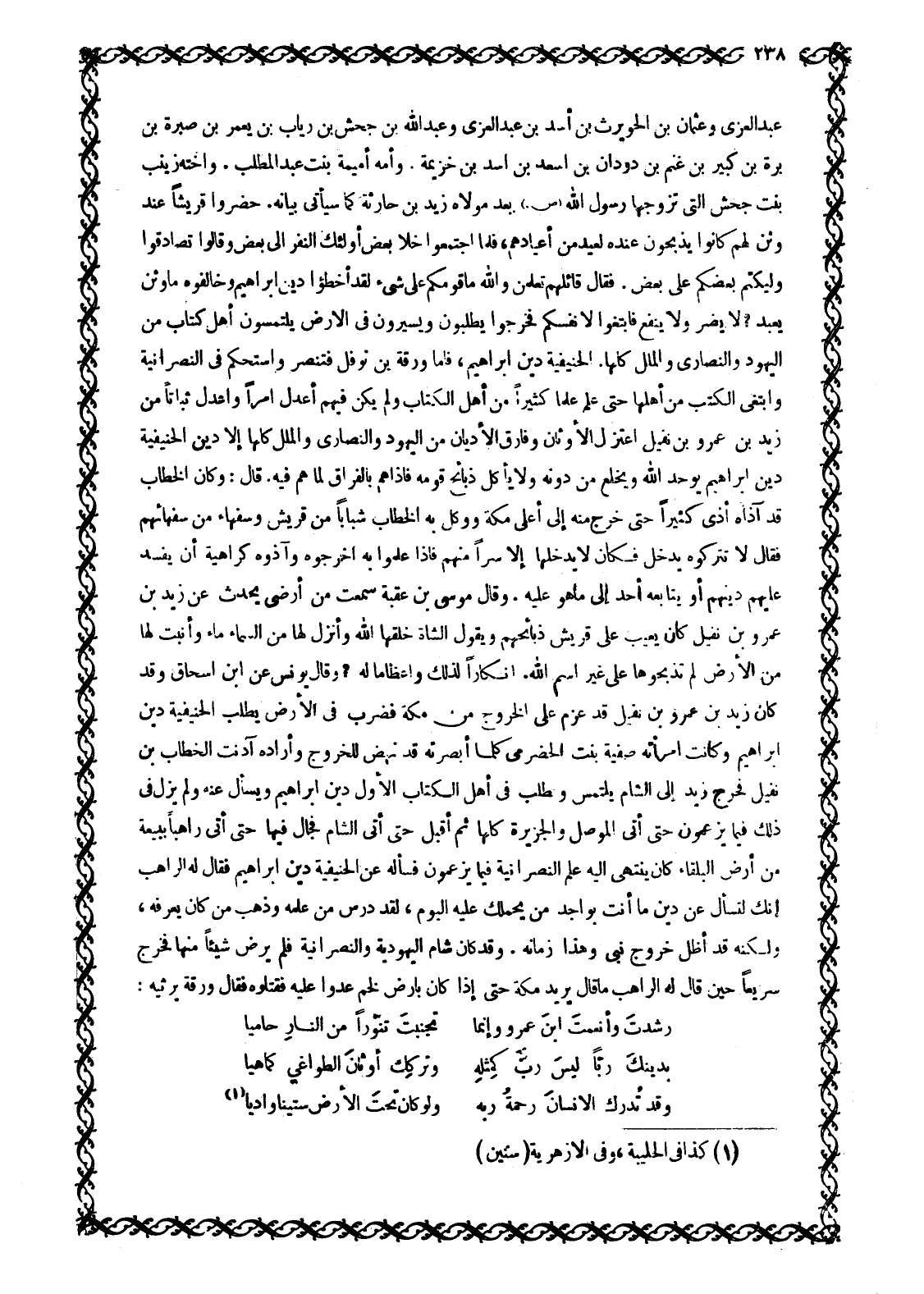 عَبْدِ الْعُزَّى وَعُثْمَانُ بْنُ الْحُوَيْرِثِ بْنِ أَسَدِ بن عبد العزى وعبد اللَّهِ بْنُ جَحْشِ بْنِ رِيِابِ بْنِ يَعْمَرَ بن صبرة بن برة بْنِ كَبِيرِ بْنِ غَنْمِ بْنِ دُودَانَ بْنِ أسعد بْنِ أَسَدِ بْنِ خُزَيْمَةَ. وَأُمُّهُ أُمَيْمَةُ بِنْتُ عَبْدِ الْمُطَّلِبِ. وَأُخْتُهُ زَيْنَبُ بِنْتُ جَحْشٍ الَّتِي تَزَوَّجَهَا رَسُولُ اللَّهِ صَلَّى اللَّهُ عَلَيْهِ وَسَلَّمَ بَعْدَ مَوْلَاهُ زَيْدِ بْنِ حَارِثَةَ كَمَا سَيَأْتِي بَيَانُهُ. حَضَرُوا قُرَيْشًا عِنْدَ وَثَنٍ لَهُمْ كَانُوا يَذْبَحُونَ عِنْدَهُ لِعِيدٍ مِنْ أَعْيَادِهِمْ، فَلَمَّا اجْتَمَعُوا خَلَا بَعْضُ أُولَئِكَ النَّفَرِ إِلَى بَعْضٍ وَقَالُوا تَصَادَقُوا وَلْيَكْتُمْ بَعْضُكُمْ عَلَى بَعْضٍ. فَقَالَ قَائِلُهُمْ تَعْلَمُنَّ وَاللَّهِ مَا قَوْمُكُمْ عَلَى شَيْءٍ لَقَدْ أَخْطَئُوا دِينَ إِبْرَاهِيمَ وَخَالَفُوهُ مَا وَثَنٌ يُعْبَدُ؟ لَا يَضُرُّ وَلَا يَنْفَعُ فَابْتَغُوا لِأَنْفُسِكُمْ فَخَرَجُوا يَطْلُبُونَ وَيَسِيرُونَ فِي الْأَرْضِ يَلْتَمِسُونَ أَهْلَ كِتَابٍ من اليهود والنصارى والملل كلها. الْحَنِيفِيَّةَ دِينَ إِبْرَاهِيمَ، فَأَمَّا وَرَقَةُ بْنُ نَوْفَلٍ فَتَنَصَّرَ وَاسْتَحْكَمَ فِي النَّصْرَانِيَّةِ وَابْتَغَى الْكُتُبَ مِنْ أَهْلِهَا حَتَّى عَلِمَ عِلْمًا كَثِيرًا مِنْ أَهْلِ الْكِتَابِ وَلَمْ يَكُنْ فِيهِمْ أَعْدَلُ أَمْرًا وَأَعْدَلُ ثباتا مِنْ زَيْدِ بْنِ عَمْرِو بْنِ نُفَيْلٍ اعْتَزَلَ الْأَوْثَانَ وَفَارَقَ الْأَدْيَانَ مِنَ الْيَهُودِ وَالنَّصَارَى وَالْمِلَلِ كُلِّهَا إِلَّا دِينَ الْحَنِيفِيَّةِ دِينَ إِبْرَاهِيمَ يُوَحِّدُ اللَّهَ وَيَخْلَعُ مَنْ دُونَهُ وَلَا يَأْكُلُ ذَبَائِحَ قومه فإذا هم بِالْفِرَاقِ لِمَا هُمْ فِيهِ. قَالَ: وَكَانَ الْخَطَّابُ قَدْ آذَاهُ أَذًى كَثِيرًا حَتَّى خَرَجَ مِنْهُ إِلَى أَعْلَى مَكَّةَ وَوَكَّلَ بِهِ الْخَطَّابُ شَبَابًا مِنْ قُرَيْشٍ وَسُفَهَاءَ مِنْ سُفَهَائِهِمْ فَقَالَ لَا تتركوه يدخل فَكَانَ لَا يَدْخُلُهَا إِلَّا سِرًّا مِنْهُمْ فَإِذَا عَلِمُوا بِهِ أَخْرَجُوهُ وَآذَوْهُ كَرَاهِيَةَ أَنْ يُفْسِدَ عَلَيْهِمْ دِينَهُمْ أَوْ يُتَابِعَهُ أَحَدٌ إِلَى مَا هُوَ عَلَيْهِ. وَقَالَ مُوسَى بْنُ عُقْبَةَ سَمِعْتُ مَنْ أَرْضَى يُحَدِّثُ عَنْ زَيْدِ بْنِ عَمْرِو بْنِ نُفَيْلٍ كَانَ يَعِيبُ عَلَى قُرَيْشٍ ذَبَائِحَهُمْ وَيَقُولُ الشَّاةُ خَلَقَهَا اللَّهُ وَأَنْزَلَ لَهَا مِنَ الَسَّمَاءِ مَاءً وَأَنْبَتَ لَهَا مِنَ الَأَرْضِ لِمَ تَذْبَحُوهَا عَلَى غَيْرِ اسْمِ اللَّهِ. إِنْكَارًا لِذَلِكَ وَإِعْظَامًا لَهُ؟ وَقَالَ يُونُسُ عَنِ ابْنِ إِسْحَاقَ وَقَدْ كَانَ زَيْدُ بْنُ عَمْرِو بْنِ نُفَيْلٍ قد عزم على الخروج من مكة فضرب فِي الْأَرْضِ يَطْلُبُ الْحَنِيفِيَّةَ دِينَ إِبْرَاهِيمَ وَكَانَتِ امْرَأَتُهُ صَفِيَّةُ بِنْتُ الْحَضْرَمِيِّ كُلَّمَا أَبْصَرَتْهُ قَدْ نَهَضَ لِلْخُرُوجِ وَأَرَادَهُ آذَنَتِ الْخَطَّابَ بْنَ نُفَيْلٍ فَخَرَجَ زَيْدٌ إِلَى الشَّامِ يَلْتَمِسُ وَيَطْلُبُ فِي أَهْلِ الْكِتَابِ الْأَوَّلِ دِينَ إِبْرَاهِيمَ وَيَسْأَلُ عَنْهُ وَلَمْ يَزَلْ فِي ذَلِكَ فِيمَا يَزْعُمُونَ حَتَّى أَتَى الْمَوْصِلَ وَالْجَزِيرَةَ كُلَّهَا ثُمَّ أَقْبَلَ حَتَّى أَتَى الشَّامَ فَجَالَ فِيهَا حَتَّى أَتَى رَاهِبًا بِبَيْعَةٍ مِنْ أَرْضِ الْبَلْقَاءِ كَانَ يَنْتَهِي إِلَيْهِ عِلْمُ النَّصْرَانِيَّةِ فِيمَا يَزْعُمُونَ فَسَأَلَهُ عَنِ الْحَنِيفِيَّةِ دِينِ إِبْرَاهِيمَ فَقَالَ لَهُ الرَّاهِبُ إِنَّكَ لَتَسْأَلُ عَنْ دِينٍ مَا أَنْتَ بِوَاجِدٍ مَنْ يَحْمِلُكُ عَلَيْهِ الْيَوْمَ، لَقَدْ دَرَسَ مِنْ عَلِمَهُ وَذَهَبَ من كان يعرفه، ولكنه قد أظل خُرُوجُ نَ