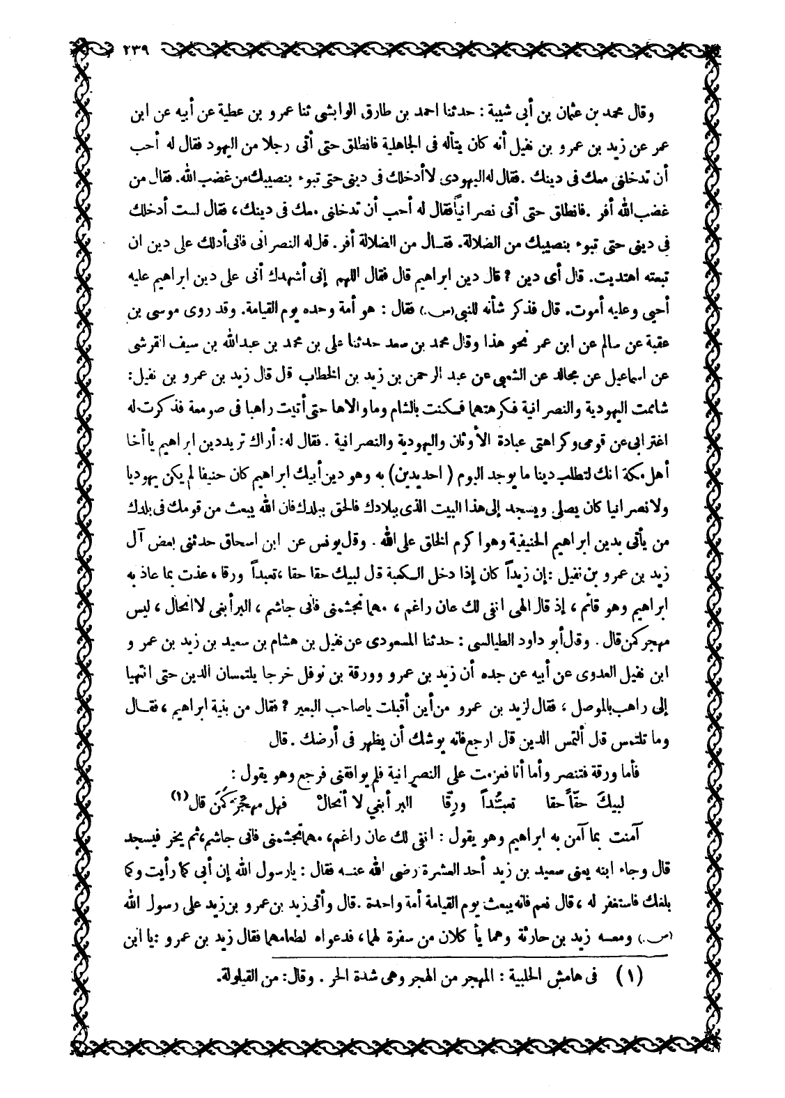 وَقَالَ مُحَمَّدُ بْنُ عُثْمَانَ بْنِ أَبِي شَيْبَةَ: حَدَّثَنَا أَحْمَدُ بْنُ طَارِقٍ الْوَابِشِيُّ ثَنَا عَمْرُو بْنُ عَطِيَّةَ عَنْ أَبِيهِ عَنِ ابْنِ عُمَرَ عَنْ زَيْدِ بْنِ عَمْرِو بْنِ نُفَيْلٍ أَنَّهُ كَانَ يَتَأَلَّهُ فِي الْجَاهِلِيَّةِ فَانْطَلَقَ حَتَّى أَتَى رَجُلًا مِنَ الْيَهُودِ فَقَالَ لَهُ أُحِبُّ أَنْ تُدْخِلَنِي مَعَكَ فِي دِينِكَ. فَقَالَ لَهُ الْيَهُودِيُّ لَا أُدْخِلُكَ فِي دِينِي حَتَّى تَبُوءَ بِنَصِيبِكَ مِنْ غَضَبِ اللَّهِ. فَقَالَ مِنْ غَضَبِ اللَّهِ أَفِرُّ. فَانْطَلَقَ حَتَّى أَتَى نَصْرَانِيًّا فَقَالَ لَهُ أُحِبُّ أَنْ تُدْخِلَنِي مَعَكَ فِي دِينِكَ، فَقَالَ لَسْتُ أُدْخِلُكَ فِي دِينِي حَتَّى تَبُوءَ بِنَصِيبِكَ مِنَ الَضَّلَالَةِ. فَقَالَ مِنَ الَضَّلَالَةِ أَفِرُّ. قَالَ لَهُ النَّصْرَانِيُّ فَإِنِّي أَدُلُّكَ عَلَى دِينٍ إِنِ تبعته اهْتَدَيْتَ. قَالَ أَيُّ دِينٍ؟ قَالَ دِينُ إِبْرَاهِيمَ قَالَ فَقَالَ اللَّهمّ إِنِّي أُشْهِدُكَ أَنِّي عَلَى دين إبراهيم عليه أحيى وَعَلَيْهِ أَمُوتُ. قَالَ فَذُكِرَ شَأْنُهُ لِلنَّبِيِّ صَلَّى اللَّهُ عَلَيْهِ وَسَلَّمَ فَقَالَ: هُوَ أُمَّةٌ وَحْدَهُ يَوْمَ الْقِيَامَةِ. وَقَدْ رَوَى مُوسَى بْنِ عُقْبَةَ عَنْ سَالِمٍ عَنِ ابْنِ عُمَرَ نَحْوَ هَذَا وَقَالَ مُحَمَّدُ بْنُ سَعْدٍ حَدَّثَنَا عَلِيُّ بْنُ مُحَمَّدِ بْنِ عَبْدِ اللَّهِ بْنِ سَيْفٍ الْقُرَشِيُّ عَنْ إِسْمَاعِيلَ عَنْ مُجَالِدٍ عَنِ الشَّعْبِيِّ عَنْ عَبْدِ الرَّحْمَنِ بْنِ زَيْدِ بْنِ الْخَطَّابِ قَالَ قَالَ زَيْدُ بْنُ عَمْرِو بْنِ نُفَيْلٍ: