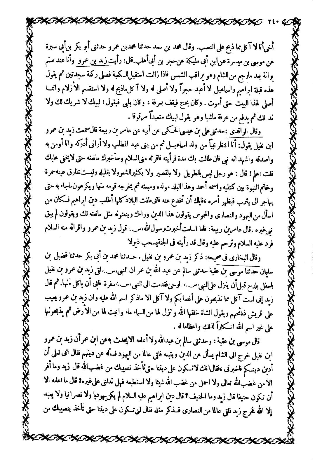 وَقَالَ الْوَاقِدِيُّ: حَدَّثَنِي عَلِيُّ بْنُ عِيسَى الْحَكَمِيُّ عَنْ أَبِيهِ عَنْ عَامِرِ بْنِ رَبِيعَةَ قَالَ سَمِعْتُ زيد بن عمرو ابن نُفَيْلٍ يَقُولُ: أَنَا أَنْتَظِرُ نَبِيًّا مِنْ وَلَدِ إِسْمَاعِيلَ ثُمَّ مِنْ بَنِي عَبْدِ الْمُطَّلِبِ وَلَا أَرَانِي أُدْرِكُهُ وَأَنَا أُومِنُ بِهِ وَأُصَدِّقُهُ وَأَشْهَدُ أَنَّهُ نَبِيٌّ فَإِنْ طَالَتْ بِكَ مُدَّةٌ فَرَأَيْتَهُ فَأَقْرِئْهُ مِنِّي السَّلَامَ وَسَأُخْبِرُكَ مَا نَعْتُهُ حَتَّى لَا يَخْفَى عَلَيْكَ قُلْتُ: هَلُمَّ! قَالَ: هُوَ رَجُلٌ لَيْسَ بِالطَّوِيلِ وَلَا بِالْقَصِيرِ وَلَا بِكَثِيرِ الشعر. لا بِقَلِيلِهِ وَلَيْسَتْ تُفَارِقُ عَيْنَهُ حُمْرَةٌ وَخَاتَمُ النُّبُوَّةِ بَيْنَ كَتِفَيْهِ وَاسْمُهُ أَحْمَدُ وَهَذَا الْبَلَدُ مَوْلِدُهُ وَمَبْعَثُهُ ثُمَّ يُخْرِجُهُ قَوْمُهُ مِنْهَا وَيَكْرَهُونَ مَا جَاءَ بِهِ حَتَّى يُهَاجِرَ إِلَى يَثْرِبَ فَيَظْهَرُ أَمْرُهُ، فَإِيَّاكَ أَنْ تُخْدَعَ عَنْهُ فَإِنِّي طُفْتُ الْبِلَادَ كُلَّهَا أَطْلُبُ دِينَ إِبْرَاهِيمَ فَكَانَ مَنْ أَسْأَلُ مِنَ الْيَهُودِ وَالنَّصَارَى وَالْمَجُوسِ يَقُولُونَ هَذَا الدِّينُ وَرَاءَكَ وَيَنْعَتُونَهُ مِثْلَ مَا نَعَتُّهُ لَكَ وَيَقُولُونَ لَمْ يَبْقَ نَبِيٌّ غَيْرُهُ. قَالَ عَامِرُ بْنُ رَبِيعَةَ: فَلَمَّا أَسْلَمْتُ أَخْبَرْتُ رَسُولَ اللَّهِ صَلَّى اللَّهُ عَلَيْهِ وَسَلَّمَ قَوْلَ زَيْدِ بْنِ عمرو واقرائه مِنْهُ السَّلَامَ فَرَدَّ عَلَيْهِ السَّلَامَ وَتَرَحَّمَ عَلَيْهِ وَقَالَ قَدْ رَأَيْتُهُ فِي الْجَنَّةِ يَسْحَبُ ذُيُولًا وَقَالَ الْبُخَارِيُّ فِي صَحِيحِهِ: ذِكْرُ زَيْدِ بْنِ عَمْرِو بْنِ نُفَيْلٍ. حَدَّثَنَا مُحَمَّدُ بْنُ أَبِي بَكْرٍ حَدَّثَنَا فُضَيْلُ بْنُ سُلَيْمَانَ حَدَّثَنَا مُوسَى بْنُ عُقْبَةَ حَدَّثَنِي سَالِمٌ عَنْ عَبْدِ اللَّهِ بْنِ عُمَرَ أَنَّ النَّبِيَّ صَلَّى اللَّهُ عَلَيْهِ وَسَلَّمَ لَقِيَ زَيْدَ بْنَ عَمْرِو بْنِ نُفَيْلٍ بِأَسْفَلِ بَلْدَحَ قَبْلَ أَنْ يَنْزِلَ عَلَى النَّبِيِّ صَلَّى اللَّهُ عَلَيْهِ وَسَلَّمَ الْوَحْيُ فَقُدِّمَتْ إِلَى النَّبِيِّ صَلَّى اللَّهُ عَلَيْهِ وَسَلَّمَ سُفْرَةٌ فَأَبَى أَنْ يَأْكُلَ مِنْهَا. ثُمَّ قَالَ زَيْدٌ إِنِّي لَسْتُ آكُلَ مِمَّا تَذْبَحُونَ عَلَى أَنَصَابِكُمْ وَلَا آكُلُ إِلَّا مَا ذُكِرَ اسْمُ اللَّهِ عَلَيْهِ وان زيد بن عمرو يَعِيبُ عَلَى قُرَيْشٍ ذَبَائِحَهُمْ وَيَقُولُ الشَّاةُ خَلَقَهَا اللَّهُ وَأَنْزَلَ لَهَا مِنَ الَسَّمَاءِ مَاءً وَأَنْبَتَ لَهَا مِنَ الَأَرْضِ ثُمَّ يَذْبَحُونَهَا عَلَى غَيْرِ اسْمِ اللَّهِ إِنْكَارًا لِذَلِكَ وَإِعْظَامًا لَهُ.