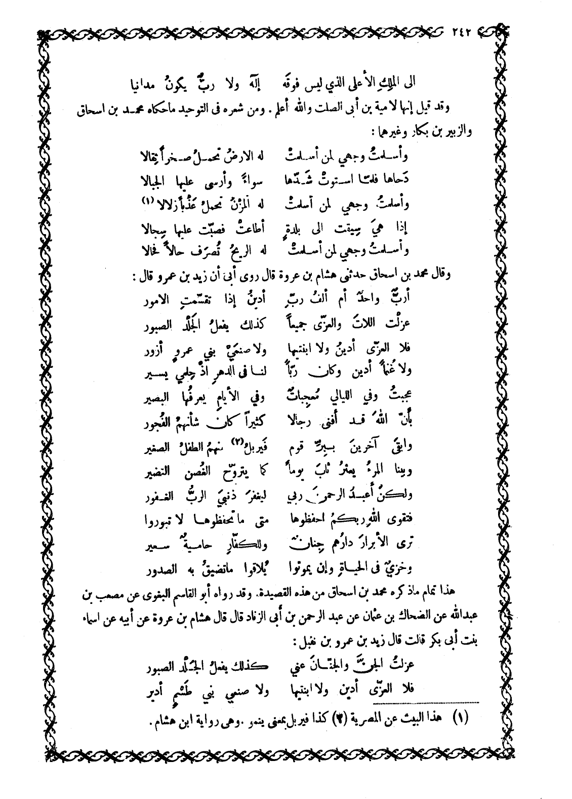 وَقَدْ قِيلَ إِنَّهَا لِأُمَيَّةَ بْنِ أَبِي الصَّلْتِ وَاللَّهُ أَعْلَمُ. وَمِنْ شِعْرِهِ فِي التَّوْحِيدِ مَا حَكَاهُ مُحَمَّدُ بْنُ إِسْحَاقَ وَالزُّبَيْرُ بْنُ بَكَّارٍ وَغَيْرُهُمَا: