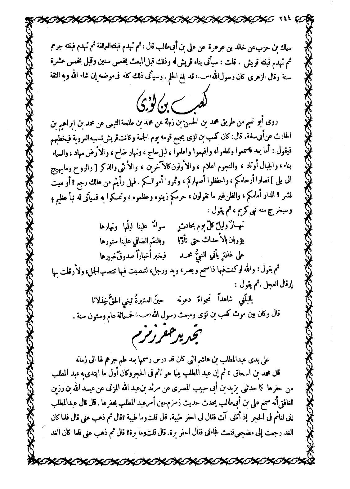 عَلَى يَدَيْ عَبْدِ الْمُطَّلِبِ بْنِ هَاشِمٍ الَّتِي كَانَ قَدْ دَرَسَ رَسْمُهَا بَعْدَ طَمِّ جُرْهُمٍ لَهَا إِلَى زَمَانِهِ قَالَ مُحَمَّدُ بْنُ إِسْحَاقَ: ثُمَّ إِنَّ عَبْدَ الْمُطَّلِبِ بَيْنَمَا هُوَ نائم في الحجر وكان أول ما ابتدى بِهِ عَبْدُ الْمُطَّلِبِ مِنْ حَفْرِهَا كَمَا حَدَّثَنِي يَزِيدُ بْنُ أَبِي حَبِيبٍ الْمِصْرِيُّ عَنْ مَرْثَدِ بْنِ عَبْدِ اللَّهِ الْمُزَنِيِّ عَنْ عَبْدِ اللَّهِ بن رزين الْغَافِقِيِّ أَنَّهُ سَمِعَ عَلِيَّ بْنَ أَبِي طَالِبٍ يُحَدِّثُ حَدِيثَ زَمْزَمَ حِينَ أُمِرَ عَبْدُ الْمُطَّلِبِ بِحَفْرِهَا. قَالَ قَالَ عَبْدُ الْمُطَّلِبِ إِنِّي لَنَائِمٌ فِي الْحِجْرِ إِذْ أَتَانِي آتٍ فَقَالَ لِي احْفِرْ طِيبَةَ. قَالَ قُلْتُ وَمَا طِيبَةُ؟ قَالَ ثم ذهب عنى قال فَلَمَّا كَانَ الْغَدُ رَجَعْتُ إِلَى مَضْجَعِي فَنِمْتُ فَجَاءَنِي فَقَالَ احْفِرْ بَرَّةَ. قَالَ قُلْتُ وَمَا بَرَّةُ؟ قَالَ ثُمَّ ذَهَبَ عَنِّي فَلَمَّا كَانَ الغد