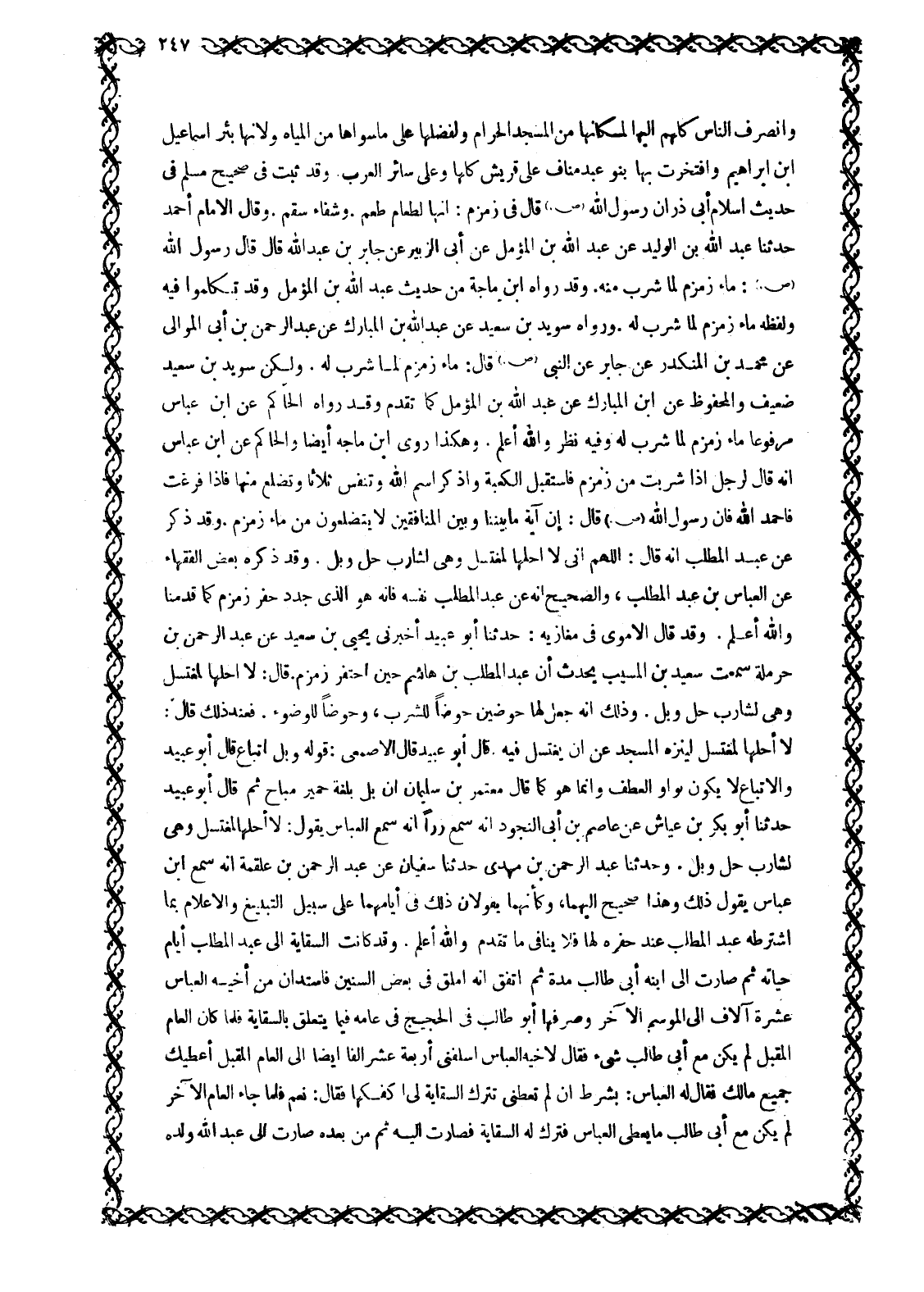 لَا أُحِلُّهَا لِمُغْتَسِلٍ لِيُنَزِّهَ الْمَسْجِدَ عَنْ أَنْ يُغْتَسَلَ فِيهِ. قَالَ أَبُو عُبَيْدٍ قَالَ الْأَصْمَعِيُّ: قَوْلُهُ وَبِلٌّ إِتْبَاعٌ قَالَ أَبُو عُبَيْدٍ وَالْإِتْبَاعُ لَا يَكُونُ بِوَاوِ الْعَطْفِ وَإِنَّمَا هُوَ كَمَا قَالَ مُعْتَمِرُ بْنُ سُلَيْمَانَ إِنَّ بِلَّ بِلُغَةِ حِمْيَرَ مُبَاحٌ ثُمَّ قَالَ أَبُو عُبَيْدٍ حَدَّثَنَا أَبُو بَكْرِ بْنُ عَيَّاشٍ عَنْ عَاصِمِ بْنِ أَبِي النجود انه سمع زرا أَنَّهُ سَمِعَ الْعَبَّاسَ يَقُولُ: لَا أُحِلُّهَا لِمُغْتَسِلٍ وَهِيَ لِشَارِبٍ حِلٌّ وَبِلٌّ. وَحَدَّثَنَا عَبْدُ الرَّحْمَنِ بْنُ مَهْدِيٍّ حَدَّثَنَا سُفْيَانُ عَنْ عَبْدِ الرَّحْمَنِ بْنِ عَلْقَمَةَ أَنَّهُ سَمِعَ ابْنَ عَبَّاسٍ يَقُولُ ذلك وهذا صحيح اليهما، وكأنهما يَقُولَانِ ذَلِكَ فِي أَيَّامِهِمَا عَلَى سَبِيلِ التَّبْلِيغِ وَالْإِعْلَامِ بِمَا اشْتَرَطَهُ عَبْدُ الْمُطَّلِبِ عِنْدَ حَفْرِهِ لَهَا فَلَا يُنَافِي مَا تَقَدَّمَ وَاللَّهُ أَعْلَمُ. وَقَدْ كَانَتِ السِّقَايَةُ إِلَى عَبْدِ الْمُطَّلِبِ أَيَّامَ حَيَاتِهِ ثُمَّ صَارَتْ إِلَى ابْنِهِ أَبِي طَالِبٍ مُدَّةً ثُمَّ اتُّفِقَ أَنَّهُ أَمْلَقَ فِي بَعْضِ السِّنِينَ فَاسْتَدَانَ مِنْ أَخِيهِ الْعَبَّاسِ عَشَرَةَ آلَافٍ إِلَى الْمَوْسِمِ الْآخَرِ وَصَرَفَهَا أَبُو طَالِبٍ فِي الْحَجِيجِ فِي عَامِهِ فِيمَا يَتَعَلَّقُ بِالسِّقَايَةِ فَلَمَّا كَانَ الْعَامُ الْمُقْبِلُ لَمْ يَكُنْ مَعَ أَبِي طَالِبٍ شَيْءٌ فَقَالَ لِأَخِيهِ الْعَبَّاسِ أَسْلِفْنِي أَرْبَعَةَ عَشَرَ أَلْفًا أَيْضًا إِلَى الْعَامِ الْمُقْبِلِ أُعْطِيكَ جَمِيعَ مَالِكَ فَقَالَ لَهُ الْعَبَّاسُ: بِشَرْطِ إِنْ لَمْ تُعْطِنِي تَتْرُكِ السِّقَايَةَ لِي أَكْفِكَهَا فَقَالَ: نَعَمْ فَلَمَّا جَاءَ الْعَامُ الْآخَرُ لَمْ يَكُنْ مَعَ أَبِي طَالِبٍ مَا يُعْطِي الْعَبَّاسَ فَتَرَكَ لَهُ السِّقَايَةَ فَصَارَتْ إِلَيْهِ ثُمَّ مِنْ بَعْدِهِ صَارَتْ إِلَى عَبْدِ اللَّهِ وَلَدِهِ