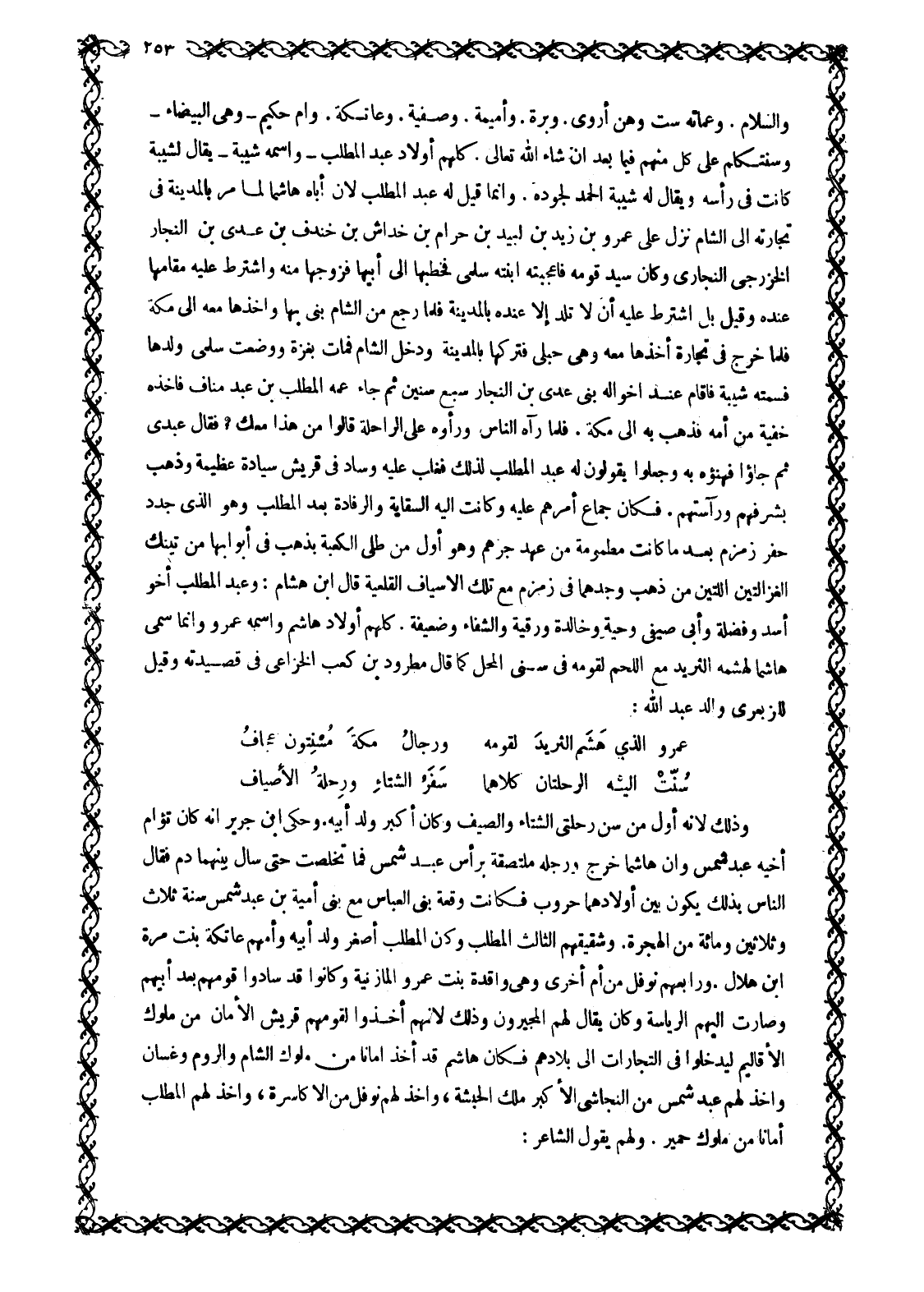 وَالسَّلَامُ. وَعَمَّاتُهُ سِتٌّ وَهُنَّ أَرْوَى. وَبَرَّةُ. وَأُمَيْمَةُ. وَصَفِيَّةُ. وَعَاتِكَةُ. وَأُمُّ حَكِيمٍ- وَهِيَ الْبَيْضَاءُ- وَسَنَتَكَلَّمُ عَلَى كُلٍّ مِنْهُمْ فِيمَا بَعْدُ إِنْ شَاءَ الله تعالى. كلهم أَوْلَادُ عَبْدِ الْمُطَّلِبِ- وَاسْمُهُ شَيْبَةُ- يُقَالَ لِشَيْبَةٍ كَانَتْ فِي رَأْسِهِ وَيُقَالَ لَهُ شَيْبَةُ الْحَمْدِ لِجُودِهِ. وَإِنَّمَا قِيلَ لَهُ عَبْدُ الْمُطَّلِبِ لِأَنَّ أَبَاهُ هَاشِمًا لَمَّا مَرَّ بِالْمَدِينَةِ فِي تِجَارَتِهِ إِلَى الشَّامِ نَزَلَ عَلَى عَمْرِو بْنِ زَيْدِ بْنِ لَبِيدِ بْنِ حَرَامِ بْنِ خِدَاشِ بْنِ خندف بْنِ عَدِيِّ بْنِ النَّجَّارِ الْخَزْرَجِيِّ النَّجَّارِيِّ وَكَانَ سَيِّدَ قَوْمِهِ فَأَعْجَبَتْهُ ابْنَتُهُ سَلْمَى فَخَطَبَهَا إِلَى أَبِيهَا فَزَوَّجَهَا مِنْهُ وَاشْتَرَطَ عَلَيْهِ مُقَامَهَا عِنْدَهُ وَقِيلَ بَلِ اشْتَرَطَ عَلَيْهِ أَنْ لَا تَلِدَ إِلَّا عِنْدَهُ بِالْمَدِينَةِ فَلَمَّا رَجَعَ مِنَ الشَّامِ بَنَى بِهَا وَأَخَذَهَا مَعَهُ إِلَى مَكَّةَ فَلَمَّا خَرَجَ فِي تِجَارَةٍ أَخَذَهَا مَعَهُ وَهِيَ حُبْلَى فَتَرَكَهَا بِالْمَدِينَةِ وَدَخَلَ الشَّامَ فَمَاتَ بِغَزَّةَ وَوَضَعَتْ سَلْمَى وَلَدَهَا فَسَمَّتْهُ شَيْبَةُ فَأَقَامَ عِنْدَ أَخْوَالِهِ بَنِي عَدِيِّ بْنِ النَّجَّارِ سَبْعَ سِنِينَ ثُمَّ جَاءَ عَمُّهُ الْمُطَّلِبُ بْنُ عَبْدِ مَنَافٍ فَأَخَذَهُ خُفْيَةً مِنْ أُمِّهِ فَذَهَبَ بِهِ إِلَى مَكَّةَ. فَلَمَّا رَآهُ النَّاسُ وَرَأَوْهُ عَلَى الرَّاحِلَةِ قَالُوا مَنْ هَذَا مَعَكَ؟ فَقَالَ عَبْدِي ثُمَّ جَاءُوا فَهَنَّئُوهُ بِهِ وَجَعَلُوا يَقُولُونَ لَهُ عَبْدُ الْمُطَّلِبِ لِذَلِكَ فَغَلَبَ عَلَيْهِ وَسَادَ فِي قُرَيْشٍ سِيَادَةً عظيمة وذهب بشرفهم ورآستهم. فَكَانَ جِمَاعُ أَمْرِهِمْ عَلَيْهِ وَكَانَتْ إِلَيْهِ السِّقَايَةُ وَالرِّفَادَةُ بَعْدَ الْمُطَّلِبِ وَهُوَ الَّذِي جَدَّدَ حَفْرَ زمزم بعد ما كَانَتْ مَطْمُومَةً مَنْ عَهْدِ جُرْهُمٍ وَهُوَ أَوَّلُ من طلى الْكَعْبَةَ بِذَهَبٍ فِي أَبْوَابِهَا مِنْ تَيْنَكَ الْغَزَالَتَيْنِ اللتين من ذهب وحدهما فِي زَمْزَمَ مَعَ تِلْكَ الْأَسْيَافِ الْقَلْعِيَّةِ قَالَ ابن هشام: وعبد المطلب أخو أسد وفضلة وَأَبِي صَيْفِيٍّ وَحَيَّةَ وَخَالِدَةَ وَرُقَيَّةَ وَالشِّفَاءِ وَضَعِيفَةَ. كُلُّهُمْ أَوْلَادُ هَاشِمٍ وَاسْمُهُ عَمْرٌو وَإِنَّمَا سُمِّيَ هَاشِمًا لَهَشْمِهِ الثَّرِيدَ مَعَ اللَّحْمِ لِقَوْمِهِ فِي سِنِي الْمَحْلِ كَمَا قَالَ مَطْرُودُ بْنُ كَعْبٍ الخزاعي في قصيدته وقيل للزبعرى والد عبد الله: