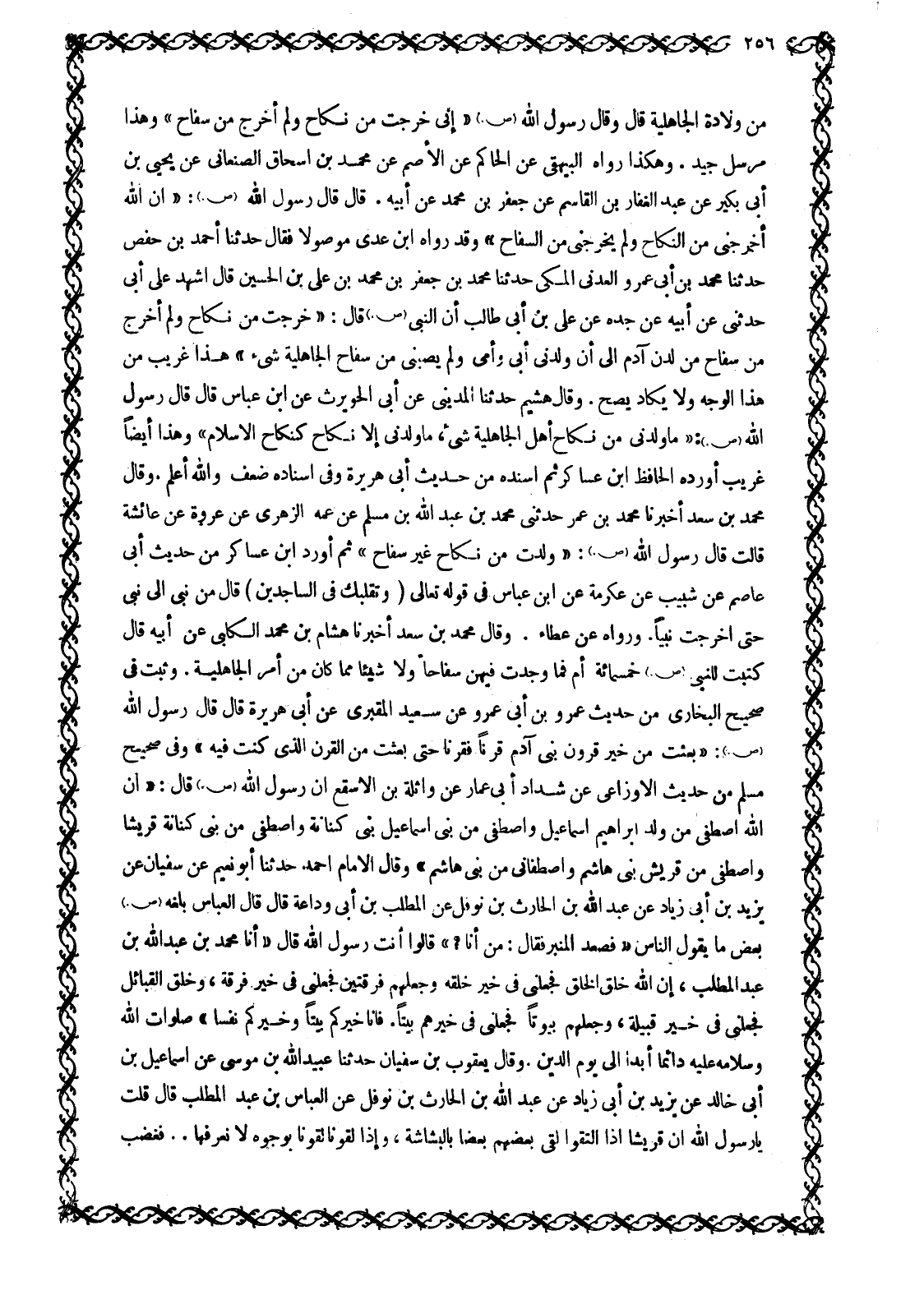 مِنْ وِلَادَةِ الْجَاهِلِيَّةِ قَالَ وَقَالَ رَسُولُ اللَّهِ صَلَّى اللَّهُ عَلَيْهِ وَسَلَّمَ «إِنِّي خَرَجْتُ مِنْ نِكَاحٍ وَلَمْ أَخْرُجْ مِنْ سِفَاحٍ» وَهَذَا مُرْسَلٌ جَيِّدٌ. وَهَكَذَا رَوَاهُ الْبَيْهَقِيُّ عَنِ الْحَاكِمِ عَنِ الْأَصَمِّ عَنْ محمد بن إسحاق الصنعاني عَنْ يَحْيَى بْنِ أَبِي بُكَيْرٍ عَنْ عَبْدِ الْغَفَّارِ بْنِ الْقَاسِمِ عَنْ جَعْفَرِ بْنِ مُحَمَّدٍ عَنْ أَبِيهِ قَالَ قَالَ رَسُولُ اللَّهِ صَلَّى اللَّهُ عَلَيْهِ وَسَلَّمَ: إِنَّ اللَّهَ أَخْرَجَنِي مِنَ النِّكَاحِ وَلَمْ يُخْرِجْنِي مِنَ السِّفَاحِ» وَقَدْ رَوَاهُ ابْنُ عَدِيٍّ مَوْصُولًا فَقَالَ حَدَّثَنَا أَحْمَدُ بْنُ حَفْصٍ حَدَّثَنَا مُحَمَّدُ بْنُ أَبِي عَمْرٍو الْعَدَنِيُّ الْمَكِّيُّ حَدَّثَنَا مُحَمَّدُ بْنُ جَعْفَرِ بْنِ مُحَمَّدِ بْنِ عَلِيِّ بْنِ الْحُسَيْنِ قَالَ أَشْهَدُ عَلَى أَبِي حَدَّثَنِي عَنْ أَبِيهِ عَنْ جَدِّهِ عَنْ عَلِيِّ بْنِ أَبِي طَالِبٍ أَنَّ النَّبِيَّ صَلَّى اللَّهُ عَلَيْهِ وَسَلَّمَ قَالَ: «خَرَجْتُ مِنْ نِكَاحٍ وَلَمْ أَخْرُجْ مِنْ سِفَاحٍ مِنْ لَدُنْ آدَمَ إِلَى أَنْ وَلَدَنِي أَبِي وَأُمِّي وَلَمْ يُصِبْنِي من سفاح الجاهلية شيء» هذا غَرِيبٌ مِنْ هَذَا الْوَجْهِ وَلَا يَكَادُ يَصِحُّ. وَقَالَ هُشَيْمٌ حَدَّثَنَا الْمَدِينِيُّ عَنْ أَبِي الْحُوَيْرِثِ عَنِ ابْنِ عَبَّاسٍ قَالَ قَالَ رَسُولُ اللَّهِ صَلَّى اللَّهُ عَلَيْهِ وَسَلَّمَ: «مَا وَلَدَنِي مِنْ نِكَاحِ أَهْلِ الْجَاهِلِيَّةِ شَيْءٌ، مَا وَلَدَنِي إِلَّا نِكَاحٌ كَنِكَاحِ الْإِسْلَامِ» وَهَذَا أَيْضًا غَرِيبٌ أَوْرَدَهُ الْحَافِظُ ابْنُ عَسَاكِرَ ثُمَّ أَسْنَدَهُ مِنْ حَدِيثِ أَبِي هُرَيْرَةَ وَفِي إِسْنَادِهِ ضَعْفٌ وَاللَّهُ أَعْلَمُ. وَقَالَ مُحَمَّدُ بْنُ سَعْدٍ أَخْبَرَنَا مُحَمَّدُ بْنُ عُمَرَ حَدَّثَنِي مُحَمَّدُ بْنُ عَبْدِ اللَّهِ بْنِ مُسْلِمٍ عَنْ عَمِّهِ الزُّهْرِيِّ عَنْ عُرْوَةَ عَنْ عَائِشَةَ قَالَتْ قَالَ رَسُولُ اللَّهِ صَلَّى اللَّهُ عَلَيْهِ وَسَلَّمَ: «وُلِدْتُ مِنْ نِكَاحٍ غَيْرِ سِفَاحٍ» ثُمَّ أَوْرَدَ ابْنُ عَسَاكِرَ مِنْ حَدِيثِ أَبِي عَاصِمٍ عَنْ شَبِيبٍ عَنْ عِكْرِمَةَ عَنِ ابْنِ عَبَّاسٍ فِي قَوْلِهِ تَعَالَى وَتَقَلُّبَكَ فِي السَّاجِدِينَ 26: 219 قَالَ مِنْ نَبِيٍّ إِلَى نَبِيٍّ حَتَّى أُخْرِجْتُ نَبِيًّا. وَرَوَاهُ عَنْ عَطَاءٍ. وَقَالَ مُحَمَّدُ بْنُ سَعْدٍ أَخْبَرَنَا هِشَامُ بْنُ مُحَمَّدٍ الْكَلْبِيُّ عَنْ أَبِيهِ قَالَ كَتَبْتُ لِلنَّبِيِّ صَلَّى اللَّهُ عَلَيْهِ وَسَلَّمَ خَمْسَمِائَةِ أَمٍّ فَمَا وَجَدْتُ فِيهِنَّ سِفَاحًا وَلَا شَيْئًا مِمَّا كَانَ مِنْ أَمْرِ الْجَاهِلِيَّةِ. وَثَبَتَ فِي صَحِيحِ الْبُخَارِيِّ مِنْ حَدِيثِ عَمْرِو بْنِ أَبِي عَمْرٍو عَنْ سَعِيدٍ الْمَقْبُرِيِّ عَنْ أَبِي هُرَيْرَةَ قَالَ قَالَ رَسُولُ اللَّهِ صَلَّى اللَّهُ عَلَيْهِ وَسَلَّمَ: «بُعِثْتُ مِنْ خَيْرِ قُرُونِ بَنِي آدَمَ قَرْنًا فَقَرْنًا حَتَّى بُعِثْتُ مِنَ الْقَرْنِ الَّذِي كُنْتُ فِيهِ» وَفِي صَحِيحِ مُسْلِمٍ مِنْ حَدِيثِ الْأَوْزَاعِيِّ عَنْ شَدَّادٍ أَبِي عَمَّارٍ عَنْ وَاثِلَةَ بْنِ الْأَسْقَعِ أَنَّ رَسُولَ اللَّهِ صَلَّى اللَّهُ عَلَيْهِ وَسَلَّمَ قَالَ: «إِنَّ اللَّهَ اصْطَفَى مِنْ وَلَدِ إِبْرَاهِيمَ إِسْمَاعِيلَ وَاصْطَفَى مِنْ بَنِي إِسْمَاعِيلَ بَنِي كِنَانَةَ وَاصْطَفَى مِنْ بَنِي كِنَانَةَ قُرَيْشًا وَاصْطَفَى مِنْ قُرَيْشٍ بَنِي هَاشِمٍ وَاصْطَفَانِي مِنْ بَنِي هَاشِمٍ» وَقَالَ الْإِمَامُ أَحْمَدُ حَدَّثَنَا أَبُو نُعَيْمٍ عَنْ سُفْيَانَ عَنْ يَزِيدَ بْنِ أَبِي زِيَادٍ عَنْ عَبْدِ اللَّهِ بْنِ الْحَارِثِ بْنِ نَوْفَلٍ عَنِ الْمُطَّلِبِ بْنِ أَبِي وَدَاعَ