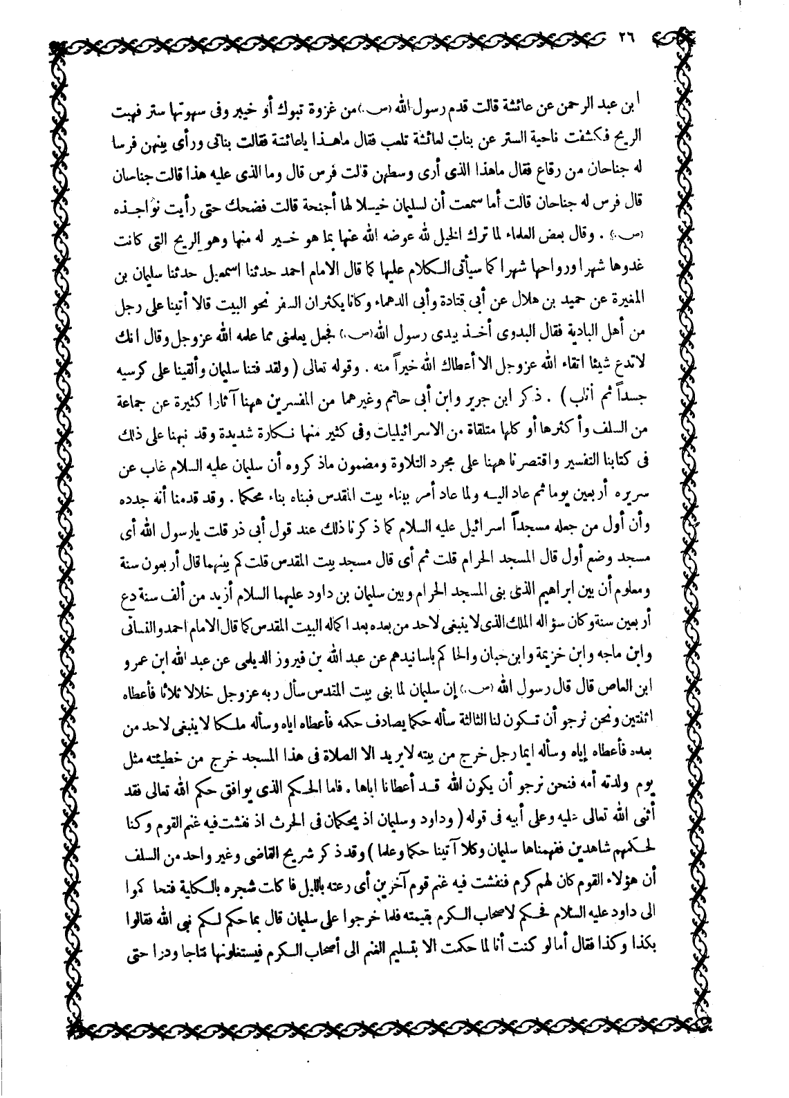 ابن عَبْدِ الرَّحْمَنِ عَنْ عَائِشَةَ قَالَتْ قَدِمَ رَسُولُ اللَّهِ صَلَّى اللَّهُ عَلَيْهِ وَسَلَّمَ مِنْ غَزْوَةِ تَبُوكَ أَوْ خَيْبَرَ وَفِي سَهْوَتِهَا سِتْرٌ فَهَبَّتِ الرِّيحُ فَكَشَفَتْ نَاحِيَةَ السِّتْرِ عَنْ بَنَاتٍ لِعَائِشَةَ تلعب فَقَالَ مَا هَذَا يَا عَائِشَةُ فَقَالَتْ بَنَاتِي وَرَأَى بَيْنَهُنَّ فَرَسًا لَهُ جَنَاحَانِ مِنْ رِقَاعٍ فَقَالَ مَا هَذَا الَّذِي أَرَى وَسَطَهُنَّ قَالَتْ فَرَسٌ قَالَ وَمَا الَّذِي عَلَيْهِ هَذَا قَالَتْ جَنَاحَانِ قَالَ فَرَسٌ لَهُ جَنَاحَانِ قَالَتْ أَمَا سَمِعْتَ أَنَّ لِسُلَيْمَانَ خَيْلًا لَهَا أَجْنِحَةٌ قَالَتْ فَضَحِكَ حَتَّى رَأَيْتُ نَوَاجِذَهُ صَلَّى اللَّهُ عَلَيْهِ وَسَلَّمَ. وَقَالَ بَعْضُ الْعُلَمَاءِ لَمَّا تَرَكَ الْخَيْلَ للَّه عَوَّضَهُ اللَّهُ عَنْهَا بِمَا هُوَ خَيْرٌ له منها وهو الريح التي كانت غُدُوُّهَا شَهْرًا وَرَوَاحُهَا شَهْرًا كَمَا سَيَأْتِي الْكَلَامُ عَلَيْهَا كَمَا قَالَ الْإِمَامُ أَحْمَدُ حَدَّثَنَا إِسْمَاعِيلُ حَدَّثَنَا سُلَيْمَانُ بْنُ الْمُغِيرَةِ عَنْ حُمَيْدِ بْنِ هِلَالٍ عَنْ أَبِي قَتَادَةَ وَأَبِي الدَّهْمَاءِ وَكَانَا يُكْثِرَانِ السَّفَرَ نَحْوَ الْبَيْتِ قَالَا أَتَيْنَا عَلَى رَجُلٍ مِنْ أَهْلِ الْبَادِيَةِ فَقَالَ الْبَدَوِيُّ أَخَذَ بِيَدِي رَسُولُ اللَّهِ صَلَّى اللَّهُ عَلَيْهِ وَسَلَّمَ فَجَعَلَ يُعَلِّمُنِي مِمَّا عَلَّمَهُ اللَّهُ عَزَّ وَجَلَّ وَقَالَ إِنَّكَ لَا تَدَعُ شَيْئًا اتِّقَاءَ اللَّهِ عَزَّ وَجَلَّ إِلَّا أَعْطَاكَ اللَّهُ خَيْرًا مِنْهُ. وَقَوْلُهُ تَعَالَى وَلَقَدْ فَتَنَّا سُلَيْمانَ وَأَلْقَيْنا عَلى كُرْسِيِّهِ جَسَداً ثُمَّ أَنابَ 38: 34. ذَكَرَ ابْنُ جَرِيرٍ وَابْنُ أَبِي حَاتِمٍ وَغَيْرُهُمَا مِنَ الْمُفَسِّرِينَ هَاهُنَا آثَارًا كَثِيرَةً عَنْ جَمَاعَةٍ مِنَ السَّلَفِ وَأَكْثَرُهَا أَوْ كُلُّهَا مُتَلَقَّاةٌ مِنَ الْإِسْرَائِيلِيَّاتِ وَفِي كَثِيرٍ مِنْهَا نَكَارَةٌ شَدِيدَةٌ وَقَدْ نَبَّهْنَا عَلَى ذَلِكَ فِي كِتَابِنَا التَّفْسِيرِ وَاقْتَصَرْنَا هَاهُنَا عَلَى مُجَرَّدِ التِّلَاوَةِ وَمَضْمُونُ مَا ذَكَرُوهُ أَنَّ سُلَيْمَانَ عَلَيْهِ السَّلَامُ غَابَ عَنْ سَرِيرِهِ أَرْبَعِينَ يَوْمًا ثُمَّ عَادَ إِلَيْهِ وَلَمَّا عَادَ أَمَرَ بِبِنَاءِ بَيْتِ الْمَقْدِسِ فَبَنَاهُ بِنَاءً مُحْكَمًا. وَقَدْ قَدَّمْنَا أَنَّهُ جَدَّدَهُ وَأَنَّ أَوَّلَ مَنْ جَعَلَهُ مَسْجِدًا إِسْرَائِيلُ عَلَيْهِ السَّلَامُ كَمَا ذَكَرْنَا ذَلِكَ عِنْدَ قَوْلِ أَبِي ذَرٍّ قُلْتُ يَا رَسُولَ اللَّهِ أَيُّ مَسْجِدٍ وُضِعَ أَوَّلَ قَالَ الْمَسْجِدُ الْحَرَامُ قُلْتُ ثُمَّ أَيْ قَالَ مَسْجِدُ بَيْتِ الْمَقْدِسِ قُلْتُ كَمْ بَيْنَهُمَا قَالَ أَرْبَعُونَ سَنَةً وَمَعْلُومٌ أَنْ بَيْنَ إِبْرَاهِيمَ الَّذِي بَنَى الْمَسْجِدَ الْحَرَامَ وَبَيْنَ سُلَيْمَانَ بْنِ دَاوُدَ عَلَيْهِمَا السَّلَامُ أَزِيدَ مِنْ أَلْفِ سَنَةٍ دَعْ أَرْبَعِينَ سَنَةً وَكَانَ سُؤَالُهُ الْمُلْكَ الَّذِي لَا يَنْبَغِي لأحد من بعده بعد إكماله الْبَيْتِ الْمُقَدَّسِ كَمَا قَالَ الْإِمَامُ أَحْمَدُ وَالنَّسَائِيُّ وَابْنُ مَاجَهْ وَابْنُ خُزَيْمَةَ وَابْنُ حِبَّانَ وَالْحَاكِمُ بِأَسَانِيدِهِمْ عَنْ عَبْدِ اللَّهِ بْنِ فَيْرُوزَ الدَّيْلَمِيِّ عن عبد الله ابن عمرو ابن الْعَاصِ قَالَ قَالَ رَسُولُ اللَّهِ صَلَّى اللَّهُ عَلَيْهِ وَسَلَّمَ إِنَّ سُلَيْمَانَ لَمَّا بَنَى بَيْتَ الْمَقْدِسِ سَأَلَ رَبَّهُ عَزَّ وَجَلَّ خِلَالًا ثَلَاثًا فَأَعْطَاهُ اثْنَتَيْنِ وَنَحْنُ نَرْجُو أَنْ تَكُونَ لَنَا الثَّالِثَةُ سَأَلَهُ حُكْمًا يُصَادِفُ حُكْمَهُ فَأَعْطَاهُ إِيَّاهُ وَسَأَلَهُ مُلْكًا لَا يَن
