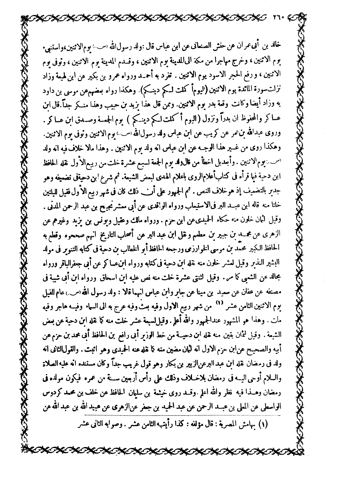 وَهَكَذَا رُوِيَ مِنْ غَيْرِ هَذَا الْوَجْهِ عَنِ ابْنِ عَبَّاسٍ أَنَّهُ وَلِدَ يَوْمَ الِاثْنَيْنِ. وَهَذَا مَا لَا خِلَافَ فِيهِ أَنَّهُ وُلِدَ صَلَّى اللَّهُ عَلَيْهِ وَسَلَّمَ يَوْمَ الِاثْنَيْنِ. وَأَبْعَدَ بَلْ أَخْطَأَ مَنْ قَالَ وُلِدَ يَوْمَ الْجُمُعَةِ لِسَبْعَ عَشْرَةَ خَلَتْ مِنْ رَبِيعٍ الْأَوَّلِ نَقَلُهُ الْحَافِظُ ابْنُ دحية فيما قرأه في كتاب أعلام الروي بِأَعْلَامِ الْهُدَى لِبَعْضِ الشِّيعَةِ. ثُمَّ شَرَعَ ابْنُ دِحْيَةَ فِي تَضْعِيفِهِ وَهُوَ جَدِيرٌ بِالتَّضْعِيفِ إِذْ هُوَ خِلَافُ النَّصِّ. ثُمَّ الْجُمْهُورُ عَلَى أَنَّ ذَلِكَ كَانَ فِي شَهْرِ رَبِيعٍ الْأَوَّلِ فَقِيلَ لِلَيْلَتَيْنِ خَلَتَا مِنْهُ قَالَهُ ابْنُ عَبْدِ الْبَرِّ فِي الِاسْتِيعَابِ وَرَوَاهُ الْوَاقِدِيُّ عَنْ أَبِي مَعْشَرٍ نَجِيحِ بْنِ عَبْدِ الرَّحْمَنِ الْمَدَنِيِّ.