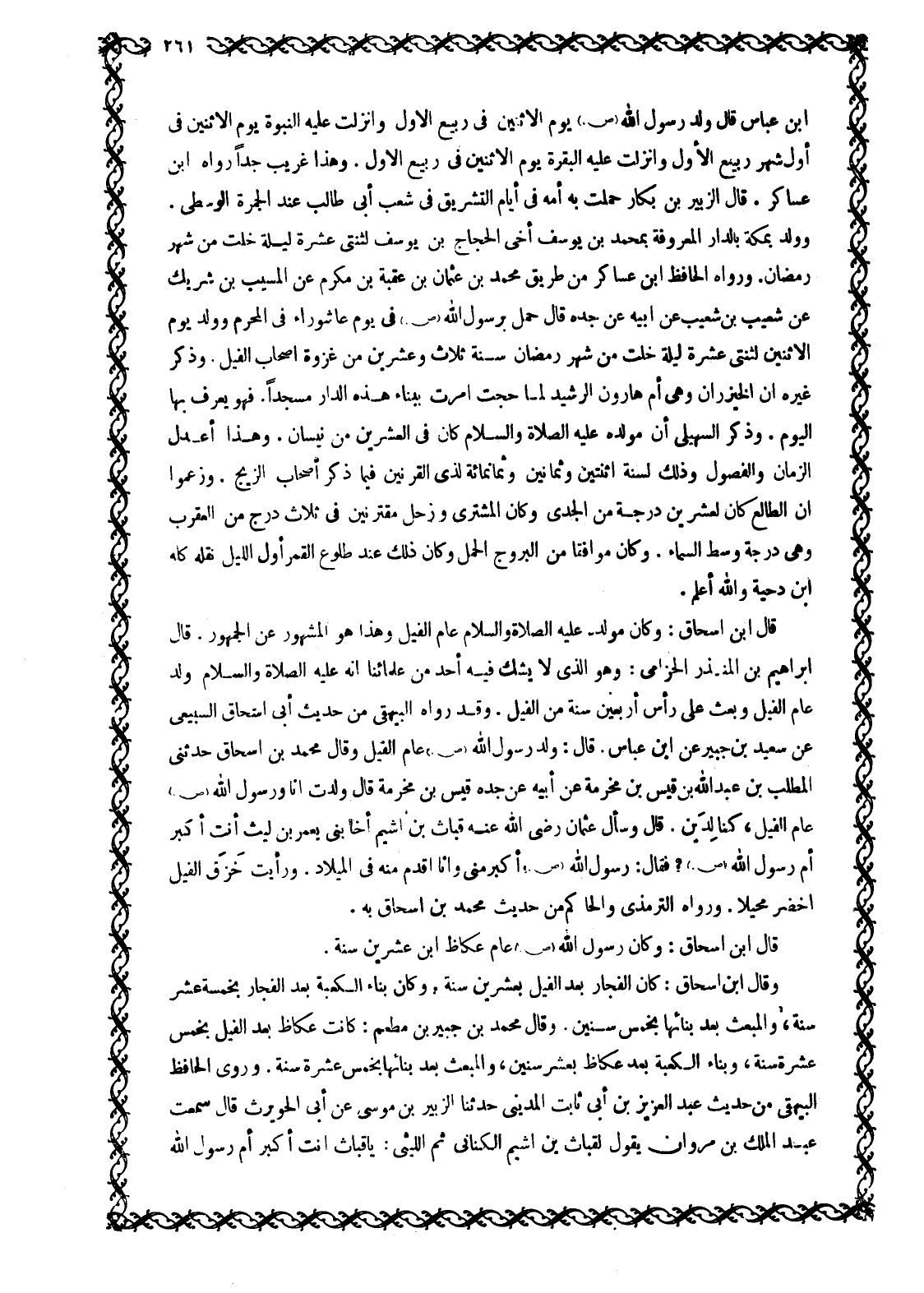ابْنِ عَبَّاسٍ قَالَ وُلِدَ رَسُولُ اللَّهِ صَلَّى اللَّهُ عَلَيْهِ وَسَلَّمَ يَوْمَ الِاثْنَيْنِ فِي رَبِيعٍ الْأَوَّلِ وَأُنْزِلَتْ عَلَيْهِ النُّبُوَّةُ يَوْمَ الِاثْنَيْنِ فِي أَوَّلِ شَهْرِ رَبِيعٍ الْأَوَّلِ وَأُنْزِلَتْ عَلَيْهِ الْبَقَرَةُ يَوْمَ الِاثْنَيْنِ فِي رَبِيعٍ الْأَوَّلِ. وَهَذَا غَرِيبٌ جِدًّا رَوَاهُ ابْنُ عَسَاكِرَ. قَالَ الزُّبَيْرُ بْنُ بَكَّارٍ حَمَلَتْ بِهِ أُمُّهُ فِي أَيَّامِ التَّشْرِيقِ فِي شِعْبِ أَبِي طَالِبٍ عِنْدَ الْجَمْرَةِ الْوُسْطَى.