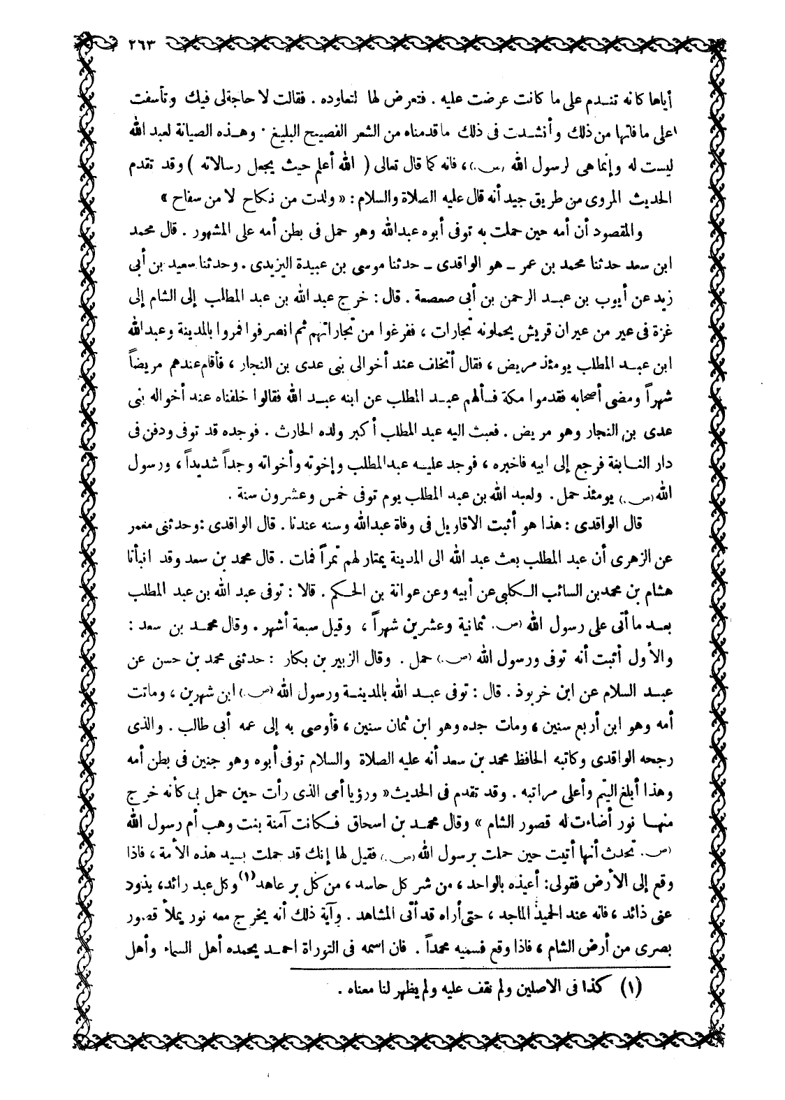 وَالْأَوَّلُ أَثْبَتُ أَنَّهُ تُوُفِّيَ وَرَسُولُ اللَّهِ صَلَّى اللَّهُ عَلَيْهِ وَسَلَّمَ حَمْلٌ. وَقَالَ الزُّبَيْرُ بْنُ بَكَّارٍ: حَدَّثَنِي مُحَمَّدُ بْنُ حَسَنٍ عَنْ عَبْدِ السَّلَامِ عَنِ ابْنِ خَرَّبُوذَ. قَالَ: تُوُفِّيَ عَبْدُ اللَّهِ بِالْمَدِينَةِ وَرَسُولُ اللَّهِ صَلَّى اللَّهُ عَلَيْهِ وَسَلَّمَ ابْنُ شَهْرَيْنِ، وَمَاتَتْ أُمُّهُ وَهُوَ ابْنُ أَرْبَعِ سِنِينَ، وَمَاتَ جَدُّهُ وَهُوَ ابْنُ ثَمَانِ سِنِينَ، فَأَوْصَى بِهِ إِلَى عَمِّهِ أَبِي طَالِبٍ. وَالَّذِي رَجَّحَهُ الْوَاقِدِيُّ وَكَاتِبُهُ الْحَافِظُ مُحَمَّدُ بْنُ سَعْدٍ أَنَّهُ عَلَيْهِ الصَّلَاةُ وَالسَّلَامُ تُوُفِّيَ أَبُوهُ وَهُوَ جَنِينٌ فِي بَطْنِ أُمِّهِ وَهَذَا أَبْلَغُ الْيُتْمِ وَأَعْلَى مَرَاتِبِهِ. وَقَدْ تَقَدَّمَ فِي الحديث «ورؤيا أمى الّذي رأت حين حمل بِي كَأَنَّهُ خَرَجَ مِنْهَا نُورٌ أَضَاءَتْ لَهُ قُصُورُ الشَّامِ» وَقَالَ مُحَمَّدُ بْنُ إِسْحَاقَ فَكَانَتْ آمِنَةُ بِنْتُ وَهْبٍ أُمُّ رَسُولِ اللَّهِ صَلَّى اللَّهُ عَلَيْهِ وَسَلَّمَ تُحَدِّثُ أَنَّهَا أُتِيَتْ حِينَ حَمَلَتْ بِرَسُولِ اللَّهِ صَلَّى اللَّهُ عَلَيْهِ وَسَلَّمَ فَقِيلَ لَهَا إِنَّكِ قَدْ حَمَلْتِ بِسَيِّدِ هَذِهِ الْأُمَّةِ، فَإِذَا وَقَعَ إِلَى الْأَرْضِ فَقُولِي: أُعِيذُهُ بالواحد، من شر كل حاسد، من كل بر عاهد [1] وكل عبد رائد، يذود عنى ذائد، فإنه عند الْحَمِيدِ الْمَاجِدْ، حَتَّى أَرَاهُ قَدْ أَتَى الْمَشَاهِدْ. وَآيَةُ ذَلِكَ أَنَّهُ يَخْرُجُ مَعَهُ نُورٌ يَمْلَأُ قُصُورَ بُصْرَى مِنْ أَرْضِ الشَّامِ، فَإِذَا وَقَعَ فَسَمِّيهِ مُحَمَّدًا. فَإِنَّ اسْمَهُ فِي التَّوْرَاةِ أَحْمَدُ يحمده أهل السماء وأهل