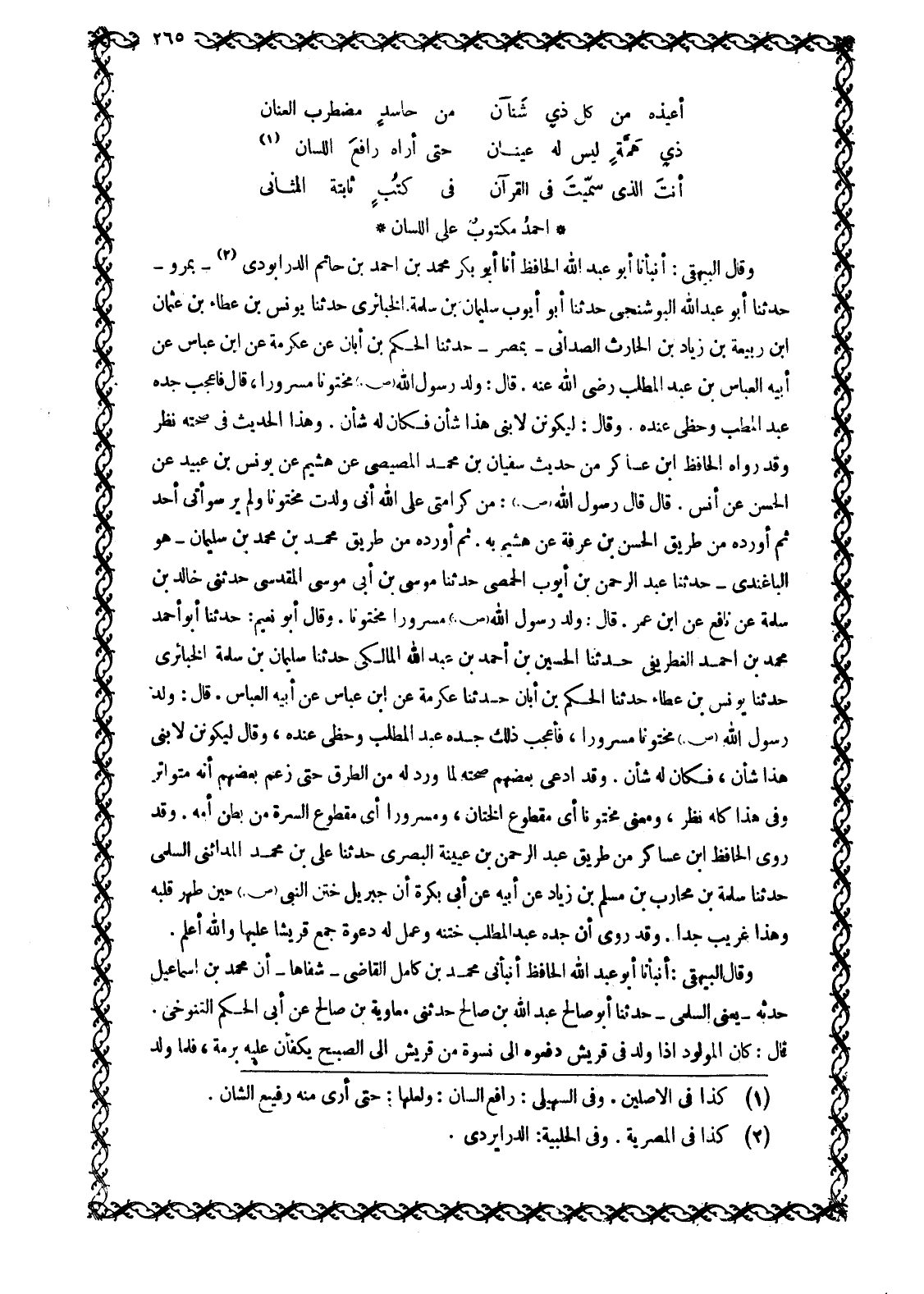 وَقَالَ الْبَيْهَقِيُّ: أَنْبَأَنَا أَبُو عَبْدِ اللَّهِ الْحَافِظُ أَنَا أَبُو بَكْرٍ مُحَمَّدُ بْنُ احمد بن حاتم الدرابودى [2]- بِمَرْوٍ- حَدَّثَنَا أَبُو عَبْدِ اللَّهِ الْبُوشَنْجِيُّ حَدَّثَنَا أَبُو أَيُّوبَ سُلَيْمَانُ بْنُ سَلَمَةَ الْخَبَائِرِيُّ حَدَّثَنَا يونس بن عطاء بن عثمان ابن رَبِيعَةَ بْنِ زِيَادِ بْنِ الْحَارِثِ الصُّدَائِيُّ- بِمِصْرَ- حَدَّثَنَا الْحَكَمِ بْنِ أَبَانٍ عَنْ عِكْرِمَةَ عَنِ ابْنِ عَبَّاسٍ عَنْ أَبِيهِ الْعَبَّاسِ بْنِ عَبْدِ الْمُطَّلِبِ رَضِيَ اللَّهُ عَنْهُ. قَالَ: وُلِدَ رَسُولُ اللَّهِ صَلَّى اللَّهُ عَلَيْهِ وَسَلَّمَ مَخْتُونًا مَسْرُورًا، قَالَ فَأَعْجَبَ جَدَّهُ عَبْدَ الْمُطَّلِبِ وَحَظِيَ عِنْدَهُ. وَقَالَ: لَيَكُونَنَّ لِابْنِي هَذَا شَأْنٌ فَكَانَ لَهُ شَأْنٌ. وَهَذَا الْحَدِيثُ فِي صِحَّتِهِ نَظَرٌ وَقَدْ رَوَاهُ الْحَافِظُ ابْنُ عَسَاكِرَ مِنْ حَدِيثِ سُفْيَانَ بْنِ مُحَمَّدٍ الْمِصِّيصِيِّ عَنْ هُشَيْمٍ عَنْ يُونُسَ بْنِ عُبَيْدٍ عَنِ الْحَسَنِ عَنْ أَنَسٍ. قَالَ قَالَ رَسُولُ اللَّهِ صَلَّى اللَّهُ عَلَيْهِ وَسَلَّمَ: مِنْ كَرَامَتِي عَلَى اللَّهِ أَنِّي وُلِدْتُ مَخْتُونًا ولم ير سوأتي أَحَدٌ ثُمَّ أَوْرَدَهُ مِنْ طَرِيقِ الْحَسَنِ بْنِ عَرَفَةَ عَنْ هُشَيْمٍ بِهِ. ثُمَّ أَوْرَدَهُ مِنْ طَرِيقِ مُحَمَّدِ بْنِ مُحَمَّدِ بْنِ سُلَيْمَانَ- هُوَ الْبَاغَنْدِيُّ- حَدَّثَنَا عَبْدُ الرَّحْمَنِ بْنُ أَيُّوبَ الْحِمْصِيُّ حَدَّثَنَا مُوسَى بْنُ أَبِي مُوسَى الْمَقْدِسِيُّ حَدَّثَنِي خَالِدُ بْنُ سَلَمَةَ عَنْ نَافِعٍ عَنِ ابْنِ عُمَرَ. قَالَ: وُلِدَ رَسُولُ اللَّهِ صَلَّى اللَّهُ عَلَيْهِ وَسَلَّمَ مَسْرُورًا مَخْتُونًا. وَقَالَ أَبُو نُعَيْمٍ: حَدَّثَنَا أَبُو أَحْمَدَ مُحَمَّدُ بْنُ أَحْمَدَ الْغِطْرِيفِيُّ حَدَّثَنَا الْحُسَيْنُ بْنُ أَحْمَدَ بْنِ عَبْدِ اللَّهِ الْمَالِكِيُّ حَدَّثَنَا سُلَيْمَانُ بْنُ سَلَمَةَ الْخَبَائِرِيُّ حَدَّثَنَا يُونُسُ بْنُ عَطَاءٍ حَدَّثَنَا الْحَكَمُ بْنُ أَبَانٍ حَدَّثَنَا عِكْرِمَةُ عَنِ ابْنِ عَبَّاسٍ عَنْ أَبِيهِ الْعَبَّاسِ. قَالَ: وُلِدَ رَسُولُ اللَّهِ صَلَّى اللَّهُ عَلَيْهِ وَسَلَّمَ مَخْتُونًا مَسْرُورًا، فَأَعْجَبَ ذَلِكَ جَدَّهُ عَبْدَ الْمُطَّلِبِ وَحَظِيَ عِنْدَهُ، وَقَالَ لَيَكُونَنَّ لِابْنِي هَذَا شَأْنٌ، فَكَانَ لَهُ شَأْنٌ. وَقَدِ ادَّعَى بَعْضُهُمْ صِحَّتَهُ لِمَا وَرَدَ لَهُ مِنَ الطُّرُقِ حَتَّى زَعَمَ بَعْضُهُمْ أَنَّهُ مُتَوَاتِرٌ وَفِي هَذَا كُلِّهِ نَظَرٌ، وَمَعْنًى مَخْتُونًا أَيْ مَقْطُوعَ الْخِتَانِ، وَمَسْرُورًا أَيْ مَقْطُوعَ السُّرَّةِ مِنْ بَطْنِ أُمِّهِ. وَقَدْ رَوَى الْحَافِظُ ابْنُ عَسَاكِرَ مِنْ طَرِيقِ عَبْدِ الرَّحْمَنِ بْنِ عُيَيْنَةَ الْبَصَرِيِّ حَدَّثَنَا عَلِيُّ بْنُ مُحَمَّدٍ الْمَدَائِنِيُّ السُّلَمِيُّ حَدَّثَنَا سَلَمَةُ بْنُ محارب بن مسلم بْنِ زِيَادٍ عَنْ أَبِيهِ عَنْ أَبِي بَكْرَةَ أَنَّ جِبْرِيلَ خَتَنَ النَّبِيَّ صَلَّى اللَّهُ عَلَيْهِ وَسَلَّمَ حِينَ طَهَّرَ قَلْبَهُ وَهَذَا غَرِيبٌ جِدًّا. وَقَدْ رُوِيَ أَنَّ جَدَّهُ عَبْدَ الْمُطَّلِبِ خَتَنَهُ وَعَمِلَ لَهُ دَعْوَةً جَمَعَ قُرَيْشًا عَلَيْهَا وَاللَّهُ أَعْلَمُ.