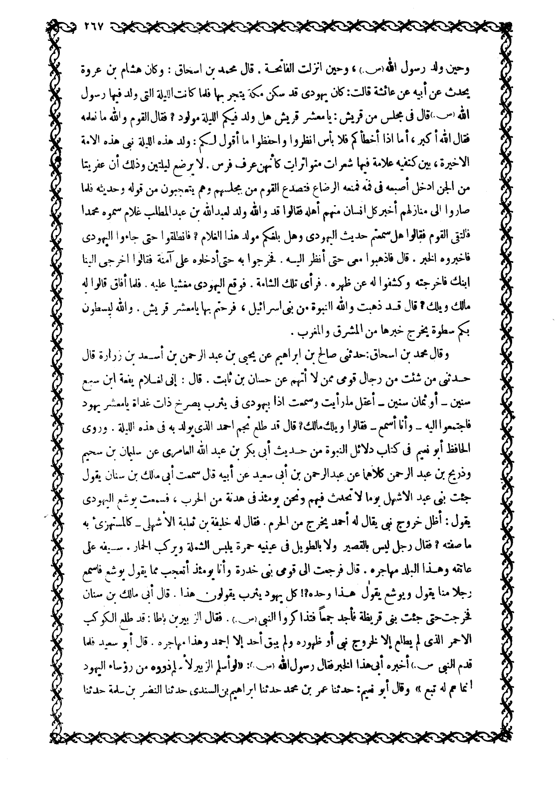 وَحِينَ وُلِدَ رَسُولُ اللَّهِ صَلَّى اللَّهُ عَلَيْهِ وَسَلَّمَ، وَحِينَ أُنْزِلَتِ الْفَاتِحَةُ. قَالَ مُحَمَّدُ بْنُ إِسْحَاقَ: وَكَانَ هِشَامُ بْنُ عُرْوَةَ يُحَدِّثُ عَنْ أَبِيهِ عَنْ عَائِشَةَ قَالَتْ: كَانَ يَهُودِيٌّ قَدْ سَكَنَ مَكَّةَ يَتَّجِرُ بِهَا فَلَمَّا كَانَتِ اللَّيْلَةَ الَّتِي وُلِدَ فِيهَا رَسُولُ اللَّهِ صَلَّى اللَّهُ عَلَيْهِ وَسَلَّمَ قَالَ فِي مَجْلِسٍ مِنْ قُرَيْشٍ: يَا مَعْشَرَ قُرَيْشٍ هَلْ وُلِدَ فِيكُمُ اللَّيْلَةَ مَوْلُودٌ؟ فَقَالَ الْقَوْمُ وَاللَّهِ مَا نَعْلَمُهُ فَقَالَ اللَّهُ أَكْبَرُ، أَمَا إِذَا أَخْطَأَكُمْ فَلَا بَأْسَ انْظُرُوا وَاحْفَظُوا مَا أَقُولُ لَكُمْ: وُلِدَ هَذِهِ اللَّيْلَةَ نَبِيُّ هَذِهِ الْأُمَّةِ الْأَخِيرَةِ، بَيْنَ كَتِفَيْهِ عَلَامَةٌ فِيهَا شَعَرَاتٌ مُتَوَاتِرَاتٌ كَأَنَّهُنَّ عُرْفُ فَرَسٍ. لَا يَرْضَعُ لَيْلَتَيْنِ وَذَلِكَ أَنَّ عِفْرِيتًا مِنَ الْجِنِّ أَدْخَلَ أُصْبُعَهُ فِي فَمِهِ فَمَنَعَهُ الرَّضَاعَ فَتَصَدَّعَ الْقَوْمُ مِنْ مَجْلِسِهِمْ وَهُمْ يَتَعَجَّبُونَ مِنْ قَوْلِهِ وَحَدِيثِهِ فَلَمَّا صَارُوا إِلَى مَنَازِلِهِمْ أَخْبَرَ كُلُّ إِنْسَانٍ مِنْهُمْ أَهْلَهُ فَقَالُوا قَدْ وَاللَّهِ وُلِدَ لِعَبْدِ اللَّهِ بْنِ عَبْدِ الْمُطَّلِبِ غُلَامٌ سَمَّوْهُ مُحَمَّدًا فَالْتَقَى الْقَوْمُ فَقَالُوا هَلْ سَمِعْتُمْ حَدِيثَ الْيَهُودِيِّ وَهَلْ بَلَغَكُمْ مَوْلِدُ هَذَا الْغُلَامِ؟ فَانْطَلَقُوا حَتَّى جَاءُوا الْيَهُودِيَّ فَأَخْبَرُوهُ الْخَبَرَ. قَالَ فَاذْهَبُوا مَعِيَ حَتَّى أَنْظُرَ إِلَيْهِ. فَخَرَجُوا بِهِ حَتَّى أَدْخَلُوهُ عَلَى آمِنَةَ فَقَالُوا أَخْرِجِي إِلَيْنَا ابْنَكِ فَأَخْرَجَتْهُ وَكَشَفُوا لَهُ عَنْ ظَهْرِهِ. فَرَأَى تِلْكَ الشَّامَةَ. فَوَقَعَ الْيَهُودِيُّ مَغْشِيًّا عَلَيْهِ. فَلَمَّا أفاق قالوا له مالك وَيْلَكَ؟ قَالَ قَدْ ذَهَبَتْ وَاللَّهِ النُّبُوَّةُ مِنْ بنى إسرائيل، فرحتم بِهَا يَا مَعْشَرَ قُرَيْشٍ. وَاللَّهِ لَيَسْطُوَنَّ بِكُمْ سَطْوَةً يَخْرُجُ خَبَرُهَا مِنَ الْمَشْرِقِ وَالْمَغْرِبِ.
