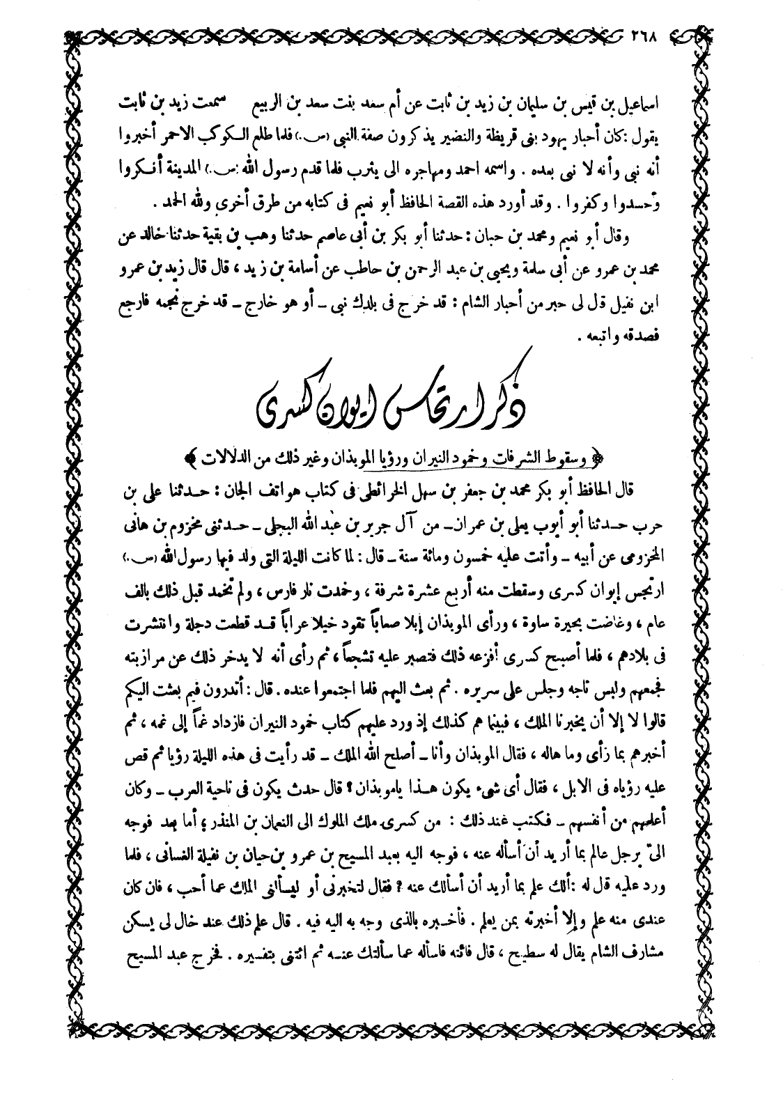 وَسُقُوطِ الشُّرُفَاتِ وَخُمُودِ النِّيرَانِ وَرُؤْيَا الْمُوبِذَانِ وَغَيْرِ ذَلِكَ مِنَ الدَّلَالَاتِ قَالَ الْحَافِظُ أَبُو بَكْرٍ مُحَمَّدُ بْنُ جَعْفَرِ بْنِ سَهْلٍ الْخَرَائِطِيُّ فِي كِتَابِ هَوَاتِفِ الْجَانِّ: حَدَّثَنَا عَلِيُّ بْنُ حَرْبٍ حَدَّثَنَا أَبُو أَيُّوبَ يَعْلَى بْنُ عِمْرَانَ- مِنْ آلِ جَرِيرِ بْنِ عَبْدِ اللَّهِ الْبَجَلِيِّ- حَدَّثَنِي مخزوم بن هاني الْمَخْزُومِيُّ عَنْ أَبِيهِ- وَأَتَتْ عَلَيْهِ خَمْسُونَ وَمِائَةُ سَنَةٍ- قَالَ: لَمَّا كَانَتِ اللَّيْلَةُ الَّتِي وُلِدَ فِيهَا رَسُولُ اللَّهِ صَلَّى اللَّهُ عَلَيْهِ وَسَلَّمَ ارْتَجَسَ إِيوَانُ كِسْرَى وَسَقَطَتْ مِنْهُ أَرْبَعَ عَشْرَةَ شُرْفَةً، وَخَمَدَتْ نَارُ فَارِسَ، وَلَمْ تُخْمَدْ قَبْلَ ذَلِكَ بِأَلْفِ عَامٍ، وَغَاضَتْ بُحَيْرَةُ سَاوَةَ، وَرَأَى الْمُوبِذَانِ إِبِلًا صِعَابًا تَقُودُ خَيْلًا عِرَابًا قَدْ قَطَعَتْ دِجْلَةَ وَانْتَشَرَتْ فِي بِلَادِهِمْ، فَلَمَّا أَصْبَحَ كِسْرَى أَفْزَعَهُ ذَلِكَ فَتَصَبَّرُ عَلَيْهِ تَشَجُّعًا، ثُمَّ رَأَى أَنَّهُ لَا يَدَّخِرُ ذَلِكَ عَنْ مَرَازِبَتِهِ فَجَمَعَهُمْ وَلَبِسَ تَاجَهُ وَجَلَسَ عَلَى سَرِيرِهِ. ثُمَّ بَعَثَ إِلَيْهِمْ فَلَمَّا اجْتَمَعُوا عِنْدَهُ. قَالَ: أَتُدْرُونَ فِيمَ بَعَثْتُ إِلَيْكُمْ قَالُوا لَا إِلَّا أَنْ يُخْبِرَنَا الْمَلِكُ، فَبَيْنَمَا هُمْ كَذَلِكَ إِذْ وَرَدَ عليهم كتاب خمود النِّيرَانِ فَازْدَادَ غَمًّا إِلَى غَمِّهِ، ثُمَّ أَخْبَرَهُمْ بِمَا رَأَى وَمَا هَالَهُ، فَقَالَ الْمُوبِذَانُ وَأَنَا- أَصْلَحَ اللَّهُ الْمَلِكَ- قَدْ رَأَيْتُ فِي هَذِهِ اللَّيْلَةِ رُؤْيَا ثُمَّ قَصَّ عَلَيْهِ رُؤْيَاهُ فِي الْإِبِلِ، فَقَالَ أَيُّ شَيْءٍ يَكُونُ هَذَا يَا مُوبِذَانُ؟ قَالَ حَدَثٌ يَكُونُ فِي نَاحِيَةِ الْعَرَبِ- وَكَانَ أَعْلَمَهُمْ مِنْ أَنْفُسِهِمْ- فَكَتَبَ عِنْدَ ذَلِكَ: مِنْ كِسْرَى مَلِكِ الْمُلُوكِ إِلَى النُّعْمَانِ بْنِ الْمُنْذِرِ، أَمَّا بَعْدُ فَوَجِّهْ إِلَيَّ بِرَجُلٍ عَالِمٍ بِمَا أُرِيدُ أَنْ أَسْأَلَهُ عَنْهُ، فَوَجَّهَ إِلَيْهِ بِعَبْدِ الْمَسِيحِ بْنِ عَمْرِو بْنِ حَيَّانَ بْنِ نفيلة الْغَسَّانِيِّ، فَلَمَّا وَرَدَ عَلَيْهِ قَالَ لَهُ: أَلَكَ عِلْمٌ بِمَا أُرِيدُ أَنْ أَسْأَلَكَ عَنْهُ؟ فَقَالَ لِتُخْبِرَنِي أَوْ لِيَسْأَلَنِي الْمَلِكُ عَمَّا أَحَبَّ، فَإِنْ كان عندي منه علم وَإِلَّا أَخْبَرْتُهُ بِمَنْ يَعْلَمُ. فَأَخْبَرَهُ بِالَّذِي وَجَّهَ بِهِ إِلَيْهِ فِيهِ. قَالَ عِلْمُ ذَلِكَ عِنْدَ خَالٍ لِي يَسْكُنُ مَشَارِفَ الشَّامِ يُقَالَ لَهُ سَطِيحٌ، قَالَ فَائْتِهِ فَاسْأَلْهُ عَمَّا سَأَلَتُكَ عَنْهُ ثم ائتني بتفسيره. فخرج عبد المسيح