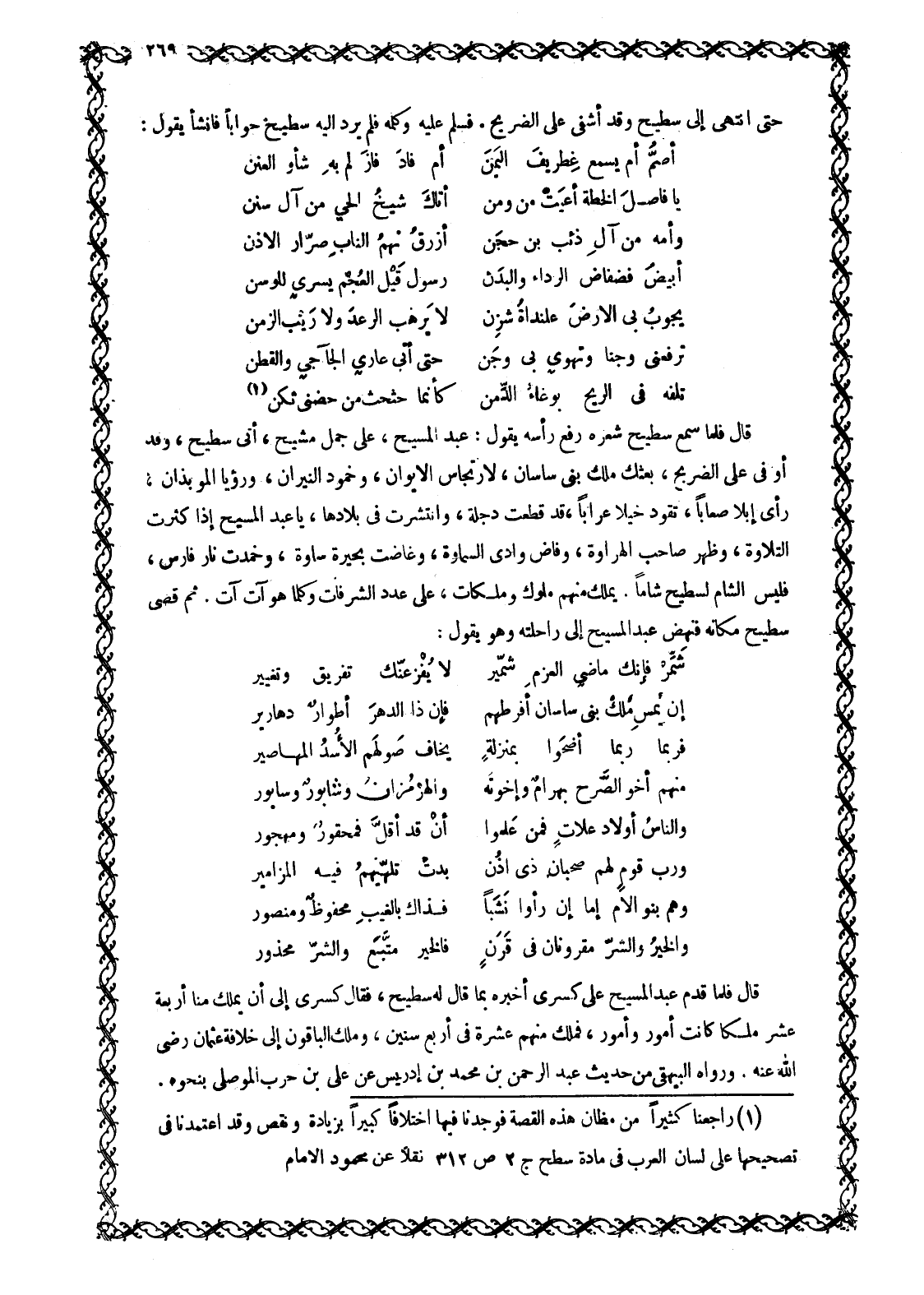 [1] قَالَ فَلَمَّا سَمِعَ سَطِيحٌ شِعْرَهُ رَفَعَ رَأْسَهُ يَقُولُ: عَبْدُ الْمَسِيحِ، عَلَى جَمَلٍ مُشِيحْ، أَتَى سَطِيحْ، وَقَدْ أَوْفَى عَلَى الضَّرِيحْ، بَعَثَكَ مَلِكُ بَنِي ساسان، لارتجاس الإيوان، وخمود النيران، ورؤيا الموبذان، رَأَى إِبِلًا صِعَابًا، تَقُودُ خَيْلًا عِرَابًا، قَدْ قَطَعَتْ دِجْلَةَ، وَانْتَشَرَتْ فِي بِلَادِهَا، يَا عَبْدَ الْمَسِيحِ إِذَا كَثُرَتِ التِّلَاوَهْ، وَظَهْرَ صاحب الهراوة، وفاض وادي السماوة، وغاضت بحيرة ساوة، وخمدت نار فارس، فليس الشام لسطيح شاما. يملك مِنْهُمْ مُلُوكٌ وَمَلِكَاتْ، عَلَى عَدَدِ الشُّرُفَاتْ وَكُلَّمَا هو آت آت. ثم قضى سطيح مكانه فَنَهَضَ عَبْدُ الْمَسِيحِ إِلَى رَاحِلَتِهِ وَهُوَ يَقُولُ: