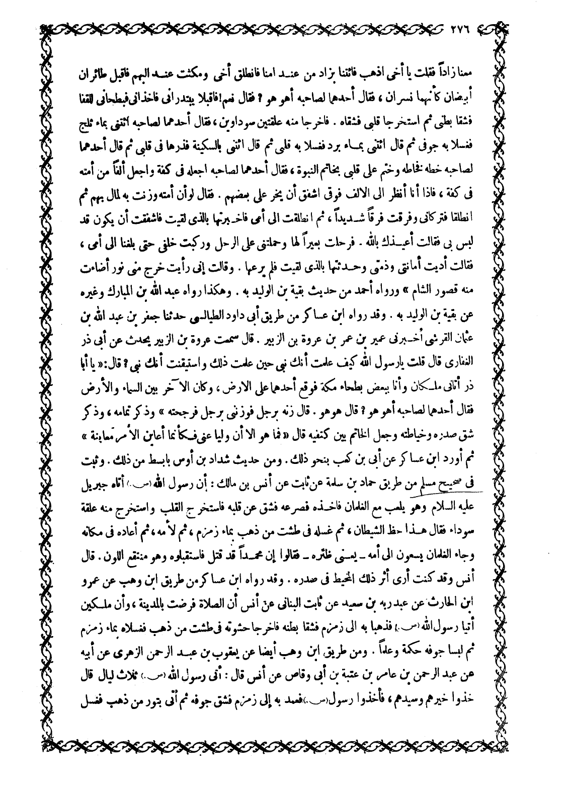 مَعَنَا زَادًا فَقُلْتُ يَا أَخِي اذْهَبْ فَائْتِنَا بِزَادٍ مِنْ عِنْدِ أُمِّنَا فَانْطَلَقَ أَخِي وَمَكَثْتُ عِنْدَ الْبَهْمِ فَأَقْبَلَ طَائِرَانِ أَبْيَضَانِ كَأَنَّهُمَا نَسْرَانِ، فَقَالَ أَحَدُهُمَا لِصَاحِبِهِ أَهْوَ هُوَ؟ فَقَالَ نَعَمْ! فَأَقْبَلَا يَبْتَدِرَانِي فَأَخَذَانِي فَبَطَحَانِي لِلْقَفَا فَشَقَّا بَطْنِي ثُمَّ اسْتَخْرَجَا قَلْبِي فَشَقَّاهُ. فَأَخْرَجَا مِنْهُ عَلْقَتَيْنِ سَوْدَاوَيْنِ، فَقَالَ أَحَدُهُمَا لِصَاحِبِهِ ائْتِنِي بِمَاءٍ ثَلْجٍ فَغَسَلَا بِهِ جَوْفِي ثُمَّ قَالَ ائْتِنِي بِمَاءٍ بَرَدٍ فَغَسَلَا بِهِ قَلْبِي ثُمَّ قَالَ ائْتِنِي بِالسَّكِينَةِ فَذَرَّهَا فِي قَلْبِي ثُمَّ قَالَ أَحَدُهُمَا لصاحبه خطه فخاطه وَخَتَمَ عَلَى قَلْبِي بِخَاتَمِ النُّبُوَّةِ، فَقَالَ أَحَدُهُمَا لِصَاحِبِهِ اجْعَلْهُ فِي كِفَّةٍ وَاجْعَلْ أَلْفًا مِنْ أُمَّتِهِ فِي كِفَّةٍ، فَإِذَا أَنَا أَنْظُرُ إِلَى الْأَلْفِ فَوْقِي أُشْفِقُ أَنْ يَخِرَّ عَلَيِّ بَعْضُهُمْ. فَقَالَ لَوْ أَنَّ أُمَّتَهُ وُزِنَتْ بِهِ لَمَالَ بِهِمْ ثُمَّ انْطَلَقَا فَتَرَكَانِي وَفَرِقْتُ فَرَقًا شَدِيدًا، ثُمَّ انْطَلَقْتُ إِلَى أُمِّي فَأَخْبَرْتُهَا بِالَّذِي لَقِيتُ فأشفقت أن يكون قد لبس بِي فَقَالَتْ أُعِيذُكَ باللَّه. فَرَحَّلَتْ بَعِيرًا لَهَا وَحَمَلَتْنِي عَلَى الرَّحْلِ وَرَكِبَتْ خَلَفِي حَتَّى بَلَغْنَا إِلَى أُمِّي، فَقَالَتْ أَدَّيْتُ أَمَانَتِي وَذِمَّتِي وَحَدَّثَتْهَا بِالَّذِي لَقِيتْ فَلَمْ يَرُعْهَا. وَقَالَتْ إِنِّي رَأَيْتُ خَرَجَ مِنِّي نُورٌ أَضَاءَتْ مِنْهُ قُصُورُ الشَّامِ» وَرَوَاهُ أَحْمَدُ مِنْ حَدِيثِ بَقِيَّةَ بْنِ الْوَلِيدِ بِهِ. وَهَكَذَا رَوَاهُ عَبْدُ اللَّهِ بْنُ الْمُبَارَكِ وَغَيْرُهُ عَنْ بَقِيَّةَ بْنِ الْوَلِيدِ بِهِ. وَقَدْ رَوَاهُ ابْنُ عَسَاكِرَ مِنْ طَرِيقِ أَبِي دَاوُدَ الطَّيَالِسِيِّ حَدَّثَنَا جَعْفَرُ بْنُ عَبْدِ اللَّهِ بْنِ عُثْمَانَ الْقُرَشِيُّ أخبرنى عمير بن عُمَرُ بْنُ عُرْوَةَ بْنِ الزُّبَيْرِ. قَالَ سَمِعْتُ عُرْوَةَ بْنَ الزُّبَيْرِ يُحَدِّثُ عَنْ أَبِي ذَرٍّ الْغِفَارِيِّ قَالَ قُلْتُ يَا رَسُولَ اللَّهِ كَيْفَ عَلِمْتَ أَنَّكَ نَبِيٌّ حِينَ عَلِمْتَ ذَلِكَ وَاسْتَيْقَنْتَ أَنَّكَ نَبِيٌّ؟ قَالَ: «يَا أَبَا ذَرٍّ أَتَانِي مَلَكَانِ وَأَنَا بِبَعْضِ بَطْحَاءِ مَكَّةَ فَوَقَعَ أَحَدُهُمَا عَلَى الْأَرْضِ، وَكَانَ الْآخَرُ بَيْنَ السَّمَاءِ وَالْأَرْضِ فَقَالَ أَحَدُهُمَا لِصَاحِبِهِ أَهْوَ هُوَ؟ قَالَ هُوَ هو. قال زنه برجل فوزنني بِرَجُلٍ فَرَجَحْتُهُ» وَذَكَرَ تَمَامَهُ، وَذَكَرَ شَقَّ صَدْرِهُ وَخِيَاطَتَهُ وَجَعْلَ الْخَاتَمِ بَيْنَ كَتِفَيْهِ قَالَ «فَمَا هُوَ إِلَّا أَنْ وَلَّيَا عَنِّي فَكَأَنَّمَا أُعَايِنُ الْأَمْرَ مُعَايَنَةً» ثُمَّ أَوْرَدَ ابْنُ عَسَاكِرَ عَنْ أُبَيِّ بْنِ كَعْبٍ بِنَحْوِ ذَلِكَ. وَمِنْ حَدِيثِ شَدَّادِ بْنِ أَوْسٍ بِأَبْسَطَ مِنْ ذَلِكَ. وَثَبَتَ فِي صَحِيحِ مُسْلِمٍ مِنْ طَرِيقِ حَمَّادِ بْنِ سَلَمَةَ عَنْ ثَابِتٍ عَنْ أَنَسِ بْنِ مَالِكٍ: أَنَّ رَسُولَ اللَّهِ صَلَّى اللَّهُ عَلَيْهِ وَسَلَّمَ أَتَاهُ جِبْرِيلُ عَلَيْهِ السَّلَامُ وَهُوَ يَلْعَبُ مَعَ الْغِلْمَانِ فَأَخَذَهُ فَصَرَعَهُ فَشَقَّ عَنْ قَلْبِهِ فَاسْتَخْرَجَ القلب واستخرج منه علقة سوداء فقال هذا حظ الشيطان، ثم غسله في طشت مِنْ ذَهَبٍ بِمَاءِ زَمْزَمَ، ثُمَّ لَأَمَهُ، ثُمَّ أَعَادَهُ فِي مَكَانِهِ وَجَاءَ الْغِلْمَانُ يَسْعَوْنَ إِلَى أُمِّهِ- يَعْنِي ظِئْرَهَ- فَقَالُوا إِنَّ مُحَمَّدًا قَدْ قُتِلَ فَاسْتَقْبَلُوهُ وَهُوَ مُنْتَقِعُ اللَّوْنِ. قَالَ أَنَسٌ وَقَدْ كُنْتُ أَرَى أَثَرَ ذَلِكَ الْمِخْيَطِ فِي صَدْ