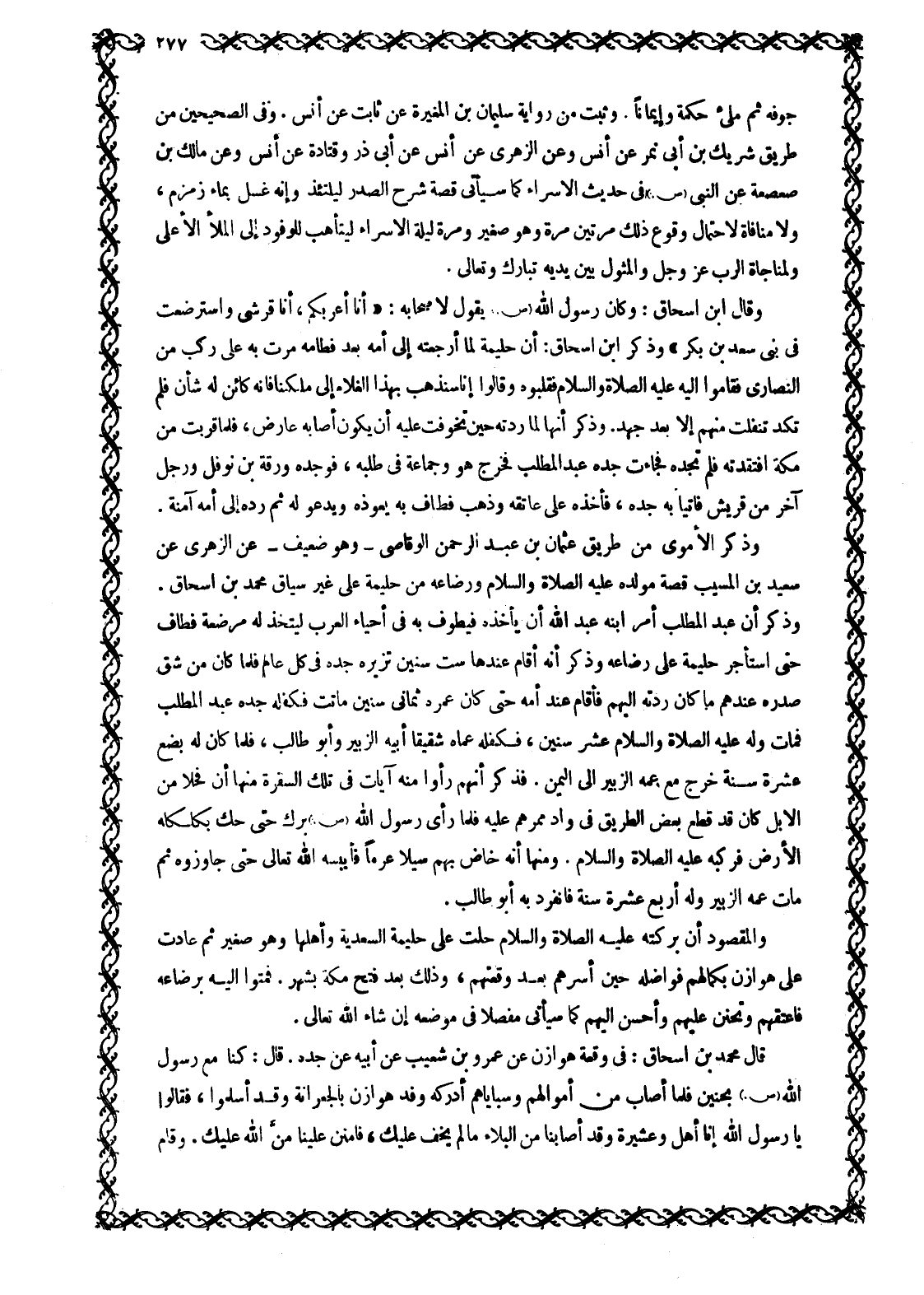 وَذَكَرَ أَنَّ عَبْدَ الْمُطَّلِبِ أَمَرَ ابْنَهُ عَبْدَ اللَّهِ أَنْ يَأْخُذَهُ فَيَطُوفَ به في أحياء العرب ليتخذ لَهُ مُرْضِعَةً فَطَافَ حَتَّى اسْتَأْجَرَ حَلِيمَةَ عَلَى رَضَاعِهِ وَذَكَرَ أَنَّهُ أَقَامَ عِنْدَهَا سِتَّ سِنِينَ تُزِيرُهُ جَدَّهُ فِي كُلِّ عَامٍ فَلَمَّا كَانَ مِنْ شَقِّ صَدْرِهِ عِنْدَهُمْ مَا كَانَ رَدَّتْهُ إِلَيْهِمْ فَأَقَامَ عِنْدَ أُمِّهِ حَتَّى كَانَ عُمُرُهُ ثَمَانِي سِنِينَ مَاتَتْ فَكَفَلَهُ جَدُّهُ عَبْدُ الْمُطَّلِبِ فَمَاتَ وَلَهُ عَلَيْهِ الصَّلَاةُ وَالسَّلَامُ عَشْرُ سِنِينَ، فَكَفَلَهُ عَمَّاهُ شَقِيقَا أَبِيهِ الزُّبَيْرُ وَأَبُو طَالِبٍ، فَلَمَّا كَانَ لَهُ بِضْعَ عَشْرَةَ سَنَةً خَرَجَ مَعَ عَمِّهِ الزُّبَيْرِ إِلَى الْيَمَنِ. فَذَكَرَ أَنَّهُمْ رَأَوْا مِنْهُ آيَاتٍ فِي تِلْكَ السَّفْرَةِ مِنْهَا أَنَّ فَحْلًا مِنَ الْإِبِلِ كَانَ قَدْ قَطَعَ بَعْضَ الطَّرِيقِ فِي وَادٍ مَمَرُّهُمْ عَلَيْهِ فَلَمَّا رَأَى رَسُولُ اللَّهِ صَلَّى اللَّهُ عَلَيْهِ وَسَلَّمَ بَرَكَ حَتَّى حَكَّ بِكَلْكَلِهِ الْأَرْضَ فَرَكِبَهُ عَلَيْهِ الصَّلَاةُ وَالسَّلَامُ. وَمِنْهَا أَنَّهُ خَاضَ بِهِمْ سَيْلًا عرما فَأَيْبَسَهُ اللَّهُ تَعَالَى حَتَّى جَاوَزُوهُ ثُمَّ مَاتَ عَمُّهُ الزُّبَيْرُ وَلَهُ أَرْبَعَ عَشْرَةَ سَنَةً فَانْفَرَدَ بِهِ أَبُو طَالِبٍ.