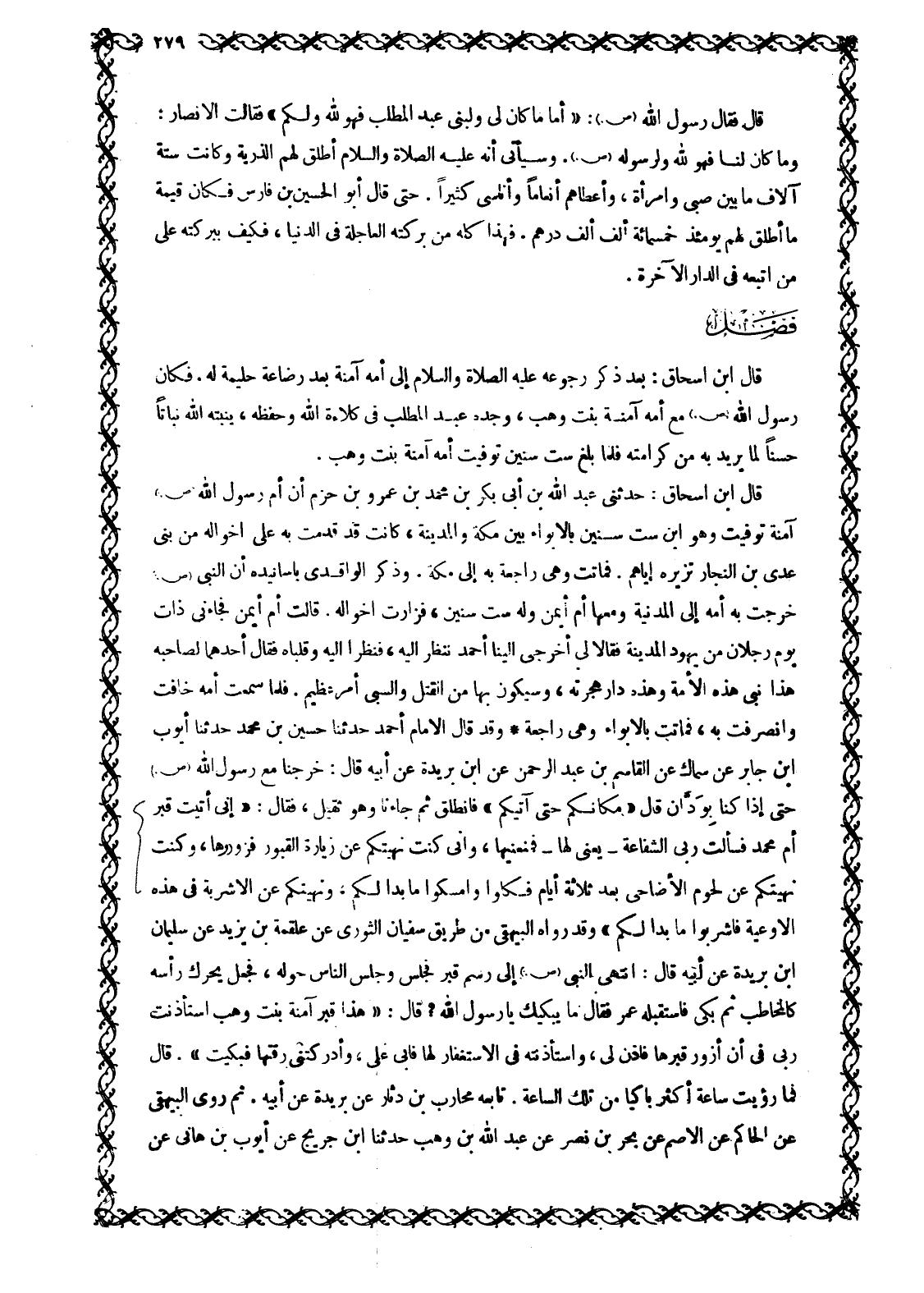 قَالَ ابْنُ إِسْحَاقَ: حَدَّثَنِي عَبْدُ اللَّهِ بْنُ أَبِي بَكْرِ بْنِ مُحَمَّدِ بْنِ عَمْرِو بْنِ حَزْمٍ أن أُمُّ رَسُولِ اللَّهِ صَلَّى اللَّهُ عَلَيْهِ وَسَلَّمَ آمِنَةَ تُوُفِّيَتْ وَهُوَ ابْنُ سِتِّ سِنِينَ بِالْأَبْوَاءِ بَيْنَ مَكَّةَ وَالْمَدِينَةِ، كَانَتْ قَدْ قَدِمَتْ بِهِ عَلَى أَخْوَالِهِ مِنْ بَنِي عَدِيِّ بْنِ النَّجَّارِ تُزِيرُهُ إِيَّاهُمْ. فَمَاتَتْ وَهِيَ رَاجِعَةٌ بِهِ إِلَى مَكَّةَ. وَذَكَرَ الْوَاقِدِيُّ بِأَسَانِيدِهِ أَنَّ النَّبِيَّ صَلَّى اللَّهُ عَلَيْهِ وَسَلَّمَ خَرَجَتْ بِهِ أُمُّهُ إِلَى المدينة ومعها أُمُّ أَيْمَنَ وَلَهُ سِتُّ سِنِينَ، فَزَارَتْ أَخْوَالَهُ. قَالَتْ أُمُّ أَيْمَنَ فَجَاءَنِي ذَاتَ يَوْمٍ رَجُلَانِ مِنْ يَهُودِ الْمَدِينَةِ فَقَالَا لِي أَخْرِجِي إِلَيْنَا أَحْمَدَ نَنْظُرُ إِلَيْهِ، فَنَظَرا إِلَيْهِ وَقَلَّبَاهُ فَقَالَ أَحَدُهُمَا لِصَاحِبِهِ هَذَا نَبِيُّ هَذِهِ الْأُمَّةِ وَهَذِهِ دَارُ هِجْرَتِهِ، وَسَيَكُونُ بِهَا مِنَ الْقَتْلِ وَالسَّبْيِ أَمْرٌ عَظِيمٌ. فَلَمَّا سَمِعَتْ أُمُّهُ خَافَتْ وَانْصَرَفَتْ به، فماتت بالأبواء وهي راجعة وَقَدْ قَالَ الْإِمَامُ أَحْمَدُ حَدَّثَنَا حُسَيْنُ بْنُ مُحَمَّدٍ حَدَّثَنَا أيوب ابن جَابِرٍ عَنْ سِمَاكٍ عَنِ الْقَاسِمِ بْنِ عَبْدِ الرَّحْمَنِ عَنِ ابْنِ بُرَيْدَةَ عَنْ أَبِيهِ قَالَ: خَرَجْنَا مَعَ رَسُولِ اللَّهِ صَلَّى اللَّهُ عَلَيْهِ وَسَلَّمَ حَتَّى إِذَا كُنَّا بِوَدَّانَ قَالَ «مَكَانَكُمْ حتى آتيكم» فانطلق ثم جاءنا وهو ثقيل، فَقَالَ: «إِنِّي أَتَيْتُ قَبْرَ أُمِّ مُحَمَّدٍ فَسَأَلْتُ رَبِّي الشَّفَاعَةَ- يَعْنِي لَهَا- فَمَنَعَنِيهَا، وَإِنِّي كُنْتُ نهيتكم عن زيارة القبور فزوروها، وكنت نهيتكم عَنْ لُحُومِ الْأَضَاحِي بَعْدَ ثَلَاثَةِ أَيَّامٍ فَكُلُوا وَأَمْسِكُوا مَا بَدَا لَكُمْ، وَنَهَيْتُكُمْ عَنِ الْأَشْرِبَةِ فِي هَذِهِ الْأَوْعِيَةِ فَاشْرَبُوا مَا بَدَا لَكُمْ» وَقَدْ رَوَاهُ الْبَيْهَقِيُّ مِنْ طَرِيقِ سُفْيَانَ الثَّوْرِيِّ عن علقمة بن يزيد عن سليمان ابن بُرَيْدَةَ عَنْ أَبِيهِ قَالَ: انْتَهَى النَّبِيُّ صَلَّى اللَّهُ عَلَيْهِ وَسَلَّمَ إِلَى رَسْمِ قَبْرٍ فَجَلَسَ وجلس الناس حوله، فَجَعَلَ يُحَرِّكُ رَأْسَهُ كَالْمُخَاطِبِ ثُمَّ بَكَى فَاسْتَقْبَلَهُ عمر فَقَالَ مَا يُبْكِيكَ يَا رَسُولَ اللَّهِ؟ قَالَ: «هَذَا قَبْرُ آمِنَةَ بِنْتِ وَهْبٍ اسْتَأْذَنْتُ رَبِّي فِي أَنْ أَزُورَ قَبْرَهَا فَأَذِنَ لِي، وَاسْتَأْذَنْتُهُ فِي الِاسْتِغْفَارِ لَهَا فَأَبَى عَلَيَّ، وَأَدْرَكَتْنِي رِقَّتُهَا فبكيت» . قال فما رئيت سَاعَةً أَكْثَرَ بَاكِيًا مِنْ تِلْكَ السَّاعَةِ. تَابَعَهُ مُحَارِبُ بْنُ دِثَارٍ عَنْ بُرَيْدَةَ عَنْ أَبِيهِ. ثُمَّ رَوَى الْبَيْهَقِيُّ عَنِ الْحَاكِمِ عَنِ الْأَصَمِّ عَنْ بَحْرِ بْنِ نَصْرٍ عَنْ عَبْدِ اللَّهِ بْنِ وَهْبٍ حَدَّثَنَا ابْنُ جُرَيْجٍ عَنْ أَيُّوبَ بن هاني عن