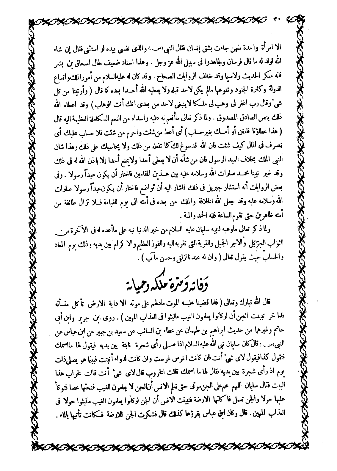إِلَّا امْرَأَةٌ وَاحِدَةٌ مِنْهُنَّ جَاءَتْ بِشِقِّ إِنْسَانٍ فَقَالَ النَّبِيُّ صَلَّى اللَّهُ عَلَيْهِ وَسَلَّمَ وَالَّذِي نَفْسِي بِيَدِهِ لَوِ اسْتَثْنَى فَقَالَ إِنْ شَاءَ اللَّهُ لَوُلِدَ لَهُ مَا قَالَ فُرْسَانٌ وَلَجَاهَدُوا فِي سَبِيلِ اللَّهِ عَزَّ وَجَلَّ. وَهَذَا إِسْنَادٌ ضَعِيفٌ لِحَالِ إِسْحَاقَ بْنِ بِشْرٍ فَإِنَّهُ مُنْكَرُ الْحَدِيثِ وَلَا سِيَّمَا وَقَدْ خَالَفَ الرِّوَايَاتِ الصِّحَاحَ. وَقَدْ كَانَ لَهُ عَلَيْهِ السَّلَامُ مِنْ أُمُورِ الْمُلْكِ وَاتِّسَاعِ الدَّوْلَةِ وَكَثْرَةِ الْجُنُودِ وَتَنَوُّعِهَا مَا لَمْ يَكُنْ لِأَحَدٍ قَبْلَهُ وَلَا يُعْطِيهِ اللَّهُ أَحَدًا بَعْدَهُ كَمَا قَالَ (وَأُوتِينا مِنْ كُلِّ شَيْءٍ 27: 16 وَقَالَ رَبِّ اغْفِرْ لِي وَهَبْ لِي مُلْكاً لَا يَنْبَغِي لِأَحَدٍ مِنْ بَعْدِي إِنَّكَ أَنْتَ الْوَهَّابُ) 38: 35 وَقَدْ أَعْطَاهُ اللَّهُ ذَلِكَ بِنَصِّ الصَّادِقِ الْمَصْدُوقِ. وَلَمَّا ذَكَرَ تَعَالَى مَا أَنْعَمَ بِهِ عَلَيْهِ وَأَسْدَاهُ مِنَ النِّعَمِ الْكَامِلَةِ الْعَظِيمَةِ إِلَيْهِ قَالَ (هَذَا عَطاؤُنا فَامْنُنْ أَوْ أَمْسِكْ بِغَيْرِ حِسابٍ) 38: 39 أَيْ أَعْطِ مَنْ شِئْتَ وَاحْرِمْ مَنْ شِئْتَ فَلَا حِسَابَ عَلَيْكَ أَيْ تَصَرَّفْ فِي الْمَالِ كَيْفَ شِئْتَ فَإِنَّ اللَّهَ قَدْ سَوَّغَ لَكَ كلما تَفْعَلُهُ مِنْ ذَلِكَ وَلَا يُحَاسِبُكَ عَلَى ذَلِكَ وَهَذَا شَأْنُ النَّبِيِّ الْمَلِكِ بِخِلَافِ الْعَبْدِ الرَّسُولِ فَإِنَّ مِنْ شَأْنِهِ أَنْ لَا يُعْطِيَ أَحَدًا وَلَا يَمْنَعَ أَحَدًا إِلَّا بِإِذْنِ اللَّهِ لَهُ فِي ذَلِكَ وَقَدْ خُيِّرَ نَبِيُّنَا مُحَمَّدٌ صَلَوَاتُ اللَّهِ وَسَلَامُهُ عَلَيْهِ بَيْنَ هَذَيْنِ الْمَقَامَيْنِ فَاخْتَارَ أَنْ يَكُونَ عَبْدًا رَسُولًا. وَفِي بَعْضِ الرِّوَايَاتِ أَنَّهُ اسْتَشَارَ جِبْرِيلَ فِي ذَلِكَ فَأَشَارَ إِلَيْهِ أَنْ تَوَاضَعْ فَاخْتَارَ أَنْ يَكُونَ عَبْدًا رَسُولًا صَلَوَاتُ اللَّهِ وَسَلَامُهُ عَلَيْهِ وَقَدْ جَعَلَ اللَّهُ الْخِلَافَةَ وَالْمُلْكَ مِنْ بَعْدِهِ فِي أُمَّتِهِ إِلَى يَوْمِ الْقِيَامَةِ فَلَا تَزَالُ طَائِفَةٌ مِنْ أُمَّتِهِ ظَاهِرِينَ حَتَّى تَقُومَ السَّاعَةُ فَلِلَّهِ الْحَمْدُ وَالْمِنَّةُ.