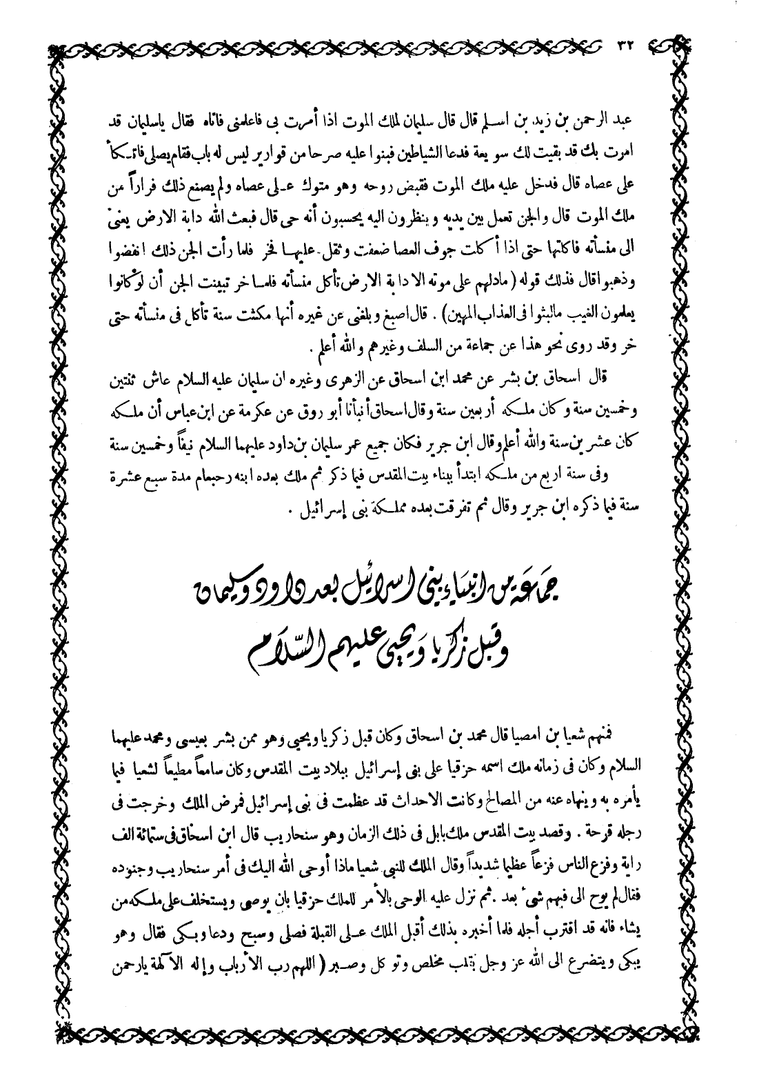 عَبْدِ الرَّحْمَنِ بْنِ زَيْدِ بْنِ أَسْلَمَ قَالَ قَالَ سُلَيْمَانُ لِمَلَكِ الْمَوْتِ إِذَا أُمِرْتَ بِي فَأَعْلِمْنِي فَأَتَاهُ فَقَالَ يَا سُلَيْمَانُ قَدْ أُمِرْتُ بِكَ قَدْ بَقِيَتْ لَكَ سُوَيْعَةٌ فَدَعَا الشَّيَاطِينَ فَبَنَوْا عَلَيْهِ صَرْحًا مِنْ قَوَارِيرَ لَيْسَ لَهُ بَابٌ فَقَامَ يُصَلِّي فَاتَّكَأَ عَلَى عَصَاهُ قَالَ فَدَخَلَ عَلَيْهِ مَلَكُ الْمَوْتِ فَقَبَضَ رُوحَهُ وَهُوَ متوك عَلَى عَصَاهُ وَلَمْ يَصْنَعْ ذَلِكَ فِرَارًا مِنْ مَلَكِ الْمَوْتِ قَالَ وَالْجِنُّ تَعْمَلُ بَيْنَ يَدَيْهِ وَيَنْظُرُونَ إِلَيْهِ يَحْسَبُونَ أَنَّهُ حَيٌّ قَالَ فَبَعَثَ اللَّهُ دَابَّةَ الْأَرْضِ يَعْنِي إِلَى مِنْسَأَتِهِ فَأَكْلَتْهَا حَتَّى إِذَا أَكَلَتْ جَوْفَ الْعَصَا ضَعُفَتْ وَثَقُلَ عَلَيْهَا فَخَرَّ فَلَمَّا رَأَتِ الْجِنُّ ذَلِكَ انْفَضُّوا وَذَهَبُوا قَالَ فَذَلِكَ قَوْلُهُ مَا دَلَّهُمْ عَلى مَوْتِهِ إِلَّا دَابَّةُ الْأَرْضِ تَأْكُلُ مِنْسَأَتَهُ فَلَمَّا خَرَّ تَبَيَّنَتِ الْجِنُّ أَنْ لَوْ كانُوا يَعْلَمُونَ الْغَيْبَ ما لَبِثُوا في الْعَذابِ الْمُهِينِ 34: 14. قَالَ أَصْبَغُ وَبَلَغَنِي عَنْ غَيْرِهِ أَنَّهَا مَكَثَتْ سَنَةً تَأْكُلُ فِي مِنْسَأَتِهِ حَتَّى خَرَّ وَقَدْ رُوِيَ نَحْوُ هَذَا عَنْ جَمَاعَةٍ مِنَ السَّلَفِ وَغَيْرِهِمْ وَاللَّهُ أَعْلَمُ.