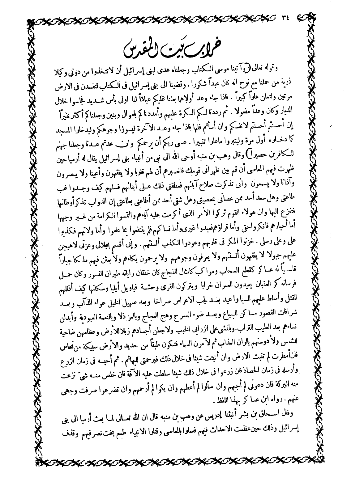 إِنْ أَحْسَنْتُمْ أَحْسَنْتُمْ لِأَنْفُسِكُمْ وَإِنْ أَسَأْتُمْ فَلَها فَإِذا جاءَ وَعْدُ الْآخِرَةِ لِيَسُوؤُا وُجُوهَكُمْ وَلِيَدْخُلُوا الْمَسْجِدَ كَما دَخَلُوهُ أَوَّلَ مَرَّةٍ وَلِيُتَبِّرُوا مَا عَلَوْا تَتْبِيراً. عَسى رَبُّكُمْ أَنْ يَرْحَمَكُمْ وَإِنْ عُدْتُمْ عُدْنا وَجَعَلْنا جَهَنَّمَ لِلْكافِرِينَ حَصِيراً 17: 2- 8 وَقَالَ وَهْبُ بْنُ مُنَبِّهٍ أَوْحَى اللَّهُ إِلَى نَبِيٍّ مِنْ أَنْبِيَاءِ بَنِي إِسْرَائِيلَ يُقَالُ لَهُ أَرْمِيَا حِينَ ظَهَرَتْ فِيهِمُ الْمَعَاصِي أَنْ قُمْ بَيْنَ ظَهْرَانَيْ قَوْمِكَ فَأَخْبِرْهُمْ أَنَّ لَهُمْ قُلُوبًا وَلَا يَفْقَهُونَ وَأَعْيُنًا وَلَا يُبْصِرُونَ وَآذَانًا وَلَا يَسْمَعُونَ وَإِنِّي تَذَكَّرْتُ صَلَاحَ آبَائِهِمْ فَعَطَفَنِي ذَلِكَ عَلَى أَبْنَائِهِمْ فَسَلْهُمْ كَيْفَ وَجَدُوا غِبَّ طَاعَتِي وَهَلْ سَعِدَ أَحَدٌ مِمَّنْ عَصَانِي بِمَعْصِيَتِي وَهَلْ شَقِيَ أَحَدٌ مِمَّنْ أَطَاعَنِي بِطَاعَتِي إِنِ الدَّوَابَّ تَذْكُرُ أَوْطَانَهَا فَتَنْزِعُ إِلَيْهَا وَإِنَّ هَؤُلَاءِ الْقَوْمَ تَرَكُوا الْأَمْرَ الَّذِي أَكْرَمْتُ عَلَيْهِ آبَاءَهُمْ وَالْتَمَسُوا الْكَرَامَةَ مِنْ غَيْرِ وَجْهِهَا أَمَّا أَحْبَارُهُمْ فَأَنْكَرُوا حَقِّي وَأَمَّا قُرَّاؤُهُمْ فَعَبَدُوا غَيْرِي وَأَمَّا نُسَّاكُهُمْ فَلَمْ يَنْتَفِعُوا بِمَا عَلِمُوا وَأَمَّا وُلَاتُهُمْ فَكَذَبُوا عَلَيَّ وَعَلَى رُسُلِي. خَزَنُوا الْمَكْرَ فِي قُلُوبِهِمْ وَعَوَّدُوا الْكَذِبَ أَلْسِنَتَهُمْ. وَإِنِّي أُقْسِمُ بِجَلَالِي وَعِزَّتِي لَأُهَيِّجَنَّ عَلَيْهِمْ جُيُولًا لَا يَفْقَهُونَ أَلْسِنَتَهُمْ وَلَا يَعْرِفُونَ وُجُوهَهُمْ وَلَا يَرْحَمُونَ بُكَاءَهُمْ وَلَأَبْعَثَنَّ فِيهِمْ مَلِكًا جَبَّارًا قَاسِيًا لَهُ عَسَاكِرُ كَقِطَعِ السَّحَابِ وَمَوَاكِبُ كَأَمْثَالِ الْفِجَاجِ كَأَنَّ خَفَقَانَ رَايَاتِهِ طَيَرَانُ النُّسُورِ وَكَأَنَّ حَمْلَ فُرْسَانِهِ كَرُّ الْعِقْبَانِ يُعِيدُونَ الْعُمْرَانَ خَرَابًا وَيَتْرُكُونَ الْقُرَى وَحْشَةً فَيَا وَيْلَ إيليا وسكانها كيف أذللهم للقتل وأسلط عليهم السبا وَأُعِيدُ بَعْدَ لَجَبِ الْأَعْرَاسِ صُرَاخًا وَبَعْدَ صَهِيلِ الْخَيْلِ عُوَاءَ الذِّئَابِ وَبَعْدَ شُرَافَاتِ الْقُصُورِ مَسَاكِنَ السِّبَاعِ وَبَعْدَ ضَوْءِ السُّرُجِ وَهَجَ الْعَجَاجِ وَبِالْعِزِّ ذلا وَبِالنِّعْمَةِ الْعُبُودِيَّةَ وَأُبَدِّلَنَّ نِسَاءَهُمْ بَعْدَ الطِّيبِ التُّرَابَ. وَبِالْمَشْيِ عَلَى الزَّرَابِيِّ الْخَبَبَ وَلَأَجْعَلَنَّ أَجْسَادَهُمْ زِبْلًا للأرض وعظامهن ضَاحِيَةً لِلشَّمْسِ وَلَأَدُوسَنَّهُمْ بِأَلْوَانِ الْعَذَابِ ثُمَّ لَآمُرَنَّ السماء فتكون طَبَقًا مِنْ حَدِيدٍ وَالْأَرْضَ سَبِيكَةً مِنْ نُحَاسٍ فَإِنْ أَمْطَرَتْ لَمْ تَنْبُتِ الْأَرْضُ وَإِنْ أَنْبَتَتْ شَيْئًا فِي خِلَالِ ذَلِكَ فَبِرَحْمَتِي لِلْبَهَائِمِ. ثُمَّ أَحْبِسُهُ فِي زَمَانِ الزَّرْعِ وَأُرْسِلُهُ فِي زَمَانِ الْحَصَادِ فَإِنْ زَرَعُوا فِي خِلَالِ ذَلِكَ شَيْئًا سَلَّطْتُ عَلَيْهِ الْآفَةَ فَإِنْ خَلُصَ مِنْهُ شَيْءٌ نَزَعْتُ مِنْهُ الْبَرَكَةَ فَإِنْ دَعَوْنِي لَمْ أُجِبْهُمْ وَإِنْ سَأَلُوا لَمْ أُعْطِهِمْ وَإِنْ بَكَوْا لَمْ أَرْحَمْهُمْ وَإِنْ تَضَرَّعُوا صَرَفْتُ وَجْهِي عَنْهُمْ. رَوَاهُ ابْنُ عَسَاكِرَ بِهَذَا اللَّفْظِ.