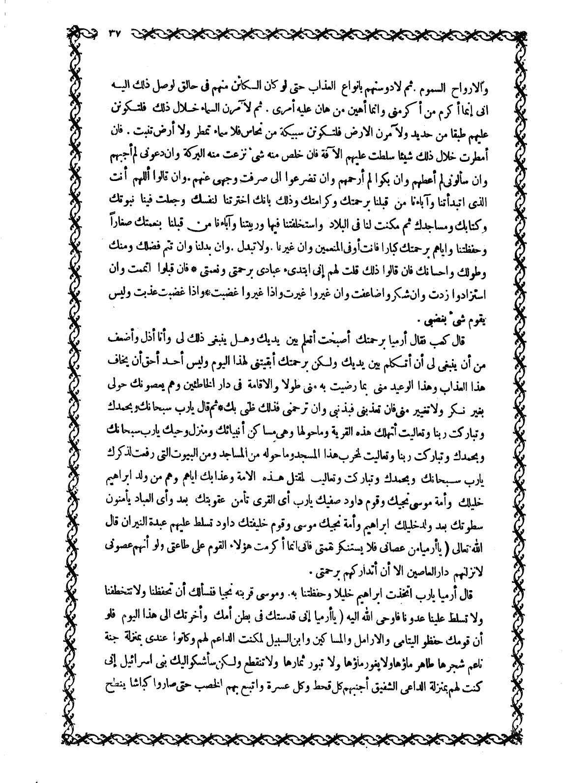 قَالَ أَرْمِيَا يَا رَبِّ اتَّخَذْتَ إِبْرَاهِيمَ خَلِيلًا وَحَفِظْتَنَا بِهِ. وَمُوسَى قَرَّبْتَهُ نَجَّيًا فَنَسْأَلُكَ أَنْ تَحْفَظَنَا وَلَا تَتَخَطَّفَنَا وَلَا تُسَلِّطَ عَلَيْنَا عَدُوَّنَا فَأَوْحَى اللَّهُ إِلَيْهِ (يَا أَرْمِيَا إِنِّي قَدَّسْتُكَ فِي بَطْنِ أُمِّكَ وَأَخَّرْتُكَ إِلَى هَذَا الْيَوْمِ فَلَوْ أَنَّ قَوْمَكَ حَفِظُوا الْيَتَامَى وَالْأَرَامِلَ وَالْمَسَاكِينَ وَابْنَ السبيل لمكنت الدَّاعِمَ لَهُمْ وَكَانُوا عِنْدِي بِمَنْزِلَةِ جَنَّةٍ نَاعِمٍ شَجَرُهَا طَاهِرٍ مَاؤُهَا وَلَا يَغُورُ مَاؤُهَا وَلَا تَبُورُ ثِمَارُهَا وَلَا تَنْقَطِعُ وَلَكِنْ سَأَشْكُو إِلَيْكَ بنى إسرائيل إني كنت لهم بمنزلة الداعي الشَّفِيقِ أُجَنِّبُهُمْ كُلَّ قَحْطٍ وَكُلَّ عُسْرَةٍ وَأُتْبِعُ بِهِمُ الْخَصْبَ حَتَّى صَارُوا كِبَاشًا يَنْطَحُ