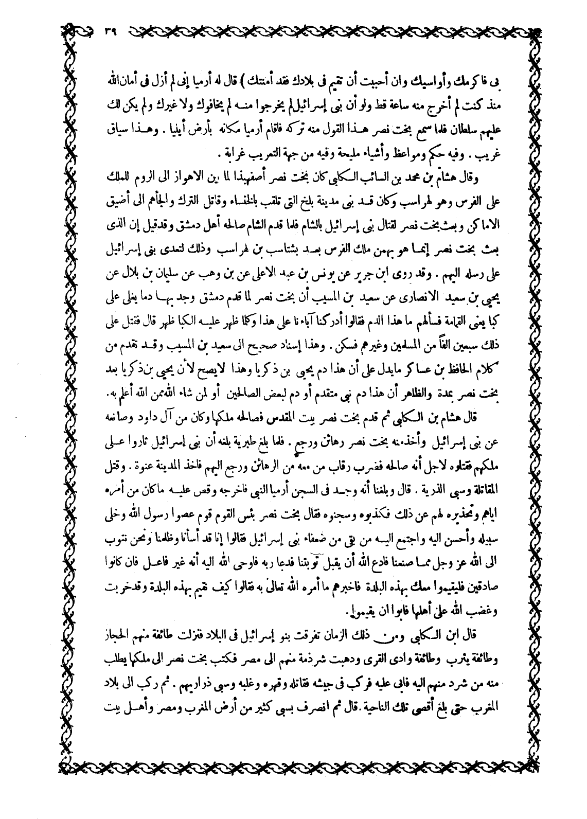 وَقَالَ هِشَامُ بْنُ مُحَمَّدِ بْنِ السَّائِبِ الْكَلْبِيُّ كَانَ نَصَّرَ أُصْفَهْبَذًا لِمَا بَيْنَ الْأَهْوَازِ إِلَى الرُّومِ لِلْمَلِكِ عَلَى الْفُرْسِ وَهُوَ لِهْرَاسْبُ وَكَانَ قَدْ بنى مدينة بلخ التي تلقب بالخنساء وَقَاتَلَ التُّرْكَ وَأَلْجَأَهُمْ إِلَى أَضْيَقِ الْأَمَاكِنِ وَبَعَثَ نَصَّرَ لِقِتَالِ بَنِي إِسْرَائِيلَ بِالشَّامِ فَلَمَّا قَدِمَ الشَّامَ صَالَحَهُ أَهْلُ دِمَشْقَ وَقَدْ قِيلَ إِنَّ الَّذِي بَعَثَ بُخْتُ نَصَّرَ إِنَّمَا هُوَ بَهْمَنُ مَلِكُ الْفُرْسِ بَعْدَ بَشْتَاسِبُ بْنِ لَهْرَاسِبُ وَذَلِكَ لِتَعَدِّي بَنِي إِسْرَائِيلَ عَلَى رُسُلِهِ إِلَيْهِمْ. وَقَدْ رَوَى ابْنُ جَرِيرٍ عَنْ يُونُسَ بْنِ عَبْدِ الأعلى عن بن وَهْبٍ عَنْ سُلَيْمَانَ بْنِ بِلَالٍ عَنْ يَحْيَى بْنِ سَعِيدٍ الْأَنْصَارِيِّ عَنْ سَعِيدِ بْنِ الْمُسَيِّبِ أَنَّ نَصَّرَ لَمَّا قَدِمَ دِمَشْقَ وَجَدَ بِهَا دَمًا يَغْلِي عَلَى كِبًا يَعْنِي الْقُمَامَةَ فَسَأَلَهُمْ مَا هَذَا الدَّمُ فَقَالُوا أَدْرَكْنَا آبَاءَنَا عَلَى هَذَا وَكُلَّمَا ظَهَرَ عَلَيْهِ الْكِبَا ظَهَرَ قَالَ فَقَتَلَ عَلَى ذَلِكَ سَبْعِينَ أَلْفًا مِنَ الْمُسْلِمِينَ وَغَيْرِهِمْ فَسَكَنَ. وَهَذَا إِسْنَادٌ صَحِيحٌ إِلَى سَعِيدِ بْنِ المسيب وقد تقدم من كلام الحافظ بن عَسَاكِرَ مَا يَدُلُّ عَلَى أَنَّ هَذَا دَمُ يَحْيَى بْنِ زَكَرِيَّا وَهَذَا لَا يَصِحُّ لِأَنَّ يحيى بن زكريا بعد نَصَّرَ بِمُدَّةٍ وَالظَّاهِرُ أَنَّ هَذَا دَمُ نَبِيٍّ مُتَقَدِّمٍ أَوْ دَمٌ لِبَعْضِ الصَّالِحِينَ أَوْ لِمَنْ شَاءَ اللَّهُ مِمَّنِ اللَّهُ أَعْلَمُ بِهِ.