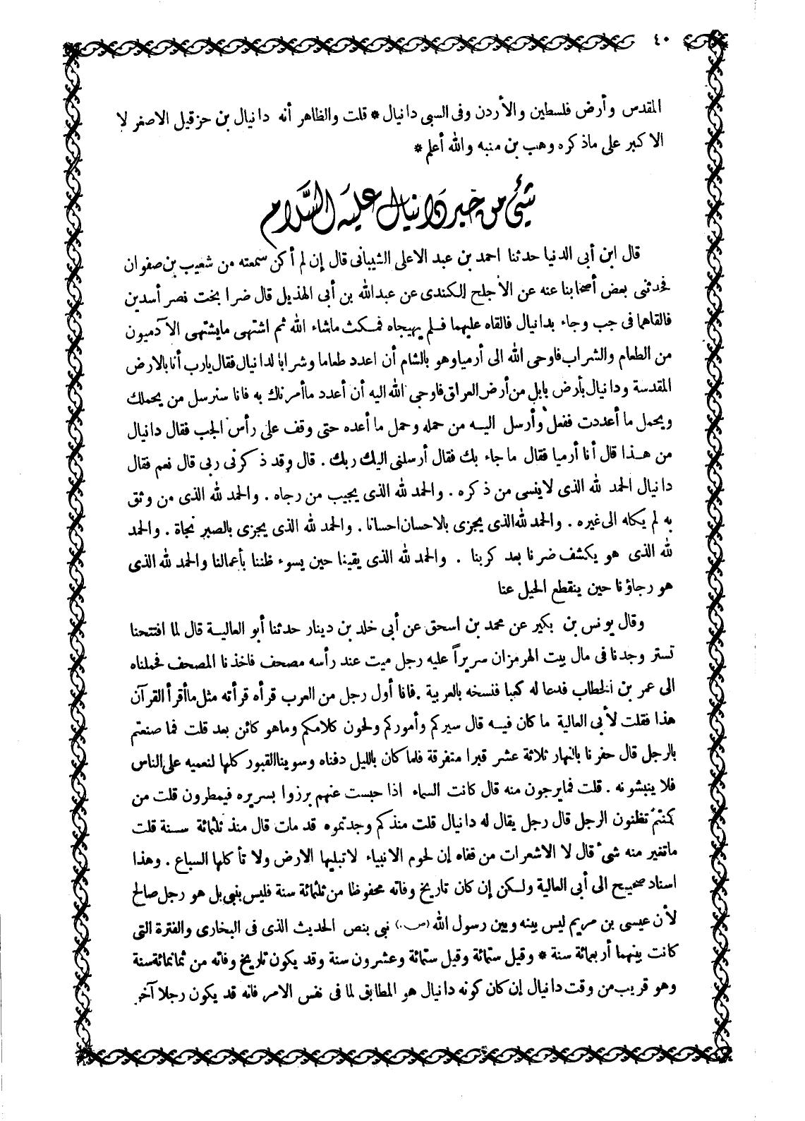 قَالَ ابْنُ أَبِي الدُّنْيَا حَدَّثَنَا أَحْمَدُ بْنُ عَبْدِ الْأَعْلَى الشَّيْبَانِيُّ قَالَ إِنْ لَمْ أَكُنْ سَمِعْتُهُ مِنْ شُعَيْبِ بْنِ صَفْوَانَ فَحَدَّثَنِي بَعْضُ أَصْحَابِنَا عَنْهُ عَنِ الْأَجْلَحِ الْكِنْدِيِّ عَنْ عَبْدِ اللَّهِ بْنِ أَبِي الْهُذَيْلِ قال ضرا نَصَّرَ أَسَدَيْنِ فَأَلْقَاهُمَا فِي جُبٍّ وَجَاءَ بِدَانْيَالَ فَأَلْقَاهُ عَلَيْهِمَا فَلَمْ يُهَيِّجَاهُ فَمَكَثَ مَا شَاءَ اللَّهُ ثُمَّ اشْتَهَى مَا يَشْتَهِي الْآدَمِيُّونَ مِنَ الطَّعَامِ وَالشَّرَابِ فَأَوْحَى اللَّهُ إِلَى أَرْمِيَا وَهُوَ بِالشَّامِ أَنْ أَعْدِدْ طَعَامًا وَشَرَابًا لِدَانْيَالَ فَقَالَ يَا رَبِّ أَنَا بِالْأَرْضِ الْمُقَدَّسَةِ وَدَانْيَالُ بِأَرْضِ بَابِلَ مِنْ أَرْضِ الْعِرَاقِ فَأَوْحَى اللَّهُ إِلَيْهِ أَنْ أَعْدِدْ مَا أَمَرْنَاكَ بِهِ فَإِنَّا سَنُرْسِلُ مَنْ يَحْمِلُكَ وَيَحْمِلُ مَا أَعْدَدْتَ فَفَعَلَ وَأَرْسَلَ اليه من حمله وحمل ما أعده حَتَّى وَقَفَ عَلَى رَأْسِ الْجُبِّ فَقَالَ دَانْيَالُ مَنْ هَذَا قَالَ أَنَا أَرْمِيَا فَقَالَ مَا جَاءَ بِكَ فَقَالَ أَرْسَلَنِي إِلَيْكَ رَبُّكَ. قَالَ وَقَدْ ذَكَرَنِي رَبِّي قَالَ نَعَمْ فَقَالَ دَانْيَالُ الْحَمْدُ للَّه الَّذِي لَا يَنْسَى مَنْ ذَكَرَهُ. والحمد للَّه الّذي يجيب مَنْ رَجَاهُ. وَالْحَمْدُ للَّه الَّذِي مَنْ وَثِقَ بِهِ لَمْ يَكِلْهُ إِلَى غَيْرِهِ. وَالْحَمْدُ للَّه الَّذِي يَجْزِي بِالْإِحْسَانِ إِحْسَانًا. وَالْحَمْدُ للَّه الَّذِي يَجْزِي بِالصَّبْرِ نَجَاةً. وَالْحَمْدُ للَّه الَّذِي هُوَ يَكْشِفُ ضُرَّنَا بَعْدَ كَرْبِنَا. وَالْحَمْدُ للَّه الَّذِي يقينا حين يسوء ظننا بِأَعْمَالِنَا وَالْحَمْدُ للَّه الَّذِي هُوَ رَجَاؤُنَا حِينَ ينقطع الْحِيَلُ عَنَّا وَقَالَ يُونُسُ بْنُ بُكَيْرٍ عَنْ مُحَمَّدِ بْنِ إِسْحَاقَ عن أبى خلد بْنِ دِينَارٍ حَدَّثَنَا أَبُو الْعَالِيَةِ قَالَ لَمَّا افْتَتَحْنَا تُسْتَرَ وَجَدْنَا فِي مَالِ بَيْتِ الْهُرْمُزَانِ سَرِيرًا عَلَيْهِ رَجُلٌ مَيِّتٌ عِنْدَ رَأْسِهِ مُصْحَفٌ فَأَخَذْنَا الْمُصْحَفَ فَحَمَلْنَاهُ إِلَى عُمَرَ بْنِ الْخَطَّابِ فَدَعَا لَهُ كَعْبًا فَنَسَخَهُ بِالْعَرَبِيَّةِ. فَأَنَا أَوَّلُ رَجُلٍ مِنَ الْعَرَبِ قَرَأَهُ قَرَأْتُهُ مِثْلَ مَا أَقْرَأُ الْقُرْآنَ هَذَا فَقُلْتُ لِأَبِي الْعَالِيَةِ مَا كَانَ فِيهِ قَالَ سِيَرُكُمْ وَأُمُورُكُمْ وَلُحُونُ كَلَامِكُمْ وَمَا هُوَ كَائِنٌ بَعْدُ قُلْتُ فَمَا صَنَعْتُمْ بِالرَّجُلِ قَالَ حَفَرْنَا بِالنَّهَارِ ثَلَاثَةَ عَشَرَ قَبْرًا مُتَفَرِّقَةً فَلَمَّا كَانَ بِاللَّيْلِ دَفَنَّاهُ وَسَوَّيْنَا الْقُبُورَ كُلَّهَا لِنُعَمِّيَهُ عَلَى النَّاسِ فَلَا يَنْبِشُونَهُ. قُلْتُ فَمَا يَرْجُونَ مِنْهُ قَالَ كَانَتِ السَّمَاءُ إِذَا حُبِسَتْ عَنْهُمْ بَرَزُوا بِسَرِيرِهِ فَيُمْطَرُونَ قُلْتُ مَنْ كُنْتُمْ تَظُنُّونَ الرَّجُلَ قَالَ رَجُلٌ يُقَالُ لَهُ دَانْيَالُ قُلْتُ مُنْذُ كَمْ وَجَدْتُمُوهُ قَدْ مَاتَ قَالَ مُنْذُ ثَلَاثِمِائَةِ سَنَةٍ قُلْتُ مَا تَغَيَّرَ مِنْهُ شَيْءٌ قَالَ لَا إِلَّا شَعَرَاتٌ مِنْ قَفَاهُ إِنَّ لُحُومَ الْأَنْبِيَاءِ لَا تُبْلِيهَا الْأَرْضُ وَلَا تَأْكُلُهَا السِّبَاعُ. وَهَذَا إِسْنَادٌ صَحِيحٌ إِلَى أَبِي الْعَالِيَةِ وَلَكِنْ إِنْ كَانَ تَارِيخُ وَفَاتِهِ مَحْفُوظًا مِنْ ثَلَاثِمِائَةِ سَنَةٍ فَلَيْسَ بِنَبِيٍّ بَلْ هو رجل صالح لأن عيسى بن مَرْيَمَ لَيْسَ بَيْنَهُ وَبَيْنَ رَسُولِ اللَّهِ صَلَّى اللَّهُ عَلَيْهِ وَسَلَّمَ نَبِيٌّ بِنَصِّ الْحَدِيثِ الَّذِي فِي الْبُخَارِيِّ وَالْفَتْرَةُ الَّتِي كَانَتْ بَيْنَهُمَا أَرْبَعُمِائَةِ سَنَةٍ وَقِيلَ سِتُّمِائَةٍ وَقِيلَ سِتُّ