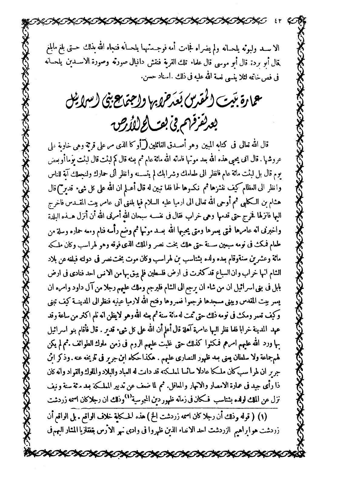 قَالَ اللَّهُ تَعَالَى فِي كِتَابِهِ الْمُبِينِ وَهُوَ أَصْدَقُ الْقَائِلِينَ أَوْ كَالَّذِي مَرَّ عَلى قَرْيَةٍ وَهِيَ خاوِيَةٌ عَلى عُرُوشِها. قَالَ أَنَّى يُحْيِي هذِهِ اللَّهُ بَعْدَ مَوْتِها فَأَماتَهُ اللَّهُ مِائَةَ عامٍ ثُمَّ بَعَثَهُ قَالَ كَمْ لَبِثْتَ قَالَ لَبِثْتُ يَوْماً أَوْ بَعْضَ يَوْمٍ قَالَ بَلْ لَبِثْتَ مِائَةَ عامٍ فَانْظُرْ إِلى طَعامِكَ وَشَرابِكَ لَمْ يَتَسَنَّهْ وَانْظُرْ إِلى حِمارِكَ وَلِنَجْعَلَكَ آيَةً لِلنَّاسِ وَانْظُرْ إِلَى الْعِظامِ كَيْفَ نُنْشِزُها ثُمَّ نَكْسُوها لَحْماً فَلَمَّا تَبَيَّنَ لَهُ قَالَ أَعْلَمُ أَنَّ اللَّهَ عَلى كُلِّ شَيْءٍ قَدِيرٌ) 2: 259 قَالَ هشام بن الْكَلْبِيِّ ثُمَّ أَوْحَى اللَّهُ تَعَالَى إِلَى أَرْمِيَا عَلَيْهِ السَّلَامُ فِيمَا بَلَغَنِي أَنَّى عَامِرٌ بَيْتَ الْمَقْدِسِ فَاخْرُجْ إِلَيْهَا فَانْزِلْهَا فَخَرَجَ حَتَّى قَدِمَهَا وَهِيَ خَرَابٌ فَقَالَ فِي نَفْسِهِ سُبْحَانَ اللَّهِ أَمَرَنِي اللَّهُ أَنْ أَنْزِلَ هَذِهِ الْبَلْدَةَ وَأَخْبَرَنِي أَنَّهُ عَامِرُهَا فَمَتَى يَعْمُرُهَا وَمَتَى يُحْيِيهَا اللَّهُ بَعْدَ مَوْتِهَا ثُمَّ وَضَعَ رَأْسَهُ فَنَامَ وَمَعَهُ حِمَارُهُ وَسَلَّةٌ مِنْ طَعَامٍ فَمَكَثَ فِي نَوْمِهِ سبعين سنة حتى هلك نَصَّرَ وَالْمَلِكُ الَّذِي فَوْقَهُ وَهُوَ لِهْرَاسْبُ وَكَانَ مُلْكُهُ مِائَةً وَعِشْرِينَ سَنَةً وَقَامَ بَعْدَهُ وَلَدُهُ بَشْتَاسِبُ بْنُ لِهْرَاسْبَ وَكَانَ مَوْتُ بُخْتُ نَصَّرَ فِي دَوْلَتِهِ فَبَلَغَهُ عَنْ بِلَادِ الشَّامِ أَنَّهَا خَرَابٌ وَأَنَّ السِّبَاعَ قَدْ كَثُرَتْ فِي أَرْضِ فِلَسْطِينَ فَلَمْ يَبْقَ بِهَا مِنَ الْإِنْسِ أَحَدٌ فَنَادَى فِي أَرْضِ بَابِلَ فِي بَنِي إِسْرَائِيلَ أَنَّ مَنْ شَاءَ أَنْ يَرْجِعَ إِلَى الشَّامِ فَلْيَرْجِعْ وَمَلَّكَ عَلَيْهِمْ رَجُلًا مِنْ آلِ دَاوُدَ وَأَمَرَهُ أَنْ يَعْمُرَ بَيْتَ الْمَقْدِسِ وَيَبْنِيَ مَسْجِدَهَا فَرَجَعُوا فَعَمَرُوهَا وَفَتَحَ اللَّهُ لِأَرْمِيَا عَيْنَيْهِ فَنَظَرَ إِلَى الْمَدِينَةِ كَيْفَ تُبْنَى وَكَيْفَ تُعَمَّرُ وَمَكَثَ فِي نَوْمِهِ ذَلِكَ حَتَّى تَمَّتْ لَهُ مِائَةُ سَنَةٍ ثُمَّ بَعَثَهُ اللَّهُ وَهُوَ لَا يَظُنُّ أَنَّهُ نَامَ أَكْثَرَ مِنْ سَاعَةٍ وَقَدْ عَهِدَ الْمَدِينَةَ خَرَابًا فَلَمَّا نَظَرَ إِلَيْهَا عَامِرَةً آهِلَةً قَالَ أَعْلَمُ أَنَّ اللَّهَ عَلَى كُلِّ شَيْءٍ قَدِيرٌ. قَالَ فَأَقَامَ بَنُو إِسْرَائِيلَ بِهَا وَرَدَّ اللَّهُ عَلَيْهِمْ أَمْرَهُمْ فَمَكَثُوا كَذَلِكَ حَتَّى غَلَبَتْ عَلَيْهِمُ الرُّومُ فِي زَمَنِ مُلُوكِ الطَّوَائِفِ. ثُمَّ لَمْ يَكُنْ لَهُمْ جَمَاعَةٌ وَلَا سُلْطَانٌ يَعْنِي بَعْدَ ظُهُورِ النَّصَارَى عَلَيْهِمْ. هَكَذَا حَكَاهُ ابْنُ جَرِيرٍ فِي تَارِيخِهِ عَنْهُ. وَذَكَرَ ابْنُ جَرِيرٍ أَنَّ لِهْرَاسْبَ كَانَ مَلِكًا عَادِلًا سَائِسًا لِمَمْلَكَتِهِ قَدْ دَانَتْ لَهُ الْعِبَادُ وَالْبِلَادُ وَالْمُلُوكُ وَالْقُوَّادُ وَأَنَّهُ كَانَ ذَا رَأْيٍ جَيِّدٍ فِي عِمَارَةِ الْأَمْصَارِ وَالْأَنْهَارِ وَالْمَعَاقِلِ. ثُمَّ لَمَّا ضَعُفَ عَنْ تَدْبِيرِ الْمَمْلَكَةِ بَعْدَ مِائَةِ سَنَةٍ وَنَيِّفٍ نَزَلَ عَنِ الْمُلْكِ لِوَلَدِهِ بَشْتَاسِبَ فَكَانَ فِي زَمَانِهِ ظُهُورُ دِينِ الْمَجُوسِيَّةِ [1] وَذَلِكَ أَنَّ رَجُلًا كَانَ اسمه زردشت