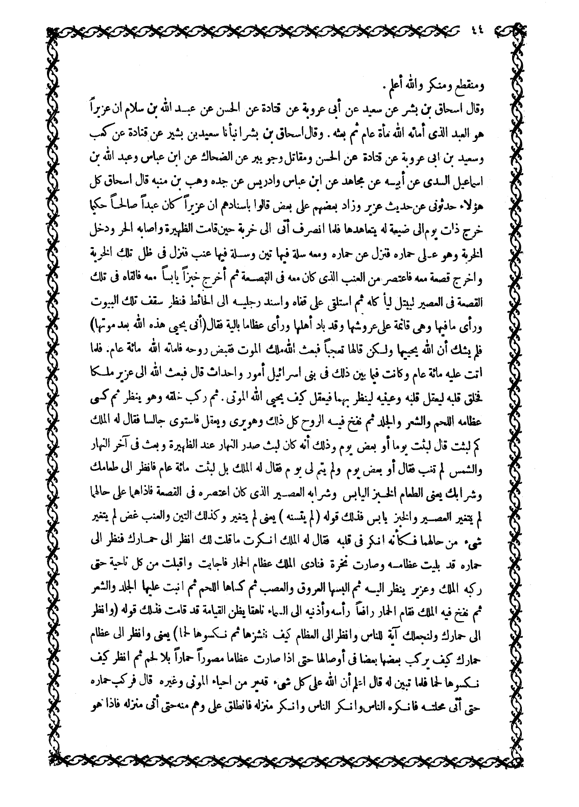 وَقَالَ إِسْحَاقُ بْنُ بشر عن سعيد عن أَبِي عَرُوبَةَ عَنْ قَتَادَةَ عَنِ الْحَسَنِ عَنْ عَبْدِ اللَّهِ بْنِ سَلَامٍ أَنَّ عُزَيْرًا هُوَ الْعَبْدُ الَّذِي أَمَاتَهُ اللَّهُ مِائَةَ عَامٍ ثُمَّ بَعَثَهُ. وَقَالَ إِسْحَاقُ بْنُ بِشْرٍ أَنْبَأَنَا سَعِيدُ بْنُ بَشِيرٍ عَنْ قَتَادَةَ عَنْ كَعْبٍ وَسَعِيدُ بْنِ أَبِي عَرُوبَةَ عَنْ قَتَادَةَ عَنِ الْحَسَنِ وَمُقَاتِلٌ وَجُوَيْبِرٌ عَنِ الضَّحَّاكِ عَنِ ابْنِ عَبَّاسٍ وَعَبْدُ اللَّهِ بْنُ إِسْمَاعِيلَ السُّدِّيُّ عَنْ أَبِيهِ عَنْ مُجَاهِدٍ عَنِ ابْنِ عَبَّاسٍ وَإِدْرِيسُ عَنْ جده وهب بن منبه قال إسحاق كُلُّ هَؤُلَاءِ حَدَّثُونِي عَنْ حَدِيثِ عُزَيْرٍ وَزَادَ بَعْضُهُمْ عَلَى بَعْضٍ قَالُوا بِإِسْنَادِهِمْ إِنَّ عُزَيْرًا كَانَ عَبْدًا صَالِحًا حَكِيمًا خَرَجَ ذَاتَ يَوْمٍ الى ضيعة له يتعاهدها فلما انصرف أتى إِلَى خَرِبَةٍ حِينَ قَامَتِ الظَّهِيرَةُ وَأَصَابَهُ الْحَرُّ وَدَخَلَ الْخَرِبَةَ وَهُوَ عَلَى حِمَارِهِ فَنَزَلَ عَنْ حِمَارِهِ وَمَعَهُ سَلَّةٌ فِيهَا تِينٌ وَسَلَّةٌ فِيهَا عِنَبٌ فَنَزَلَ فِي ظِلِّ تِلْكَ الْخَرِبَةِ وَأَخْرَجَ قَصْعَةً مَعَهُ فَاعْتَصَرَ مِنَ الْعِنَبِ الَّذِي كَانَ مَعَهُ فِي الْقَصْعَةِ ثُمَّ أَخْرَجَ خُبْزًا يَابِسًا مَعَهُ فَأَلْقَاهُ فِي تِلْكَ الْقَصْعَةِ فِي الْعَصِيرِ لِيَبْتَلَّ لِيَأْكُلَهُ ثُمَّ اسْتَلْقَى عَلَى قَفَاهُ وَأَسْنَدَ رِجْلَيْهِ إِلَى الْحَائِطِ فَنَظَرَ سَقْفَ تِلْكَ الْبُيُوتِ وَرَأَى مَا فِيهَا وَهِيَ قَائِمَةٌ عَلَى عُرُوشِهَا وَقَدْ بَادَ أَهْلُهَا وَرَأَى عِظَامًا بَالِيَةً فَقَالَ (أَنَّى يُحْيِي هذِهِ الله بَعْدَ مَوْتِها) 2: 259 فَلَمْ يَشُكَّ أَنَّ اللَّهَ يُحْيِيهَا وَلَكِنْ قَالَهَا تَعَجُّبًا فَبَعَثَ اللَّهُ مَلَكَ الْمَوْتِ فَقَبَضَ رُوحَهُ فَأَمَاتَهُ اللَّهُ مِائَةَ عَامٍ. فَلَمَّا أَتَتْ عَلَيْهِ مِائَةُ عَامٍ وَكَانَتْ فِيمَا بَيْنَ ذَلِكَ فِي بَنِي إِسْرَائِيلَ أُمُورٌ وَأَحْدَاثٌ قَالَ فَبَعَثَ اللَّهُ الى عزير ملكا فخلق قلبه ليعقل قلبه وَعَيْنَيْهِ لِيَنْظُرَ بِهِمَا فَيَعْقِلَ كَيْفَ يُحْيِي اللَّهُ الْمَوْتَى. ثُمَّ رَكَّبَ خَلْقَهُ وَهُوَ يَنْظُرُ ثُمَّ كَسَى عِظَامَهُ اللَّحْمَ وَالشَّعْرَ وَالْجِلْدَ ثُمَّ نَفَخَ فِيهِ الرُّوحَ كُلُّ ذَلِكَ وَهُوَ يَرَى وَيَعْقِلُ فَاسْتَوَى جَالِسًا فَقَالَ لَهُ الْمَلِكُ كَمْ لَبِثْتَ قال لبثت يوما أو بعض يوم وذلك أنه كان لبث صَدْرِ النَّهَارِ عِنْدَ الظَّهِيرَةِ وَبُعِثَ فِي آخِرِ النَّهَارِ وَالشَّمْسُ لَمْ تَغِبْ فَقَالَ أَوْ بَعْضَ يَوْمٍ وَلَمْ يَتِمَّ لِي يَوْمٌ فَقَالَ لَهُ الْمَلَكُ بَلْ لَبِثْتَ مِائَةَ عَامٍ فَانْظُرْ إِلَى طعامك وشرابك يَعْنِي الطَّعَامَ الْخُبْزَ الْيَابِسَ وَشَرَابَهُ الْعَصِيرَ الَّذِي كان اعتصره في القصعة فاذاهما عَلَى حَالِهِمَا لَمْ يَتَغَيَّرِ الْعَصِيرُ وَالْخُبْزُ يَابِسٌ فذلك قوله (لَمْ يَتَسَنَّهْ) 2: 259 يَعْنِي لَمْ يَتَغَيَّرْ وَكَذَلِكَ التِّينُ وَالْعِنَبُ غَضٌّ لم يتغير شَيْءٍ مِنْ حَالِهِمَا فَكَأَنَّهُ أَنْكَرَ فِي قَلْبِهِ فَقَالَ لَهُ الْمَلَكُ أَنْكَرْتَ مَا قُلْتُ لَكَ انظر الى حمارك فنظر الى حِمَارُهُ قَدْ بَلِيَتْ عِظَامُهُ وَصَارَتْ نَخِرَةً فَنَادَى الْمَلَكُ عِظَامَ الْحِمَارِ فَأَجَابَتْ وَأَقْبَلَتْ مِنْ كُلِّ نَاحِيَةٍ حَتَّى رَكَّبَهُ الْمَلَكُ وَعُزَيْرٌ يَنْظُرُ إِلَيْهِ ثُمَّ أَلْبَسَهَا الْعُرُوقَ وَالْعَصَبَ ثُمَّ كَسَاهَا اللَّحْمَ ثُمَّ أَنْبَتَ عَلَيْهَا الْجِلْدَ وَالشَّعْرَ ثُمَّ نَفَخَ فِيهِ الْمَلَكُ فَقَامَ الْحِمَارُ رَافِعًا رَأْسَهُ وَأُذُنَيْهِ إِلَى السَّمَاءِ نَاهِقًا يَظُنُّ الْقِيَامَةَ قَدْ قَامَتْ فذلك قوله (وَانْظُ