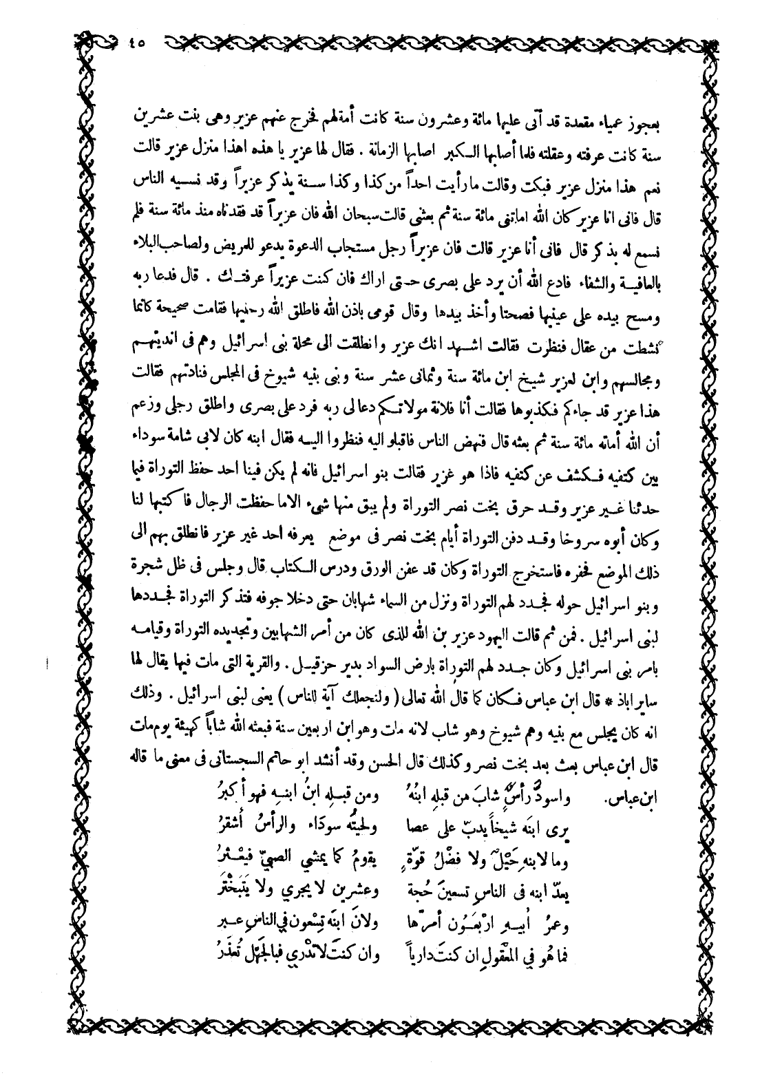 بِعَجُوزٍ عَمْيَاءَ مُقْعَدَةٍ قَدْ أَتَى عَلَيْهَا مِائَةٌ وَعِشْرُونَ سَنَةً كَانَتْ أَمَةً لَهُمْ فَخَرَجَ عَنْهُمْ عُزَيْرٌ وَهِيَ بِنْتُ عِشْرِينَ سَنَةً كَانَتْ عَرَفَتْهُ وَعَقَلَتْهُ فَلَمَّا أَصَابَهَا الْكِبَرُ أَصَابَهَا الزَّمَانَةُ. فَقَالَ لَهَا عُزَيْرٌ يَا هَذِهِ أَهَذَا مَنْزِلُ عُزَيْرٍ قَالَتْ نَعَمْ هَذَا مَنْزِلُ عُزَيْرٍ فَبَكَتْ وَقَالَتْ مَا رَأَيْتُ أَحَدًا مِنْ كَذَا وَكَذَا سَنَةٍ يَذْكُرُ عُزَيْرًا وَقَدْ نَسِيَهُ النَّاسُ قَالَ فَإِنِّي أَنَا عُزَيْرٌ كَانَ اللَّهُ أَمَاتَنِي مِائَةَ سَنَةٍ ثُمَّ بَعَثَنِي قَالَتْ سُبْحَانَ اللَّهِ فَإِنَّ عُزَيْرًا قَدْ فَقَدْنَاهُ مُنْذُ مِائَةِ سَنَةٍ فَلَمْ نَسْمَعْ لَهُ بِذِكْرٍ قَالَ فَإِنِّي أَنَا عُزَيْرٌ قَالَتْ فَإِنَّ عُزَيْرًا رَجُلٌ مُسْتَجَابُ الدَّعْوَةِ يَدْعُو لِلْمَرِيضِ وَلِصَاحِبِ الْبَلَاءِ بِالْعَافِيَةِ وَالشِّفَاءِ فَادْعُ اللَّهَ أَنْ يَرُدَّ عَلَيَّ بَصَرِي حَتَّى أَرَاكَ فَإِنْ كُنْتَ عُزَيْرًا عَرَفْتُكَ. قَالَ فَدَعَا رَبَّهُ وَمَسَحَ بِيَدِهِ عَلَى عَيْنَيْهَا فَصَحَّتَا وَأَخَذَ بِيَدِهَا وَقَالَ قُومِي بِإِذْنِ اللَّهِ فَأَطْلَقَ اللَّهُ رِجْلَيْهَا فَقَامَتْ صَحِيحَةً كَأَنَّمَا نَشِطَتْ مِنْ عِقَالٍ فَنَظَرَتْ فَقَالَتْ أَشْهَدُ أَنَّكَ عُزَيْرٌ وَانْطَلَقَتْ إِلَى مَحِلَّةِ بَنِي إِسْرَائِيلَ وَهُمْ فِي أَنْدِيَتِهِمْ وَمَجَالِسِهِمْ وَابْنٌ لِعُزَيْرٍ شَيْخٌ ابن مائة سنة وثماني عشر سنة وبنى بَنِيهِ شُيُوخٌ فِي الْمَجْلِسِ فَنَادَتْهُمْ فَقَالَتْ هَذَا عُزَيْرٌ قَدْ جَاءَكُمْ فَكَذَّبُوهَا فَقَالَتْ أَنَا فُلَانَةٌ مَوْلَاتُكُمْ دَعَا لِي رَبَّهُ فَرَدَّ عَلَيَّ بَصَرِي وَأَطْلَقَ رِجْلَيَّ وَزَعَمَ أَنَّ اللَّهَ أَمَاتَهُ مِائَةَ سَنَةٍ ثُمَّ بَعَثَهُ قَالَ فَنَهَضَ النَّاسُ فَأَقْبَلُوا إِلَيْهِ فَنَظَرُوا إِلَيْهِ فَقَالَ ابْنُهُ كَانَ لِأَبِي شَامَةٌ سَوْدَاءُ بَيْنَ كَتِفَيْهِ فَكَشَفَ عَنْ كَتِفَيْهِ فَإِذَا هُوَ عُزَيْرٌ فَقَالَتْ بَنُو إِسْرَائِيلَ فَإِنَّهُ لَمْ يَكُنْ فِينَا أَحَدٌ حَفِظَ التَّوْرَاةَ فِيمَا حدثنا غير عزير وقد حرق نَصَّرَ التَّوْرَاةَ وَلَمْ يَبْقَ مِنْهَا شَيْءٌ إِلَّا مَا حَفِظَتِ الرِّجَالُ فَاكْتُبْهَا لَنَا وَكَانَ أَبُوهُ سروخا وقد دفن التوراة أيام نَصَّرَ فِي مَوْضِعٍ لَمْ يَعْرِفْهُ أَحَدٌ غَيْرُ عُزَيْرٍ فَانْطَلَقَ بِهِمْ إِلَى ذَلِكَ الْمَوْضِعِ فَحَفَرَهُ فَاسْتَخْرَجَ التَّوْرَاةَ وَكَانَ قَدْ عَفِنَ الْوَرَقُ وَدَرَسَ الْكِتَابُ قَالَ وَجَلَسَ فِي ظِلِّ شَجَرَةٍ وَبَنُو إِسْرَائِيلَ حَوْلَهُ فَجَدَّدَ لَهُمُ التَّوْرَاةَ وَنَزَلَ مِنَ السَّمَاءِ شِهَابَانِ حَتَّى دَخَلَا جَوْفَهُ فَتَذَكَّرَ التَّوْرَاةَ فَجَدَّدَهَا لِبَنِي إِسْرَائِيلَ. فَمِنْ ثَمَّ قَالَتِ الْيَهُودُ عزير بن الله لِلَّذِي كَانَ مِنْ أَمْرِ الشِّهَابَيْنِ وَتَجْدِيدِهِ التَّوْرَاةَ وَقِيَامِهِ بِأَمْرِ بَنِي إِسْرَائِيلَ وَكَانَ جَدَّدَ لَهُمُ التَّوْرَاةَ بِأَرْضِ السَّوَادِ بِدَيْرِ حَزْقِيلَ. وَالْقَرْيَةُ الَّتِي مَاتَ فِيهَا يُقَالُ لَهَا سَايْرَابَاذَ قَالَ ابْنُ عَبَّاسٍ فَكَانَ كَمَا قَالَ اللَّهُ تَعَالَى وَلِنَجْعَلَكَ آيَةً لِلنَّاسِ 2: 259 يَعْنِي لِبَنِي إِسْرَائِيلَ. وَذَلِكَ أَنَّهُ كَانَ يَجْلِسُ مَعَ بَنِيهِ وَهُمْ شُيُوخٌ وَهُوَ شَابٌّ لِأَنَّهُ مَاتَ وَهُوَ ابْنُ أَرْبَعِينَ سَنَةً فَبَعَثَهُ اللَّهُ شَابًّا كَهَيْئَةِ يَوْمَ مَاتَ قَالَ ابْنُ عَبَّاسٍ بعث بعد نَصَّرَ وَكَذَلِكَ قَالَ الْحَسَنُ وَقَدْ أَنْشَدَ أَبُو حَاتِمٍ السِّجِسْتَانِيُّ فِي مَعْنَى مَا قَالَهُ ابْنُ عَبَّاسٍ.