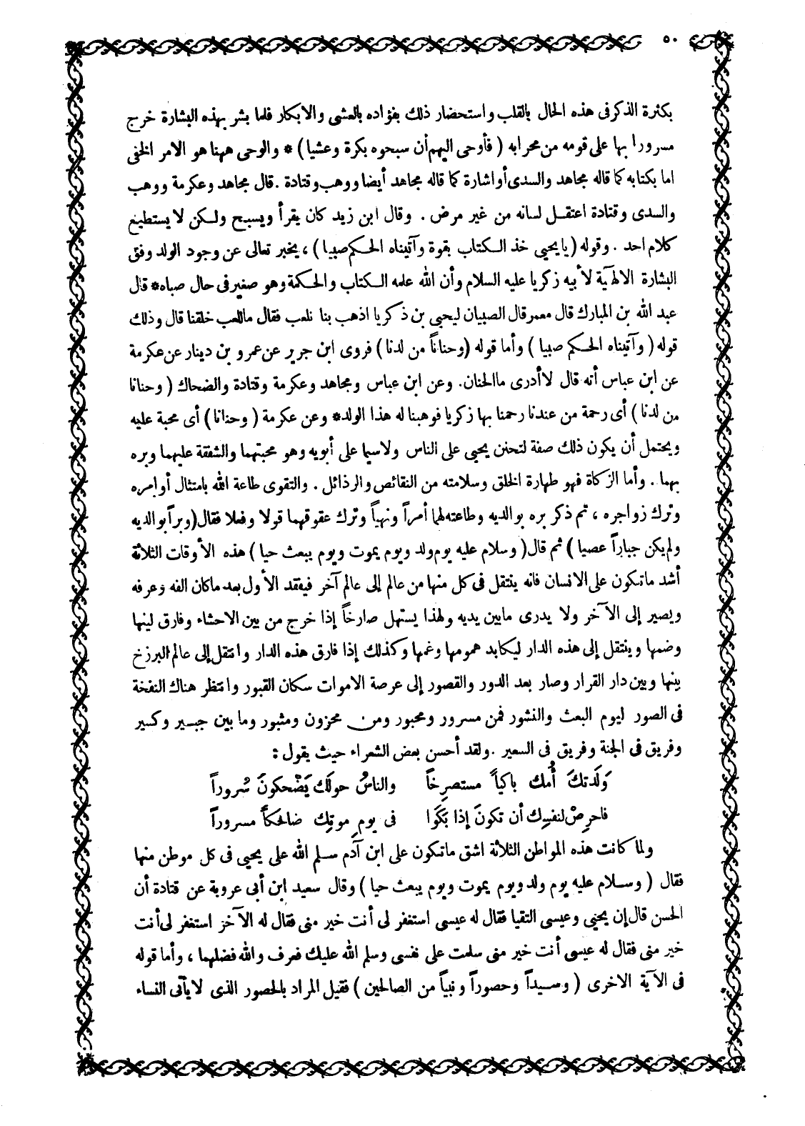 بِكَثْرَةِ الذِّكْرِ فِي هَذِهِ الْحَالِ بِالْقَلْبِ وَاسْتِحْضَارِ ذَلِكَ بِفُؤَادِهِ بِالْعَشِيِّ وَالْإِبْكَارِ فَلَمَّا بُشِّرَ بِهَذِهِ الْبِشَارَةِ خَرَجَ مَسْرُورًا بِهَا عَلَى قَوْمِهِ مِنْ مِحْرَابِهِ (فَأَوْحى إِلَيْهِمْ أَنْ سَبِّحُوا بُكْرَةً وَعَشِيًّا) 19: 11 وَالْوَحْيُ هَاهُنَا هُوَ الْأَمْرُ الْخَفِيُّ إِمَّا بِكِتَابَةٍ كَمَا قَالَهُ مُجَاهِدٌ وَالسُّدِّيُّ أَوْ إِشَارَةٍ كَمَا قَالَهُ مُجَاهِدٌ أَيْضًا وَوَهْبٌ وَقَتَادَةُ. قَالَ مُجَاهِدٌ وَعِكْرِمَةُ وَوَهُبٌ وَالسُّدِّيُّ وَقَتَادَةُ اعْتُقِلَ لِسَانُهُ مِنْ غَيْرِ مَرَضٍ. وَقَالَ ابْنُ زَيْدٍ كَانَ يَقْرَأُ وَيُسَبِّحُ وَلَكِنْ لَا يَسْتَطِيعُ كَلَامَ أَحَدٍ. وَقَوْلُهُ (يَا يَحْيى خُذِ الْكِتابَ بِقُوَّةٍ وَآتَيْناهُ الْحُكْمَ صَبِيًّا) 19: 12، يُخْبِرُ تَعَالَى عَنْ وُجُودِ الْوَلَدِ وَفْقَ الْبِشَارَةِ الْإِلَهِيَّةِ لِأَبِيهِ زَكَرِيَّا عَلَيْهِ السَّلَامُ وَأَنَّ اللَّهَ عَلَّمَهُ الْكِتَابَ وَالْحِكْمَةَ وَهُوَ صَغِيرٌ فِي حَالِ صِبَاهُ قَالَ عَبْدُ اللَّهِ بْنُ الْمُبَارَكِ قَالَ مَعْمَرٌ قَالَ الصِّبْيَانُ لِيَحْيَى بْنِ زَكَرِيَّا اذْهَبْ بِنَا نَلْعَبُ فَقَالَ مَا لِلَّعِبِ خُلِقْنَا قَالَ وذلك قوله (وَآتَيْناهُ الْحُكْمَ صَبِيًّا) 19: 12 وأما قوله (وَحَناناً من لَدُنَّا) 19: 13 فَرَوَى ابْنُ جَرِيرٍ عَنْ عَمْرِو بْنِ دِينَارٍ عَنْ عِكْرِمَةَ عَنِ ابْنِ عَبَّاسٍ أَنَّهُ قَالَ لَا أَدْرِي مَا الْحَنَانُ. وَعَنِ ابْنِ عَبَّاسٍ وَمُجَاهِدٍ وَعِكْرِمَةَ وَقَتَادَةَ وَالضَّحَّاكِ (وَحَناناً مِنْ لَدُنَّا) 19: 13 أَيْ رَحْمَةً مِنْ عِنْدِنَا رَحِمْنَا بِهَا زَكَرِيَّا فَوَهَبْنَا لَهُ هَذَا الْوَلَدَ وَعَنْ عِكْرِمَةَ (وَحَناناً) 19: 13 أَيْ مَحَبَّةً عَلَيْهِ وَيَحْتَمِلُ أَنْ يَكُونَ ذَلِكَ صِفَةً لِتَحَنُّنِ يَحْيَى عَلَى النَّاسِ وَلَا سِيَّمَا عَلَى أَبَوَيْهِ وَهُوَ مَحَبَّتُهُمَا وَالشَّفَقَةُ عَلَيْهِمَا وَبِرُّهُ بِهِمَا. وَأَمَّا الزَّكَاةُ فَهُوَ طَهَارَةُ الْخُلُقِ وَسَلَامَتُهُ مِنَ النَّقَائِصِ وَالرَّذَائِلِ. وَالتَّقْوَى طَاعَةُ اللَّهِ بِامْتِثَالِ أَوَامِرِهِ وَتَرْكِ زَوَاجِرِهِ، ثُمَّ ذَكَرَ بِرَّهُ بِوَالِدَيْهِ وَطَاعَتَهُ لَهُمَا أَمْرًا وَنَهْيًا وَتَرْكَ عُقُوقِهِمَا قَوْلًا وَفِعْلًا فَقَالَ (وَبَرًّا بِوالِدَيْهِ وَلَمْ يَكُنْ جَبَّاراً عَصِيًّا) 19: 14 ثُمَّ قَالَ (وَسَلامٌ عَلَيْهِ يَوْمَ وُلِدَ وَيَوْمَ يَمُوتُ وَيَوْمَ يُبْعَثُ حَيًّا) 19: 15 هَذِهِ الْأَوْقَاتُ الثَّلَاثَةُ أَشَدُّ مَا تَكُونُ عَلَى الْإِنْسَانِ فَإِنَّهُ يَنْتَقِلُ فِي كُلٍّ مِنْهَا مِنْ عَالَمٍ إِلَى عَالَمٍ آخَرَ فَيَفْقِدُ الْأَوَّلَ بَعْدَ مَا كَانَ أَلِفَهُ وَعَرَفَهُ وَيَصِيرُ إِلَى الْآخَرِ وَلَا يَدْرِي مَا بَيْنَ يَدَيْهِ وَلِهَذَا يَسْتَهِلُّ صَارِخًا إِذَا خَرَجَ مِنْ بَيْنِ الْأَحْشَاءِ وَفَارَقَ لِينَهَا وَضَمَّهَا وَيَنْتَقِلُ إِلَى هَذِهِ الدَّارِ لِيُكَابِدَ همومها وغمها وَكَذَلِكَ إِذَا فَارَقَ هَذِهِ الدَّارَ وَانْتَقَلَ إِلَى عَالَمِ الْبَرْزَخِ بَيْنَهَا وَبَيْنَ دَارِ الْقَرَارِ وَصَارَ بَعْدَ الدُّورِ وَالْقُصُورِ إِلَى عَرْصَةِ الْأَمْوَاتِ سُكَّانِ الْقُبُورِ وَانْتَظَرَ هُنَاكَ النَّفْخَةَ فِي الصُّوَرِ لِيَوْمِ الْبَعْثِ وَالنُّشُورِ فَمِنْ مَسْرُورٍ وَمَحْبُورٍ وَمِنْ مَحْزُونٍ ومثبور وما بين جبير وكسير وَفَرِيقٍ فِي الْجَنَّةِ وَفَرِيقٍ فِي السَّعِيرِ. وَلَقَدْ أحسن بعض الشعراء حيث يقول: