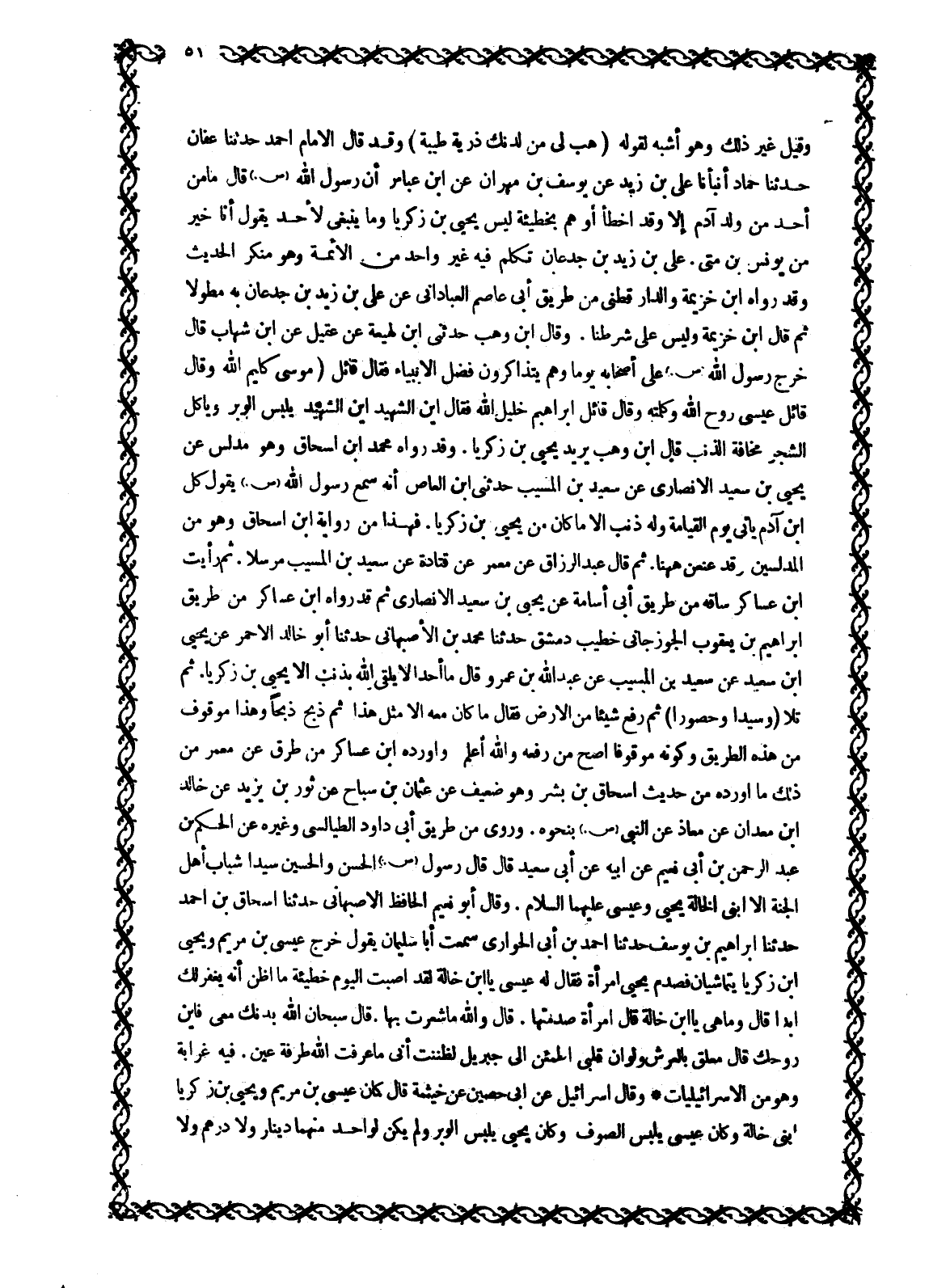 وَقِيلَ غَيْرُ ذَلِكَ وَهُوَ أَشْبَهُ لِقَوْلِهِ (هَبْ لِي من لَدُنْكَ ذُرِّيَّةً طَيِّبَةً) 3: 38 وَقَدْ قَالَ الْإِمَامُ أَحْمَدُ حَدَّثَنَا عَفَّانُ حَدَّثَنَا حَمَّادٌ أَنْبَأَنَا عَلِيُّ بْنُ زَيْدٍ عَنْ يُوسُفَ بْنِ مِهْرَانَ عَنِ ابْنِ عَبَّاسٍ أَنَّ رَسُولَ اللَّهِ صَلَّى اللَّهُ عَلَيْهِ وَسَلَّمَ قَالَ مَا مِنْ أَحَدٍ مِنْ وَلَدِ آدَمَ إِلَّا وَقَدْ أَخْطَأَ أَوْ هَمَّ بِخَطِيئَةٍ لَيْسَ يَحْيَى بْنُ زكريا وما ينبغي لأحد يَقُولَ أَنَا خَيْرٌ مِنْ يُونُسَ بْنِ مَتَّى. عَلِيُّ بْنُ زَيْدِ بْنِ جُدْعَانَ تَكَلَّمَ فِيهِ غَيْرُ وَاحِدٍ مِنَ الْأَئِمَّةِ وَهُوَ مُنْكَرُ الْحَدِيثِ وَقَدْ رَوَاهُ ابْنُ خُزَيْمَةَ وَالدَّارَقُطْنِيُّ مِنْ طَرِيقِ أَبِي عَاصِمٍ الْعَبَّادَانِيِّ عَنْ عَلِيِّ بْنِ زَيْدِ بْنِ جُدْعَانَ بِهِ مُطَوَّلًا ثُمَّ قَالَ ابْنُ خُزَيْمَةَ وَلَيْسَ عَلَى شَرْطِنَا. وَقَالَ ابْنُ وَهْبٍ حَدَّثَنِي ابْنُ لَهِيعَةَ عَنْ عُقَيْلٍ عَنِ ابْنِ شِهَابٍ قَالَ خَرَجَ رَسُولُ اللَّهِ صَلَّى اللَّهُ عَلَيْهِ وَسَلَّمَ عَلَى أَصْحَابِهِ يَوْمًا وَهُمْ يَتَذَاكَرُونَ فَضْلَ الْأَنْبِيَاءِ فَقَالَ قَائِلٌ (مُوسَى كَلِيمُ اللَّهِ وقال قائل عيسى روح الله وكلمته وقال قائل إبراهيم خليل الله فَقَالَ أَيْنَ الشَّهِيدُ أَيْنَ الشَّهِيدُ يَلْبَسُ الْوَبَرَ وَيَأْكُلُ الشَّجَرَ مَخَافَةَ الذَّنْبِ قَالَ ابْنُ وَهْبٍ يُرِيدُ يَحْيَى بْنَ زَكَرِيَّا. وَقَدْ رَوَاهُ مُحَمَّدُ ابن إِسْحَاقَ وَهُوَ مُدَلِّسٌ عَنْ يَحْيَى بْنِ سَعِيدٍ الْأَنْصَارِيِّ عَنْ سَعِيدِ بْنِ الْمُسَيِّبِ حَدَّثَنِي ابْنُ الْعَاصِ أَنَّهُ سَمِعَ رَسُولَ اللَّهِ صَلَّى اللَّهُ عَلَيْهِ وَسَلَّمَ يَقُولُ كُلُّ ابْنِ آدَمَ يَأْتِي يَوْمَ الْقِيَامَةِ وَلَهُ ذَنْبٌ إِلَّا مَا كَانَ مِنْ يَحْيَى بْنِ زَكَرِيَّا. فَهَذَا مِنْ رِوَايَةِ ابْنِ إِسْحَاقَ وَهُوَ مِنَ الْمُدَلِّسِينَ وَقَدْ عَنْعَنَ هاهنا. ثم قال عَبْدُ الرَّزَّاقِ عَنْ مَعْمَرٍ عَنْ قَتَادَةَ عَنِ سَعِيدِ بْنِ الْمُسَيِّبِ مُرْسَلًا. ثُمَّ رَأَيْتُ ابْنَ عَسَاكِرَ سَاقَهُ مِنْ طَرِيقِ أَبِي أُسَامَةَ عَنْ يحيى بن سعيد الأنصاري ثُمَّ قَدْ رَوَاهُ ابْنُ عَسَاكِرَ مِنْ طَرِيقِ إِبْرَاهِيمَ بْنِ يَعْقُوبَ الْجُوزْجَانِيِّ خَطِيبِ دِمَشْقَ حَدَّثَنَا مُحَمَّدُ بْنُ الْأَصْبَهَانِيِّ حَدَّثَنَا أَبُو خَالِدٍ الْأَحْمَرُ عن يحيى ابن سَعِيدٍ عَنْ سَعِيدِ بْنِ الْمُسَيِّبِ عَنْ عَبْدِ اللَّهِ بن عمرو قال ما أحدا لا يَلْقَى اللَّهَ بِذَنْبٍ إِلَّا يَحْيَى بْنَ زَكَرِيَّا. ثم تلا (وَسَيِّداً وَحَصُوراً) 3: 39 ثُمَّ رَفَعَ شَيْئًا مِنَ الْأَرْضِ فَقَالَ مَا كَانَ مَعَهُ إِلَّا مِثْلُ هَذَا. ثُمَّ ذُبِحَ ذَبْحًا وَهَذَا مَوْقُوفٌ مِنْ هَذِهِ الطَّرِيقِ وَكَوْنُهُ مَوْقُوفًا أَصَحُّ مِنْ رَفْعِهِ وَاللَّهُ أَعْلَمُ. وَأَوْرَدَهُ ابْنُ عَسَاكِرَ مِنْ طُرُقٍ عَنْ مَعْمَرٍ مِنْ ذَلِكَ مَا أَوْرَدَهُ مِنْ حَدِيثِ إِسْحَاقَ بْنِ بشر وهو ضعيف عن عثمان بن سباح عن ثور بن يزيد عن خالد ابن مَعْدَانَ عَنْ مُعَاذٍ عَنِ النَّبِيِّ صَلَّى اللَّهُ عَلَيْهِ وَسَلَّمَ بِنَحْوِهِ. وَرُوِيَ مِنْ طَرِيقِ أَبِي دَاوُدَ الطَّيَالِسِيِّ وَغَيْرِهِ عَنِ الْحَكَمِ بْنِ عَبْدِ الرَّحْمَنِ بْنِ أَبِي نعيم عَنْ أَبِيهِ عَنْ أَبِي سَعِيدٍ قَالَ قَالَ رسول صَلَّى اللَّهُ عَلَيْهِ وَسَلَّمَ الْحَسَنُ وَالْحُسَيْنُ سَيِّدَا شَبَابِ أَهْلِ الْجَنَّةِ إِلَّا ابْنَيِ الْخَالَةِ يَحْيَى وعيسى عليهما السَّلَامُ. وَقَالَ أَبُو نُعَيْمٍ الْحَافِظُ الْأَصْبَهَانِيُّ حَدَّثَنَا إِسْحَاقُ بْنُ أَحْمَدَ حَدَّثَنَا إِبْرَاهِيمُ بْنُ يُوسُفَ حَدَّثَنَا أَحْمَدُ بْنُ أَبِي الْحَوَارِيِّ سَمِعْتُ 