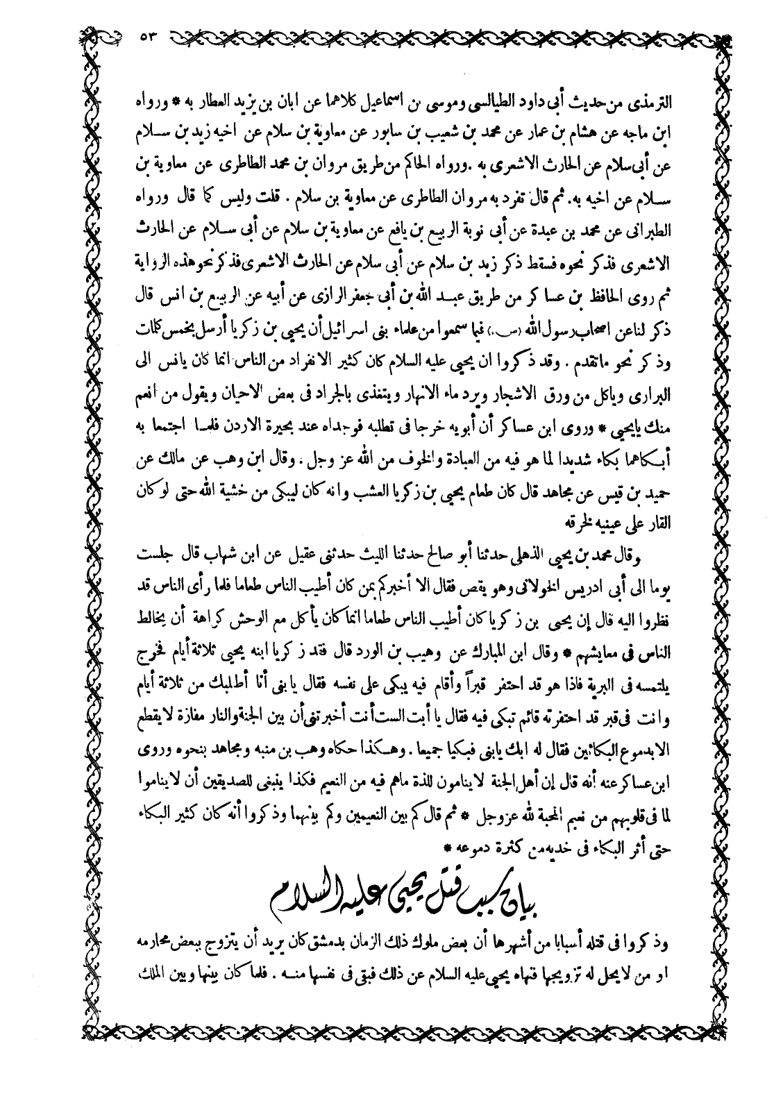 التِّرْمِذِيُّ مِنْ حَدِيثِ أَبِي دَاوُدَ الطَّيَالِسِيِّ وَمُوسَى بْنِ إِسْمَاعِيلَ كِلَاهُمَا عَنْ أَبَانِ بْنِ يَزِيدَ الْعَطَّارِ بِهِ وَرَوَاهُ ابْنُ مَاجَهْ عَنْ هِشَامِ بْنِ عَمَّارٍ عَنْ مُحَمَّدِ بْنِ شُعَيْبِ بْنِ سَابُورَ عَنْ مُعَاوِيَةَ بْنِ سَلَامٍ عَنْ أَخِيهِ زَيْدِ بْنِ سَلَامٍ عَنْ أَبِي سَلَامٍ عَنِ الْحَارِثِ الْأَشْعَرِيِّ بِهِ. وَرَوَاهُ الْحَاكِمُ مِنْ طَرِيقِ مَرْوَانَ بْنِ مُحَمَّدٍ الطَّاطَرِيِّ عَنْ مُعَاوِيَةَ بْنِ سَلَامٍ عَنْ أَخِيهِ بِهِ. ثُمَّ قَالَ تَفَرَّدَ بِهِ مَرْوَانُ الطَّاطَرِيِّ عَنْ مُعَاوِيَةَ بْنِ سَلَامٍ. قُلْتُ وَلَيْسَ كَمَا قَالَ وَرَوَاهُ الطَّبَرَانِيُّ عَنْ محمد بن عبدة عن أبى نوبة الربيع بن يافع عَنْ مُعَاوِيَةَ بْنِ سَلَامٍ عَنْ أَبِي سَلَامٍ عَنِ الْحَارِثِ الْأَشْعَرِيِّ فَذَكَرَ نَحْوَهُ فَسَقَطَ ذِكْرُ زَيْدِ بْنِ سَلَامٍ عَنْ أَبِي سَلَامٍ عَنِ الحارث الأشعري فذكر نحو هذه الرواية ثم روى الحافظ بن عَسَاكِرَ مِنْ طَرِيقِ عَبْدِ اللَّهِ بْنِ أَبِي جَعْفَرٍ الرَّازِيِّ عَنْ أَبِيهِ عَنِ الرَّبِيعِ بْنِ أَنَسٍ قَالَ ذُكِرَ لَنَا عَنْ أَصْحَابِ رَسُولِ اللَّهِ صَلَّى اللَّهُ عَلَيْهِ وَسَلَّمَ فِيمَا سَمِعُوا مِنْ عُلَمَاءِ بَنِي إِسْرَائِيلَ أَنَّ يَحْيَى بْنَ زَكَرِيَّا أُرْسِلَ بِخَمْسِ كَلِمَاتٍ وَذَكَرَ نَحْوَ مَا تَقَدَّمَ. وَقَدْ ذَكَرُوا أَنَّ يَحْيَى عَلَيْهِ السَّلَامُ كَانَ كَثِيرَ الِانْفِرَادِ مِنَ النَّاسِ إِنَّمَا كَانَ يَأْنَسُ إِلَى الْبَرَارِي وَيَأْكُلُ مِنْ وَرَقِ الْأَشْجَارِ وَيَرِدُ مَاءَ الْأَنْهَارِ وَيَتَغَذَّى بِالْجَرَادِ فِي بَعْضِ الْأَحْيَانِ وَيَقُولُ مَنْ أَنْعَمُ مِنْكَ يَا يَحْيَى وَرَوَى ابْنُ عَسَاكِرَ أَنَّ أَبَوَيْهِ خَرَجَا فِي تَطَلُّبِهِ فَوَجَدَاهُ عِنْدَ بُحَيْرَةِ الْأُرْدُنِّ فَلَمَّا اجْتَمَعَا بِهِ أَبْكَاهُمَا بُكَاءً شَدِيدًا لِمَا هُوَ فِيهِ مِنَ الْعِبَادَةِ وَالْخَوْفِ مِنَ اللَّهِ عَزَّ وَجَلَّ. وَقَالَ ابْنُ وَهْبٍ عَنْ مَالِكٍ عَنْ حُمَيْدِ بْنِ قَيْسٍ عَنْ مُجَاهِدٍ قَالَ كَانَ طَعَامُ يحيى بن زكريا العشب وانه كَانَ لَيَبْكِي مِنْ خَشْيَةِ اللَّهِ حَتَّى لَوْ كان القار على عينيه لخرقه وَقَالَ مُحَمَّدُ بْنُ يَحْيَى الذُّهْلِيُّ حَدَّثَنَا أَبُو صَالِحٍ حَدَّثَنَا اللَّيْثُ حَدَّثَنِي عُقَيْلٌ عَنِ ابْنِ شِهَابٍ قَالَ جَلَسْتُ يَوْمًا إِلَى أَبِي إِدْرِيسَ الْخَوْلَانِيِّ وَهُوَ يَقُصُّ فَقَالَ أَلَا أُخْبِرُكُمْ بِمَنْ كَانَ أَطْيَبَ النَّاسِ طَعَامًا فَلَمَّا رَأَى النَّاسَ قَدْ نَظَرُوا إِلَيْهِ قَالَ إِنَّ يَحْيَى بْنَ زَكَرِيَّا كَانَ أَطْيَبَ النَّاسِ طَعَامًا إِنَّمَا كَانَ يَأْكُلُ مَعَ الْوَحْشِ كَرَاهَةَ أَنْ يُخَالِطَ النَّاسَ فِي مَعَايِشِهِمْ وَقَالَ ابْنُ الْمُبَارَكِ عَنْ وُهَيْبِ بْنِ الْوَرْدِ قَالَ فَقَدَ زَكَرِيَّا ابْنَهُ يَحْيَى ثَلَاثَةَ أَيَّامٍ فَخَرَجَ يَلْتَمِسُهُ فِي الْبَرِّيَّةِ فَإِذَا هُوَ قَدِ احْتَفَرَ قَبْرًا وَأَقَامَ فِيهِ يَبْكِي عَلَى نَفْسِهِ فَقَالَ يَا بُنَيَّ أَنَا أَطْلُبُكَ مِنْ ثَلَاثَةِ أَيَّامٍ وَأَنْتَ فِي قَبْرٍ قَدِ احْتَفَرْتَهُ قَائِمٌ تَبْكِي فِيهِ فَقَالَ يَا أَبَتِ أَلَسْتَ أَنْتَ أَخْبَرْتَنِي أَنَّ بَيْنَ الْجَنَّةِ وَالنَّارِ مفازة لا يقطع الا بدموع البكاءين فَقَالَ لَهُ ابْكِ يَا بُنَيَّ فَبَكَيَا جَمِيعًا. وَهَكَذَا حَكَاهُ وَهْبُ بْنُ مُنَبِّهٍ وَمُجَاهِدٌ بِنَحْوِهِ وَرَوَى ابْنُ عَسَاكِرَ عَنْهُ أَنَّهُ قَالَ إِنَّ أَهْلَ الْجَنَّةِ لَا يَنَامُونَ لِلَذَّةِ مَا هُمْ فِيهِ مِنَ النَّعِيمِ فَكَذَا يَنْبَغِي لِلصِّدِّيقِينَ أَنْ لَا يَنَامُوا لِمَا فِي قُلُوبِهِمْ مِنْ نَعِيمِ الْمَحَبَ