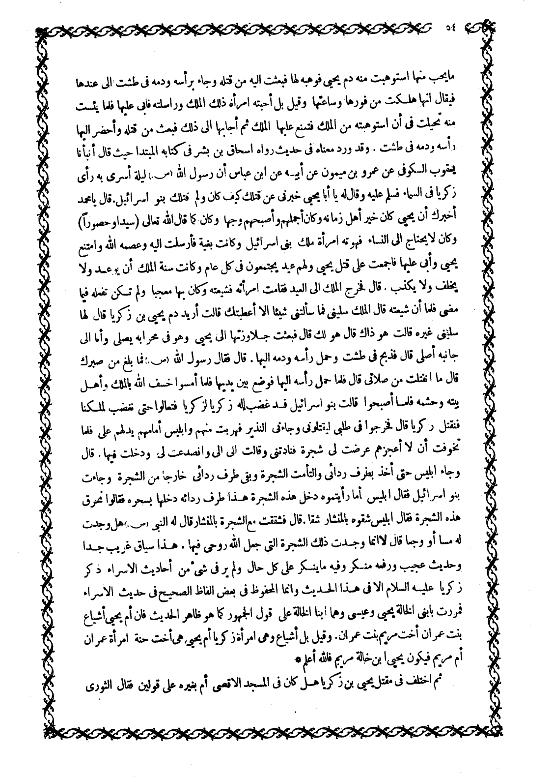 مَا يُحِبُّ مِنْهَا اسْتَوْهَبَتْ مِنْهُ دَمَ يَحْيَى فوهبه لها فبعث إِلَيْهِ مَنْ قَتَلَهُ وَجَاءَ بِرَأْسِهِ وَدَمِهِ فِي طشت إِلَى عِنْدِهَا فَيُقَالُ إِنَّهَا هَلَكَتْ مِنْ فَوْرِهَا وَسَاعَتِهَا وَقِيلَ بَلْ أَحَبَّتْهُ امْرَأَةُ ذَلِكَ الْمَلِكِ وَرَاسَلَتْهُ فَأَبَى عَلَيْهَا فَلَمَّا يَئِسَتْ مِنْهُ تَحَيَّلَتْ فِي أَنِ اسْتَوْهَبَتْهُ مِنَ الْمَلِكِ فَتَمَنَّعَ عَلَيْهَا الملك ثم أجابها الى ذلك فبعث مَنْ قَتَلَهُ وَأَحْضَرَ إِلَيْهَا رَأْسَهُ وَدَمَهُ فِي طشت. وَقَدْ وَرَدَ مَعْنَاهُ فِي حَدِيثٍ رَوَاهُ إِسْحَاقُ بْنُ بِشْرٍ فِي كِتَابِهِ الْمُبْتَدَأُ حَيْثُ قَالَ أَنْبَأَنَا يَعْقُوبٌ الْكُوفِيُّ عَنْ عَمْرِو بْنِ مَيْمُونٍ عَنْ أَبِيهِ عَنِ ابْنِ عَبَّاسٍ أَنَّ رَسُولَ اللَّهِ صَلَّى اللَّهُ عَلَيْهِ وَسَلَّمَ لَيْلَةَ أُسَرِيَ بِهِ رَأَى زَكَرِيَّا فِي السَّمَاءِ فَسَلَّمَ عَلَيْهِ وَقَالَ لَهُ يَا أَبَا يَحْيَى خَبِّرْنِي عَنْ قَتْلِكَ كَيْفَ كَانَ وَلِمَ قَتَلَكَ بَنُو إِسْرَائِيلَ. قَالَ يَا مُحَمَّدُ أُخْبِرُكَ أَنَّ يَحْيَى كَانَ خَيْرَ أَهْلِ زَمَانِهِ وَكَانَ أَجْمَلَهُمْ وَأَصْبَحَهُمْ وَجْهًا وَكَانَ كَمَا قَالَ اللَّهُ تَعَالَى (سَيِّداً وَحَصُوراً) 3: 39 وكان لا يحتاج الى النساء فهوته امْرَأَةُ مَلِكِ بَنِي إِسْرَائِيلَ وَكَانَتْ بَغِيَّةً فَأَرْسَلَتْ إِلَيْهِ وَعَصَمَهُ اللَّهُ وَامْتَنَعَ يَحْيَى وَأَبَى عَلَيْهَا فأجمعت عَلَى قَتْلِ يَحْيَى وَلَهُمْ عِيدٌ يَجْتَمِعُونَ فِي كُلِّ عَامٍ وَكَانَتْ سُنَّةُ الْمَلِكَ أَنْ يُوعِدَ وَلَا يُخْلِفَ وَلَا يَكْذِبَ. قَالَ فَخَرَجَ الْمَلِكُ إِلَى الْعِيدِ فَقَامَتِ امْرَأَتُهُ فَشَيَّعَتْهُ وَكَانَ بِهَا مُعْجَبًا وَلَمْ تَكُنْ تَفْعَلُهُ فِيمَا مَضَى فَلَمَّا أَنْ شَيَّعَتْهُ قَالَ الْمَلِكُ سَلِينِي فَمَا سَأَلْتِنِي شَيْئًا إِلَّا أَعْطَيْتُكِ قَالَتْ أُرِيدُ دَمَ يَحْيَى بْنِ زَكَرِيَّا قَالَ لَهَا سَلِينِي غَيْرَهُ قَالَتْ هُوَ ذَاكَ قَالَ هُوَ لَكِ قَالَ فَبَعَثَتْ جَلَاوِزَتَهَا إِلَى يَحْيَى وَهُوَ فِي مِحْرَابِهِ يُصَلِّي وَأَنَا إِلَى جَانِبِهِ أُصَلِّي قَالَ فَذُبِحَ فِي طشت وَحُمِلَ رَأْسُهُ وَدَمُهُ إِلَيْهَا. قَالَ فَقَالَ رَسُولُ اللَّهِ صَلَّى اللَّهُ عَلَيْهِ وَسَلَّمَ فَمَا بَلَغَ مِنْ صَبْرِكَ قَالَ مَا انْفَتَلْتُ مِنْ صَلَاتِي قَالَ فَلَمَّا حُمِلَ رَأْسُهُ إِلَيْهَا فَوُضِعَ بَيْنَ يَدَيْهَا فَلَمَّا أَمْسَوْا خَسَفَ اللَّهُ بِالْمَلِكِ وَأَهْلِ بَيْتِهِ وَحَشَمِهِ فَلَمَّا أَصْبَحُوا قَالَتْ بَنُو إِسْرَائِيلَ قَدْ غَضِبَ إِلَهُ زَكَرِيَّا لِزَكَرِيَّا فَتَعَالَوْا حَتَّى نَغْضَبَ لِمَلِكِنَا فَنَقْتُلَ زَكَرِيَّا قَالَ فَخَرَجُوا فِي طَلَبِي لِيَقْتُلُونِي وَجَاءَنِي النَّذِيرُ فَهَرَبْتُ مِنْهُمْ وَإِبْلِيسُ أَمَامَهُمْ يَدُلُّهُمْ عَلَيَّ فَلَمَّا تَخَوَّفْتُ أَنْ لَا أُعْجِزَهُمْ عَرَضَتْ لِي شَجَرَةٌ فَنَادَتْنِي وَقَالَتْ إِلَيَّ الى وانصدعت لي ودخلت فِيهَا. قَالَ وَجَاءَ إِبْلِيسُ حَتَّى أَخَذَ بِطَرَفِ رِدَائِي وَالْتَأَمَتِ الشَّجَرَةُ وَبَقِيَ طَرَفُ رِدَائِي خَارِجًا مِنَ الشَّجَرَةِ وَجَاءَتْ بَنُو إِسْرَائِيلَ فَقَالَ إِبْلِيسُ أَمَا رَأَيْتُمُوهُ دَخَلَ هَذِهِ الشَّجَرَةَ هَذَا طَرَفُ رِدَائِهِ دَخَلَهَا بِسِحْرِهِ فَقَالُوا نُحَرِّقُ هَذِهِ الشَّجَرَةَ فَقَالَ إِبْلِيسُ شُقُّوهُ بِالْمِنْشَارِ شَقًّا. قَالَ فَشُقِقْتُ مَعَ الشَّجَرَةِ بِالْمِنْشَارِ قَالَ لَهُ النَّبِيُّ صَلَّى اللَّهُ عَلَيْهِ وَسَلَّمَ هَلْ وَجَدْتَ لَهُ مَسًّا أَوْ وَجَعًا قَالَ لَا إِنَّمَا وَجَدَتْ ذَلِكَ الشجرة التي جَعَلَ اللَّهُ رُوحِي فِيهَا. هَذَا سِيَاقٌ غَرِيبٌ 