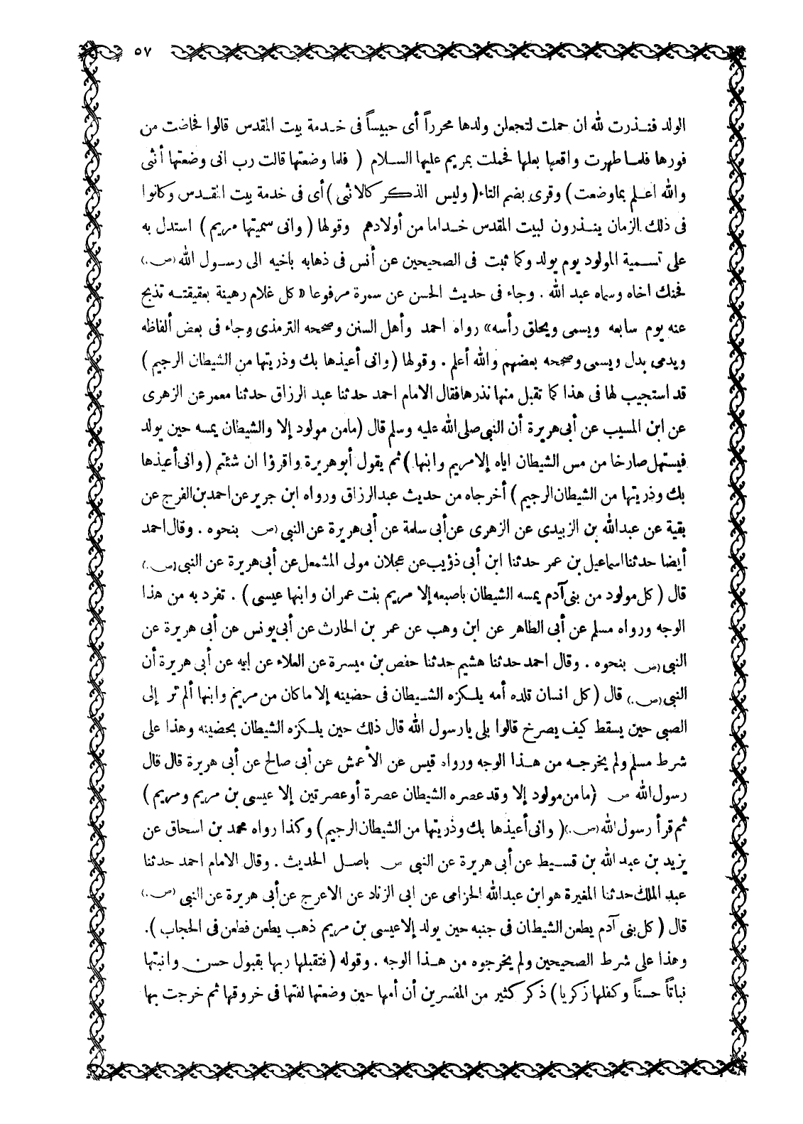 الْوَلَدَ فَنَذَرَتْ للَّه إِنْ حَمَلَتْ لَتَجْعَلَنَّ وَلَدَهَا مُحَرَّرًا أَيْ حَبِيسًا فِي خِدْمَةِ بَيْتِ الْمَقْدِسِ قَالُوا فَحَاضَتْ مِنْ فَوْرِهَا فَلَمَّا طَهُرَتْ وَاقَعَهَا بَعْلُهَا فَحَمَلَتْ بِمَرْيَمَ عَلَيْهَا السَّلَامُ (فَلَمَّا وَضَعَتْها قالَتْ رَبِّ إِنِّي وَضَعْتُها أُنْثى وَالله أَعْلَمُ بِما وَضَعَتْ) 3: 36 وقرى بضم التاء (وَلَيْسَ الذَّكَرُ كَالْأُنْثى) 3: 36 أَيْ فِي خِدْمَةِ بَيْتِ الْمَقْدِسِ وَكَانُوا فِي ذَلِكَ الزَّمَانِ يَنْذِرُونَ لِبَيْتِ الْمَقْدِسِ خُدَّامًا مِنْ أولادهم. وقولها (وَإِنِّي سَمَّيْتُها مَرْيَمَ) 3: 36 اسْتُدِلَّ بِهِ عَلَى تَسْمِيَةِ الْمَوْلُودِ يَوْمَ يُولَدُ وَكَمَا ثَبَتَ فِي الصَّحِيحَيْنِ عَنْ أَنَسٍ فِي ذَهَابِهِ بِأَخِيهِ إِلَى رَسُولِ اللَّهِ صَلَّى اللَّهُ عَلَيْهِ وَسَلَّمَ فَحَنَّكَ أَخَاهُ وَسَمَّاهُ عَبْدَ اللَّهِ. وَجَاءَ فِي حَدِيثِ الْحَسَنِ عَنْ سَمُرَةَ مَرْفُوعًا «كُلُّ غُلَامٍ رَهِينَةٌ بِعَقِيقَتِهِ تُذْبَحُ عَنْهُ يَوْمَ سَابِعِهِ وَيُسَمَّى وَيُحْلَقُ رَأْسُهُ» رَوَاهُ أَحْمَدُ وَأَهْلُ السُّنَنِ وَصَحَّحَهُ التِّرْمِذِيُّ وَجَاءَ فِي بَعْضِ أَلْفَاظِهِ ويدمي بدل ويسمى وَصَحَّحَهُ بَعْضُهُمْ وَاللَّهُ أَعْلَمُ. وَقَوْلُهَا (وَإِنِّي أُعِيذُها بِكَ وَذُرِّيَّتَها من الشَّيْطانِ الرَّجِيمِ) 3: 36 قَدِ اسْتُجِيبَ لَهَا فِي هَذَا كَمَا تُقُبِّلَ مِنْهَا نَذْرُهَا فَقَالَ الْإِمَامُ أَحْمَدُ حَدَّثَنَا عَبْدُ الرَّزَّاقِ حَدَّثَنَا مَعْمَرٌ عَنِ الزُّهْرِيِّ عَنِ ابْنِ الْمُسَيَّبِ عَنْ أَبِي هُرَيْرَةَ أَنَّ النَّبِيَّ صَلَّى اللَّهُ عَلَيْهِ وَسَلَّمَ قَالَ (مَا مِنْ مَوْلُودٍ إِلَّا وَالشَّيْطَانُ يَمَسُّهُ حِينَ يُولَدُ فَيَسْتَهِلُّ صَارِخًا مِنْ مَسِّ الشَّيْطَانِ إِيَّاهُ إِلَّا مَرْيَمَ وَابْنَهَا) ثُمَّ يَقُولُ أَبُو هُرَيْرَةَ وَاقْرَءُوا إِنْ شِئْتُمْ (وَإِنِّي أُعِيذُها بِكَ وَذُرِّيَّتَها مِنَ الشَّيْطانِ الرَّجِيمِ) 3: 36 أَخْرَجَاهُ مِنْ حَدِيثِ عَبْدِ الرَّزَّاقِ وَرَوَاهُ ابْنُ جَرِيرٍ عَنْ أَحْمَدَ بْنِ الْفَرْجِ عَنْ بَقِيَّةَ عن عبد الله بن الزُّبَيْدِيِّ عَنِ الزُّهْرِيِّ عَنْ أَبِي سَلَمَةَ عَنْ أَبِي هُرَيْرَةَ عَنِ النَّبِيِّ صَلَّى اللَّهُ عَلَيْهِ وَسَلَّمَ بِنَحْوِهِ. وَقَالَ أَحْمَدُ أَيْضًا حَدَّثَنَا إِسْمَاعِيلُ بْنُ عُمَرَ حَدَّثَنَا ابْنُ أَبِي ذؤيب عَنْ عَجْلَانَ مَوْلَى الْمُشْمَعِلِّ عَنْ أَبِي هُرَيْرَةَ عَنِ النَّبِيِّ صَلَّى اللَّهُ عَلَيْهِ وَسَلَّمَ قَالَ (كُلُّ مَوْلُودٍ مِنْ بَنِي آدَمَ يَمَسُّهُ الشَّيْطَانُ بِأُصْبُعِهِ إِلَّا مَرْيَمَ بِنْتَ عِمْرَانَ وَابْنَهَا عِيسَى) . تَفَرَّدَ بِهِ مِنْ هَذَا الْوَجْهِ وَرَوَاهُ مُسْلِمٌ عَنْ أَبِي الطَّاهِرِ عَنِ ابْنِ وَهْبٍ عَنْ عُمَرَ بْنِ الْحَارِثِ عَنْ أَبِي يُونُسَ عَنْ أَبِي هُرَيْرَةَ عَنِ النَّبِيِّ صَلَّى اللَّهُ عَلَيْهِ وَسَلَّمَ بنحوه. وقال احمد حدثنا هشيم حَدَّثَنَا حَفْصُ بْنُ مَيْسَرَةَ عَنِ الْعَلَاءِ عَنْ أَبِيهِ عَنْ أَبِي هُرَيْرَةَ أَنَّ النَّبِيَّ صَلَّى اللَّهُ عَلَيْهِ وَسَلَّمَ قَالَ (كُلُّ إِنْسَانٍ تَلِدُهُ أمه يلكزه الشيطان في حضينه إِلَّا مَا كَانَ مِنْ مَرْيَمَ وَابْنِهَا أَلَمْ تَرَ إِلَى الصَّبِيِّ حِينَ يَسْقُطُ كَيْفَ يَصْرُخُ قَالُوا بَلَى يَا رَسُولَ اللَّهِ قَالَ ذَلِكَ حين يلكزه الشيطان بحضينه وَهَذَا عَلَى شَرْطِ مُسْلِمٍ وَلَمْ يُخْرِجْهُ مِنْ هَذَا الْوَجْهِ وَرَوَاهُ قَيْسٌ عَنِ الْأَعْمَشِ عَنْ أَبِي صَالِحٍ عَنْ أَبِي هُرَيْرَةَ قَالَ قَالَ رَسُولُ اللَّهِ صَلَّى اللَّهُ عَلَيْهِ وسلم (ما مِنْ مَوْلُودٍ إِلَّا وَقَدْ عَصَرَهُ الشَّيْطَانُ عَصْرَةً أَوْ عَصْرَتَيْنِ إ