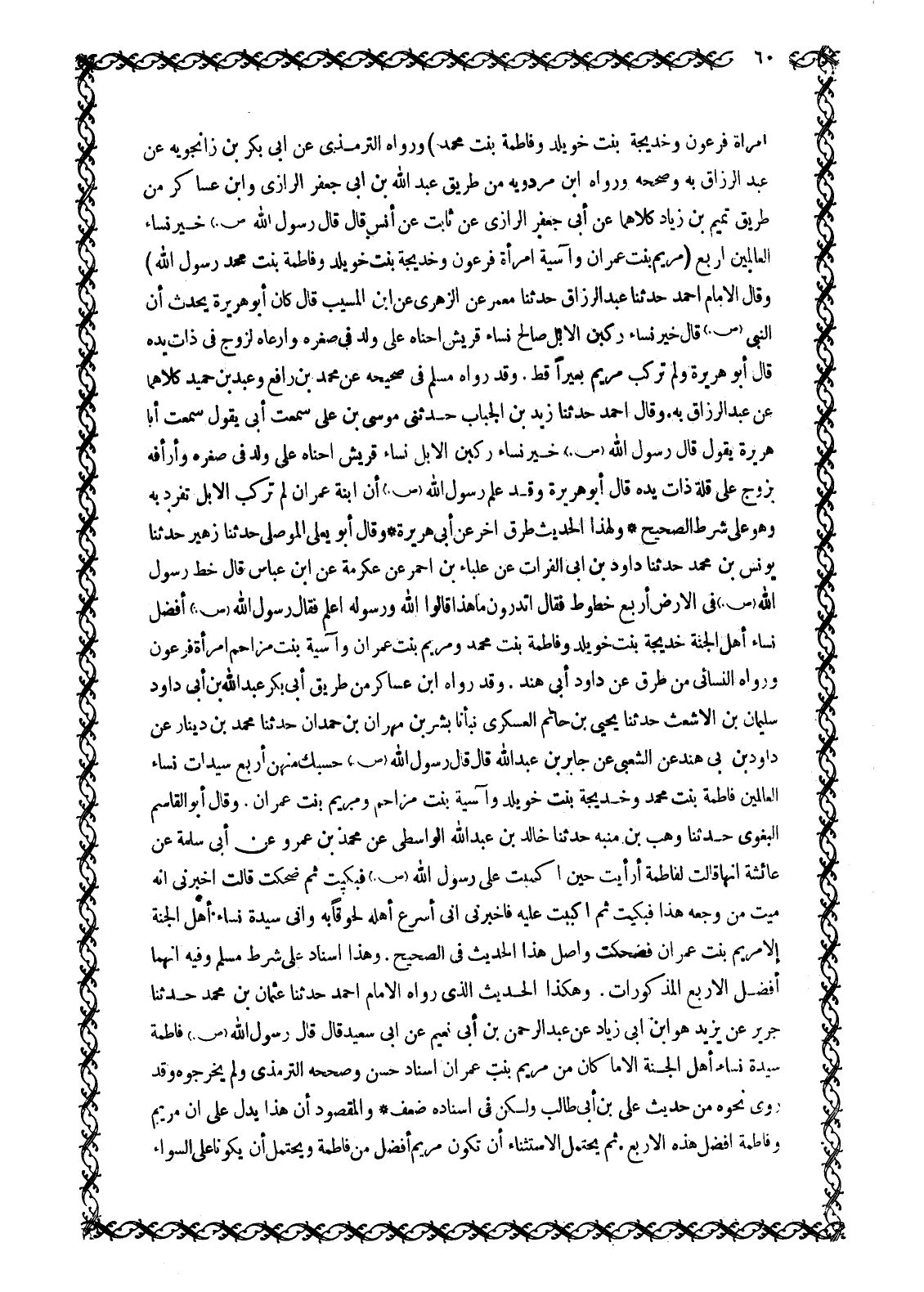 امْرَأَةُ فِرْعَوْنَ وَخَدِيجَةُ بِنْتُ خُوَيْلِدٍ وَفَاطِمَةُ بِنْتُ مُحَمَّدٍ) وَرَوَاهُ التِّرْمِذِيُّ عَنْ أَبِي بَكْرِ بْنِ زَنْجَوَيْهِ عَنْ عَبْدِ الرَّزَّاقِ بِهِ وَصَحَّحَهُ وَرَوَاهُ ابْنُ مَرْدَوَيْهِ مِنْ طَرِيقِ عَبْدِ اللَّهِ بْنِ أَبِي جَعْفَرٍ الرَّازِيِّ وَابْنُ عَسَاكِرَ مِنْ طَرِيقِ تَمِيمِ بْنِ زِيَادٍ كِلَاهُمَا عَنْ أَبِي جَعْفَرٍ الرَّازِيِّ عَنْ ثَابِتٍ عَنْ أَنَسٍ قَالَ قَالَ رَسُولُ اللَّهِ صَلَّى اللَّهُ عَلَيْهِ وَسَلَّمَ خَيْرُ نِسَاءِ الْعَالَمِينَ أَرْبَعٌ (مَرْيَمُ بِنْتُ عِمْرَانَ وَآسِيَةُ امْرَأَةُ فِرْعَوْنَ وَخَدِيجَةُ بِنْتُ خُوَيْلِدٍ وَفَاطِمَةُ بِنْتُ مُحَمَّدٍ رَسُولِ اللَّهِ) وَقَالَ الْإِمَامُ أَحْمَدُ حَدَّثَنَا عَبْدُ الرَّزَّاقِ حَدَّثَنَا مَعْمَرٌ عَنِ الزُّهْرِيِّ عَنْ ابْنِ الْمُسَيِّبِ قَالَ كَانَ أَبُو هُرَيْرَةَ يُحَدِّثُ أَنَّ النَّبِيَّ صَلَّى اللَّهُ عَلَيْهِ وَسَلَّمَ قَالَ خَيْرُ نِسَاءٍ رَكِبْنَ الْإِبِلَ صَالِحُ نِسَاءِ قُرَيْشٍ أَحْنَاهُ عَلَى وَلَدٍ فِي صِغَرِهِ وَأَرْعَاهُ لِزَوْجٍ فِي ذَاتِ يَدِهِ قَالَ أَبُو هُرَيْرَةَ وَلَمْ تَرْكَبْ مَرْيَمُ بَعِيرًا قَطُّ. وَقَدْ رَوَاهُ مُسْلِمٌ فِي صَحِيحِهِ عَنْ مُحَمَّدِ بْنِ رَافِعٍ وَعَبْدِ بْنِ حُمَيْدٍ كِلَاهُمَا عَنْ عَبْدِ الرَّزَّاقِ بِهِ. وَقَالَ أَحْمَدُ حَدَّثَنَا زَيْدُ بْنُ الْحُبَابِ حَدَّثَنِي مُوسَى بْنُ عَلِيٍّ سَمِعْتُ أَبِي يَقُولُ سَمِعْتُ أَبَا هُرَيْرَةَ يَقُولُ قَالَ رَسُولُ اللَّهِ صَلَّى اللَّهُ عَلَيْهِ وَسَلَّمَ خَيْرُ نِسَاءٍ رَكِبْنَ الْإِبِلَ نِسَاءِ قُرَيْشٍ أَحْنَاهُ عَلَى وَلَدٍ فِي صِغَرِهِ وَأَرْأَفُهُ بِزَوْجٍ عَلَى قِلَّةِ ذَاتِ يَدِهِ قَالَ أَبُو هُرَيْرَةَ وَقَدْ عَلِمَ رَسُولُ اللَّهِ صَلَّى اللَّهُ عَلَيْهِ وَسَلَّمَ أَنَّ ابْنَةَ عِمْرَانَ لَمْ تَرْكَبِ الْإِبِلَ تَفَرَّدَ بِهِ وَهُوَ عَلَى شَرْطِ الصَّحِيحِ وَلِهَذَا الْحَدِيثِ طُرُقٌ أُخَرُ عَنْ أَبِي هُرَيْرَةَ وَقَالَ أَبُو يَعْلَى الْمُوصِلِيُّ حَدَّثَنَا زُهَيْرٌ حَدَّثَنَا يُونُسُ بْنُ مُحَمَّدٍ حَدَّثَنَا دَاوُدُ بْنُ أَبِي الْفُرَاتِ عَنْ عِلْبَاءَ بْنِ أَحْمَرَ عَنْ عِكْرِمَةَ عَنِ ابْنِ عَبَّاسٍ قَالَ خَطَّ رَسُولُ اللَّهِ صَلَّى اللَّهُ عَلَيْهِ وَسَلَّمَ فِي الْأَرْضِ أَرْبَعَ خُطُوطٍ فَقَالَ أَتَدْرُونَ مَا هَذَا قَالُوا اللَّهُ وَرَسُولُهُ أَعْلَمُ فَقَالَ رَسُولُ اللَّهِ صَلَّى اللَّهُ عَلَيْهِ وَسَلَّمَ أَفْضَلُ نِسَاءِ أَهْلِ الْجَنَّةِ خَدِيجَةُ بِنْتُ خُوَيْلِدٍ وَفَاطِمَةُ بِنْتُ مُحَمَّدٍ وَمَرْيَمُ بِنْتُ عِمْرَانَ وَآسِيَةُ بِنْتُ مُزَاحِمٍ امْرَأَةُ فِرْعَوْنَ ورواه النسائي من طرق عن داود أبى هند. وَقَدْ رَوَاهُ ابْنُ عَسَاكِرَ مِنْ طَرِيقِ أَبِي بَكْرٍ عَبْدِ اللَّهِ بْنِ أَبِي دَاوُدَ سُلَيْمَانَ بْنِ الْأَشْعَثِ حَدَّثَنَا يَحْيَى بْنُ حَاتِمٍ الْعَسْكَرِيُّ نَبَّأَنَا بِشْرُ بْنُ مِهْرَانَ بْنِ حَمْدَانَ حَدَّثَنَا مُحَمَّدُ بْنُ دِينَارٍ عَنْ دَاوُدَ بْنِ أَبِي هِنْدٍ عَنِ الشَّعْبِيِّ عَنْ جَابِرِ بْنِ عَبْدِ اللَّهِ قَالَ قَالَ رَسُولُ اللَّهِ صَلَّى اللَّهُ عَلَيْهِ وَسَلَّمَ حَسْبُكَ مِنْهُنَّ أَرْبَعٌ سَيِّدَاتُ نِسَاءِ الْعَالَمِينَ فَاطِمَةُ بِنْتُ مُحَمَّدٍ وَخَدِيجَةُ بِنْتُ خُوَيْلِدٍ وَآسِيَةُ بِنْتُ مُزَاحِمٍ وَمَرْيَمُ بِنْتُ عِمْرَانَ. وَقَالَ أبو القاسم البغوي حدثنا وهب بن منبه حَدَّثَنَا خَالِدُ بْنُ عَبْدِ اللَّهِ الْوَاسِطِيُّ عَنْ مُحَمَّدِ بْنِ عَمْرٍو عَنْ أَبِي سَلَمَةَ عَنْ عَائِشَةَ أَنَّهَا قَالَتْ لِفَاطِمَةَ أَرَأَيْتِ حِينَ أَكْبَبْتِ عَلَى رَسُولِ اللَّهِ صَلَّى اللَّهُ عَلَيْهِ وَسَلَّمَ ف