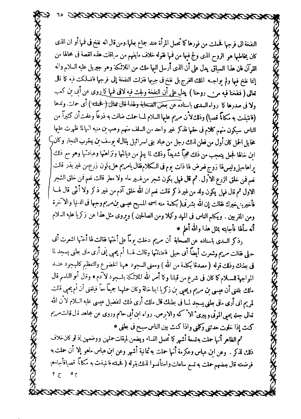 النَّفْخَةُ إِلَى فَرْجِهَا فَحَمَلَتْ مِنْ فَوْرِهَا كَمَا تَحْمِلُ الْمَرْأَةُ عِنْدَ جِمَاعِ بَعْلِهَا. وَمَنْ قَالَ أَنَّهُ نَفَخَ فِي فَمِهَا أَوْ أَنَّ الَّذِي كَانَ يُخَاطِبُهَا هُوَ الرُّوحُ الَّذِي وَلَجَ فِيهَا مِنْ فَمِهَا فَقَوْلُهُ خِلَافُ مَا يُفْهَمُ مِنْ سِيَاقَاتِ هَذِهِ الْقِصَّةِ فِي مَحَالِّهَا مِنَ الْقُرْآنِ فَإِنَّ هَذَا السِّيَاقَ يَدُلُّ عَلَى أَنَّ الَّذِي أُرْسِلَ إِلَيْهَا مَلَكٌ مِنَ الْمَلَائِكَةِ وَهُوَ جِبْرِيلُ عَلَيْهِ السَّلَامُ وَأَنَّهُ إِنَّمَا نَفَخَ فِيهَا وَلَمْ يُوَاجِهِ الْمَلَكُ الْفَرْجَ بَلْ نَفَخَ فِي جَيْبِهَا فَنَزَلَتِ النَّفْخَةُ إِلَى فَرْجِهَا فَانْسَلَكَتْ فِيهِ كَمَا قال تعالى فَنَفَخْنا فِيهِ من رُوحِنا 66: 12 يدل عَلَى أَنَّ النَّفْخَةَ وَلَجَتْ فِيهِ لَا فِي فَمِهَا كَمَا رُوِيَ عَنْ أُبَيِّ بْنِ كَعْبٍ وَلَا فِي صَدْرِهَا كَمَا رَوَاهُ السُّدِّيُّ بِإِسْنَادِهِ عَنْ بَعْضِ الصَّحَابَةِ وَلِهَذَا قَالَ تَعَالَى فَحَمَلَتْهُ 19: 22 أي حملت ولدها فَانْتَبَذَتْ به مَكاناً قَصِيًّا 19: 22 وَذَلِكَ لِأَنَّ مَرْيَمَ عَلَيْهَا السَّلَامُ لَمَّا حَمَلَتْ ضَاقَتْ بِهِ ذَرْعًا وَعَلِمَتْ أَنَّ كَثِيرًا مِنَ النَّاسِ سَيَكُونُ مِنْهُمْ كَلَامٌ فِي حَقِّهَا فَذَكَرَ غَيْرُ وَاحِدٍ مِنَ السَّلَفِ مِنْهُمْ وَهْبُ بْنُ مُنَبِّهٍ أَنَّهَا لَمَّا ظَهَرَتْ عَلَيْهَا مَخَايِلُ الْحَمْلِ كَانَ أَوَّلَ مَنْ فَطِنَ لِذَلِكَ رَجُلٌ مِنْ عُبَّادِ بَنِي إِسْرَائِيلَ يُقَالُ لَهُ يُوسُفُ بْنُ يَعْقُوبَ النَّجَّارُ وَكَانَ ابْنَ خَالِهَا فَجَعَلَ يَتَعَجَّبُ مِنْ ذَلِكَ عَجَبًا شَدِيدًا وَذَلِكَ لِمَا يَعْلَمُ مِنْ دِيَانَتِهَا وَنَزَاهَتِهَا وَعِبَادَتِهَا وَهُوَ مَعَ ذَلِكَ يَرَاهَا حُبْلَى وَلَيْسَ لَهَا زَوْجٌ فَعَرَّضَ لَهَا ذَاتَ يَوْمٍ فِي الْكَلَامِ فَقَالَ يَا مَرْيَمُ هَلْ يَكُونُ زَرْعٌ مِنْ غَيْرِ بَذْرٍ قَالَتْ نَعَمْ فَمَنْ خَلَقَ الزَّرْعَ الْأَوَّلَ. ثُمَّ قَالَ فَهَلْ يَكُونُ شَجَرٌ مِنْ غَيْرِ مَاءٍ وَلَا مَطَرٍ قَالَتْ نَعَمْ فَمَنْ خَلَقَ الشَّجَرَ الْأَوَّلَ ثُمَّ قَالَ فَهَلْ يَكُونُ وَلَدٌ مِنْ غَيْرِ ذَكَرٍ قَالَتْ نَعَمْ إِنَّ اللَّهَ خَلَقَ آدَمَ مِنْ غَيْرِ ذَكَرٍ وَلَا أُنْثَى قَالَ لَهَا فَأَخْبِرِينِي خَبَرَكِ فَقَالَتْ إِنَّ اللَّهَ بَشَّرَنِي (بِكَلِمَةٍ مِنْهُ اسْمُهُ الْمَسِيحُ عِيسَى ابْنُ مَرْيَمَ وَجِيهاً فِي الدُّنْيا وَالْآخِرَةِ وَمن الْمُقَرَّبِينَ. وَيُكَلِّمُ النَّاسَ في الْمَهْدِ وَكَهْلًا وَمن الصَّالِحِينَ) 3: 45- 46 وَيُرْوَى مِثْلُ هَذَا عَنْ زَكَرِيَّا عَلَيْهِ السَّلَامُ أَنَّهُ سَأَلَهَا فَأَجَابَتْهُ بِمِثْلِ هَذَا وَاللَّهُ أَعْلَمُ وَذَكَرَ السُّدِّيُّ بِإِسْنَادِهِ عَنِ الصَّحَابَةِ أَنَّ مَرْيَمَ دَخَلَتْ يَوْمًا عَلَى أُخْتِهَا فَقَالَتْ لَهَا أُخْتُهَا أَشَعَرْتِ أَنِّي حُبْلَى فَقَالَتْ مَرْيَمُ وَشَعَرْتِ أَيْضًا أَنِّي حُبْلَى فَاعْتَنَقَتْهَا وَقَالَتْ لَهَا أُمُّ يَحْيَى إِنِّي أَرَى مَا فِي بَطْنِي يَسْجُدُ لِمَا فِي بَطْنِكِ وَذَلِكَ قَوْلُهُ (مُصَدِّقاً بِكَلِمَةٍ مِنَ الله) 3: 39 وَمَعْنَى السُّجُودِ هَاهُنَا الْخُضُوعُ وَالتَّعْظِيمُ كَالسُّجُودِ عِنْدَ الْمُوَاجَهَةِ لِلسَّلَامِ كَمَا كَانَ فِي شَرْعِ مَنْ قَبْلَنَا وَكَمَا أَمَرَ اللَّهُ الْمَلَائِكَةَ بِالسُّجُودِ لِآدَمَ وقال أبو الْقَاسِمِ قَالَ مَالِكٌ بَلَغَنِي أَنَّ عِيسَى بْنَ مَرْيَمَ وَيَحْيَى بْنَ زَكَرِيَّا ابْنَا خَالَةٍ وَكَانَ حَمْلُهُمَا جَمِيعًا مَعًا فَبَلَغَنِي أَنَّ أُمَّ يَحْيَى قَالَتْ لِمَرْيَمَ إِنِّي أَرَى مَا فِي بَطْنِي يَسْجُدُ لِمَا فِي بَطْنِكِ قَالَ مَالِكٌ أَرَى ذَلِكَ لِتَفْضِيلِ 