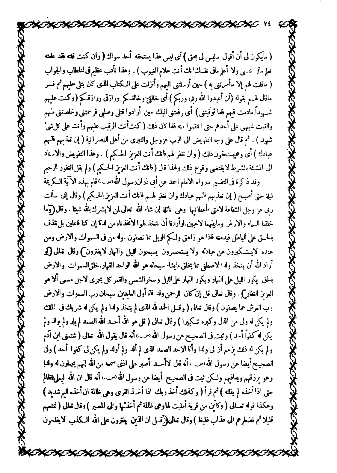 مَا يَكُونُ لِي أَنْ أَقُولَ مَا لَيْسَ لِي بِحَقٍّ 5: 116 أي ليس هذا يستحقه أحد سواك وإِنْ كُنْتُ قُلْتُهُ فَقَدْ عَلِمْتَهُ تَعْلَمُ مَا فِي نَفْسِي وَلا أَعْلَمُ مَا فِي نَفْسِكَ إِنَّكَ أَنْتَ عَلَّامُ الْغُيُوبِ 5: 116. وَهَذَا تَأَدُّبٌ عَظِيمٌ فِي الْخِطَابِ وَالْجَوَابِ مَا قُلْتُ لَهُمْ إِلَّا ما أَمَرْتَنِي به 5: 117 حِينَ أَرْسَلْتَنِي إِلَيْهِمْ وَأَنْزَلْتَ عَلَيَّ الْكِتَابَ الَّذِي كَانَ يُتْلَى عَلَيْهِمْ ثُمَّ فَسَّرَ مَا قَالَ لَهُمْ بِقَوْلِهِ أَنِ اعْبُدُوا اللَّهَ رَبِّي وَرَبَّكُمْ 5: 117 أَيْ خَالِقِي وَخَالِقُكُمْ وَرَازِقِي وَرَازِقُكُمْ وَكُنْتُ عَلَيْهِمْ شَهِيداً مَا دُمْتُ فِيهِمْ فَلَمَّا تَوَفَّيْتَنِي 5: 117 أَيْ رَفَعْتَنِي إِلَيْكَ حِينَ أَرَادُوا قَتْلِي وَصَلْبِي فَرَحِمْتَنِي وَخَلَّصْتَنِي مِنْهُمْ وَأَلْقَيْتَ شَبَهِي عَلَى أَحَدِهِمْ حَتَّى انْتَقَمُوا مِنْهُ فَلَمَّا كَانَ ذَلِكَ (كُنْتَ أَنْتَ الرَّقِيبَ عَلَيْهِمْ وَأَنْتَ عَلى كُلِّ شَيْءٍ شَهِيدٌ) . 5: 117 ثُمَّ قَالَ عَلَى وَجْهِ التَّفْوِيضِ إِلَى الرَّبِّ عَزَّ وَجَلَّ وَالتَّبَرِّي مِنْ أَهْلِ النَّصْرَانِيَّةِ إِنْ تُعَذِّبْهُمْ فَإِنَّهُمْ عِبادُكَ 5: 118 أَيْ وَهُمْ يَسْتَحِقُّونَ ذَلِكَ وَإِنْ تَغْفِرْ لَهُمْ فَإِنَّكَ أَنْتَ الْعَزِيزُ الْحَكِيمُ 5: 118. وَهَذَا التَّفْوِيضُ وَالْإِسْنَادُ إِلَى الْمَشِيئَةِ بِالشَّرْطِ لَا يَقْتَضِي وُقُوعَ ذَلِكَ وَلِهَذَا قَالَ فَإِنَّكَ أَنْتَ الْعَزِيزُ الْحَكِيمُ 5: 118 وَلَمْ يَقُلْ الْغَفُورُ الرَّحِيمُ وَقَدْ ذَكَرْنَا فِي التَّفْسِيرِ مَا رَوَاهُ الْإِمَامُ أَحْمَدُ عَنْ أَبِي ذَرٍّ أَنَّ رَسُولَ اللَّهِ صَلَّى اللَّهُ عَلَيْهِ وَسَلَّمَ قَامَ بِهَذِهِ الْآيَةِ الْكَرِيمَةِ لَيْلَةً حَتَّى أَصْبَحَ إِنْ تُعَذِّبْهُمْ فَإِنَّهُمْ عِبادُكَ وَإِنْ تَغْفِرْ لَهُمْ فَإِنَّكَ أَنْتَ الْعَزِيزُ الْحَكِيمُ 5: 118 وَقَالَ إِنِّي سَأَلْتُ رَبِّي عَزَّ وَجَلَّ الشَّفَاعَةَ لِأُمَّتِي فَأَعْطَانِيهَا وَهِيَ نَائِلَةٌ إِنْ شَاءَ اللَّهُ تعالى لمن لا يشرك باللَّه شيئا. وقال وَما خَلَقْنَا السَّماءَ وَالْأَرْضَ وَما بَيْنَهُما لاعِبِينَ. لَوْ أَرَدْنا أَنْ نَتَّخِذَ لَهْواً لَاتَّخَذْناهُ مِنْ لَدُنَّا إِنْ كُنَّا فاعِلِينَ بَلْ نَقْذِفُ بِالْحَقِّ عَلَى الْباطِلِ فَيَدْمَغُهُ فَإِذا هُوَ زاهِقٌ وَلَكُمُ الْوَيْلُ مِمَّا تَصِفُونَ. وَلَهُ مَنْ فِي السَّماواتِ وَالْأَرْضِ وَمن عِنْدَهُ لَا يَسْتَكْبِرُونَ عَنْ عِبادَتِهِ وَلا يَسْتَحْسِرُونَ يُسَبِّحُونَ اللَّيْلَ وَالنَّهارَ لَا يَفْتُرُونَ 21: 16- 20 وقال تعالى لَوْ أَرادَ الله أَنْ يَتَّخِذَ وَلَداً لَاصْطَفى مِمَّا يَخْلُقُ ما يَشاءُ سُبْحانَهُ هُوَ الله الْواحِدُ الْقَهَّارُ. خَلَقَ السَّماواتِ وَالْأَرْضَ بِالْحَقِّ يُكَوِّرُ اللَّيْلَ عَلَى النَّهارِ وَيُكَوِّرُ النَّهارَ عَلَى اللَّيْلِ وَسَخَّرَ الشَّمْسَ وَالْقَمَرَ كُلٌّ يَجْرِي لِأَجَلٍ مُسَمًّى أَلا هُوَ الْعَزِيزُ الْغَفَّارُ 39: 4- 5. وَقَالَ تَعَالَى قُلْ إِنْ كانَ لِلرَّحْمنِ وَلَدٌ فَأَنَا أَوَّلُ الْعابِدِينَ سُبْحانَ رَبِّ السَّماواتِ وَالْأَرْضِ رَبِّ الْعَرْشِ عَمَّا يَصِفُونَ 43: 81- 82 وَقَالَ تَعَالَى وَقُلِ الْحَمْدُ لِلَّهِ الَّذِي لَمْ يَتَّخِذْ وَلَداً وَلَمْ يَكُنْ لَهُ شَرِيكٌ فِي الْمُلْكِ وَلَمْ يَكُنْ لَهُ وَلِيٌّ مِنَ الذُّلِّ وَكَبِّرْهُ تَكْبِيراً 17: 111 وَقَالَ تَعَالَى قُلْ هُوَ اللَّهُ أَحَدٌ اللَّهُ الصَّمَدُ لَمْ يَلِدْ وَلَمْ يُولَدْ وَلَمْ يَكُنْ لَهُ كُفُواً أَحَدٌ 112: 1- 4 وَثَبَتَ فِي الصَّحِيحِ عَنْ رَسُولِ اللَّهِ صَلَّى اللَّهُ عَلَيْهِ وَسَلَّمَ أَنَّهُ قَالَ يَقُولُ اللَّهُ تَعَالَى شَتَمَنِي ابْنُ آدَمَ وَلَمْ ي