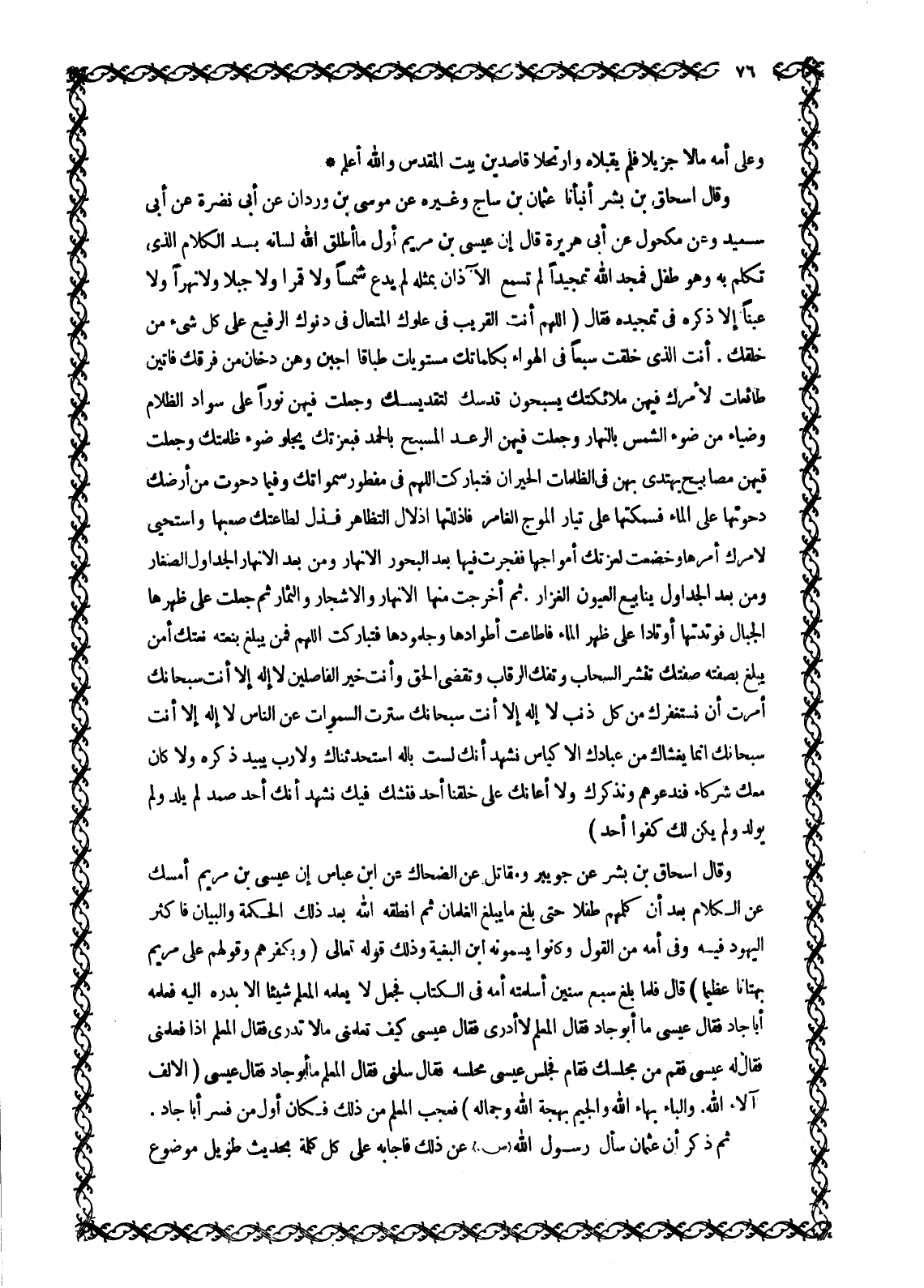 وَعَلَى أُمِّهِ مَالًا جَزِيلًا فَلَمْ يَقْبَلَاهُ وَارْتَحَلَا قَاصِدِينَ بَيْتَ الْمَقْدِسِ وَاللَّهُ أَعْلَمُ وَقَالَ إِسْحَاقُ بن بشر أنبأنا عثمان بن ساج وَغَيْرُهُ عَنْ مُوسَى بْنِ وَرْدَانَ عَنْ أَبِي نَضْرَةَ عَنْ أَبِي سَعِيدٍ وَعَنْ مَكْحُولٍ عَنْ أبى هريرة قال إن عيسى بن مَرْيَمَ أَوَّلَ مَا أَطْلَقَ اللَّهُ لِسَانَهُ بَعْدَ الْكَلَامِ الَّذِي تَكَلَّمَ بِهِ وَهُوَ طِفْلٌ فَمَجَّدَ اللَّهَ تَمْجِيدًا لَمْ تَسْمَعِ الْآذَانُ بِمِثْلِهِ لَمْ يَدَعْ شَمْسًا وَلَا قَمَرًا وَلَا جَبَلًا وَلَا نَهْرًا وَلَا عَيْنًا إِلَّا ذَكَرَهُ فِي تَمْجِيدِهِ فقال (اللَّهمّ أنت القريب في علوك المتعال فِي دُنُوِّكَ الرَّفِيعُ عَلَى كُلِّ شَيْءٍ مِنْ خَلْقِكَ. أَنْتَ الَّذِي خَلَقْتَ سَبْعًا فِي الْهَوَاءِ بِكَلِمَاتِكَ مُسْتَوِيَاتٍ طِبَاقًا أَجَبْنَ وَهُنَّ دُخَانٌ مِنْ فَرَقِكَ فَأَتَيْنَ طَائِعَاتٍ لِأَمْرِكَ فِيهِنَّ مَلَائِكَتُكَ يُسَبِّحُونَ قُدْسَكَ لِتَقْدِيسِكَ وَجَعَلْتَ فِيهِنَّ نُورًا عَلَى سَوَادِ الظَّلَامِ وَضِيَاءً مِنْ ضَوْءِ الشَّمْسِ بِالنَّهَارِ وَجَعَلْتَ فيهن الرعد المسبح بالحمد فبعزتك يجلو ضَوْءَ ظُلْمَتِكَ وَجَعَلْتَ فِيهِنَّ مَصَابِيحَ يَهْتَدِي بِهِنَّ فِي الظُّلُمَاتِ الْحَيْرَانُ فَتَبَارَكْتَ اللَّهمّ فِي مَفْطُورَ سَمَاوَاتِكَ وَفِيمَا دَحَوْتَ مِنْ أَرْضِكَ دَحَوْتَهَا عَلَى الماء فسمكتها على تيار الموج الغامر فاذللتها إذلال التظاهر فَذَلَّ لِطَاعَتِكَ صَعْبُهَا وَاسْتَحْيَى لِأَمْرِكَ أَمْرُهَا وَخَضَعَتْ لعزتك أمواجا فَفَجَّرْتَ فِيهَا بَعْدَ الْبُحُورِ الْأَنْهَارَ وَمِنْ بَعْدِ الْأَنْهَارِ الْجَدَاوِلَ الصِّغَارَ وَمِنْ بَعْدِ الْجَدَاوِلِ يَنَابِيعَ الْعُيُونِ الْغِزَارَ. ثُمَّ أَخْرَجْتَ مِنْهَا الْأَنْهَارَ وَالْأَشْجَارَ وَالثِّمَارَ ثُمَّ جَعَلْتَ عَلَى ظَهْرِهَا الْجِبَالَ فَوَتَّدْتَهَا أَوْتَادًا عَلَى ظَهْرِ الْمَاءِ فَأَطَاعَتْ أَطْوَادُهَا وَجُلْمُودُهَا فَتَبَارَكْتَ اللَّهمّ فَمَنْ يَبْلُغُ بِنَعْتِهِ نَعْتَكَ أَمَّنْ يَبْلُغُ بِصِفَتِهِ صِفَتَكَ تَنْشُرُ السَّحَابَ وَتَفُكُّ الرِّقَابَ وَتَقْضِي الْحَقَّ وَأَنْتَ خَيْرُ الْفَاصِلِينَ لَا إِلَهَ إِلَّا أَنْتَ سُبْحَانَكَ أَمَرْتَ أَنْ نَسْتَغْفِرَكَ مِنْ كُلِّ ذَنْبٍ لَا إِلَهَ إِلَّا أَنْتَ سُبْحَانَكَ سترت السموات عَنِ النَّاسِ لَا إِلَهَ إِلَّا أَنْتَ سُبْحَانَكَ انما يغشاك مِنْ عِبَادِكَ الْأَكْيَاسُ نَشْهَدُ أَنَّكَ لَسْتَ بِإِلَهٍ اسْتَحْدَثْنَاكَ وَلَا رَبٍّ يَبِيدُ ذِكْرُهُ وَلَا كَانَ معك شركاء فندعوهم ونذكرك وَلَا أَعَانَكَ عَلَى خَلْقِنَا أَحَدٌ فَنَشُكَّ فِيكَ نشهد أنك أحد صمد لَمْ يَلِدْ وَلَمْ يُولَدْ وَلَمْ يَكُنْ 112: 3- 4 لَكَ كُفُوًا أَحَدٌ وَقَالَ إِسْحَاقُ بْنُ بِشْرٍ عَنْ جُوَيْبِرٍ وَمُقَاتِلٍ عَنِ الضَّحَّاكِ عن ابن عباس إن عيسى بن مريم أمسك عن الكلام بعد أن كَلَّمَهُمْ طِفْلًا حَتَّى بَلَغَ مَا يَبْلُغُ الْغِلْمَانُ ثم أنطقه الله بعد ذلك الحكمة وَالْبَيَانِ فَأَكْثَرَ الْيَهُودُ فِيهِ وَفِي أُمِّهِ مِنَ القول وكانوا يُسَمُّونَهُ ابْنَ الْبَغِيَّةِ وَذَلِكَ قَوْلُهُ تَعَالَى وَبِكُفْرِهِمْ وَقَوْلِهِمْ عَلى مَرْيَمَ بُهْتاناً عَظِيماً 4: 156 قَالَ فَلَمَّا بَلَغَ سَبْعَ سِنِينَ أَسْلَمَتْهُ أُمُّهُ فِي الْكُتَّابِ فَجَعَلَ لَا يُعَلِّمُهُ الْمُعَلِّمُ شَيْئًا إِلَّا بَدَرَهُ إِلَيْهِ فَعَلَّمَهُ أَبَا جَادٍ فَقَالَ عِيسَى مَا أَبُو جَادٍ فَقَالَ الْمُعَلِّمُ لَا أَدْرِي فَقَالَ عِيسَى كَيْفَ تُعَلِّمُنِي مَا لَا تَدْرِي فَقَالَ الْمُعَلِّمُ إِذًا فَعَلِّمْنِي فَقَالَ لَهُ عِيسَى فَقُمْ مِنْ مَجْلِسِكَ فَقَامَ فَجَلَسَ عِيسَى مجلسه فقال سل
