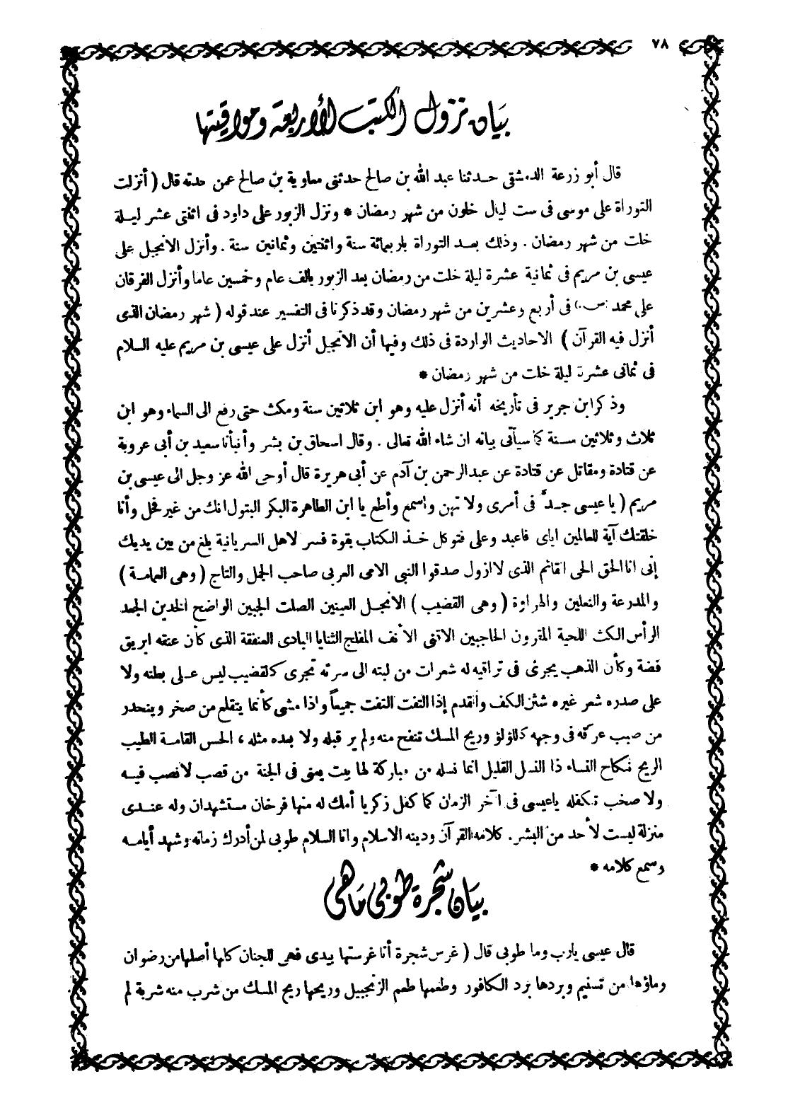 قَالَ أَبُو زرعة الدمشقي حدثنا عَبْدُ اللَّهِ بْنُ صَالِحٍ حَدَّثَنِي مُعَاوِيَةُ بْنُ صَالِحٍ عَمَّنْ حَدَّثَهُ قَالَ (أُنْزِلَتِ التَّوْرَاةُ عَلَى مُوسَى فِي سِتِّ لَيَالٍ خَلَوْنَ مِنْ شَهْرِ رَمَضَانَ وَنَزَلَ الزَّبُورُ عَلَى دَاوُدَ فِي اثْنَتَيْ عَشْرَ لَيْلَةً خَلَتْ مِنْ شَهْرِ رَمَضَانَ. وَذَلِكَ بَعْدَ التَّوْرَاةِ بِأَرْبَعِمِائَةِ سَنَةٍ وَاثْنَتَيْنِ وَثَمَانِينَ سَنَةً. وَأُنْزِلَ الْإِنْجِيلُ عَلَى عِيسَى بن مريم في ثمانية عشرة ليلة خلت من رَمَضَانَ بَعْدَ الزَّبُورِ بِأَلْفِ عَامٍ وَخَمْسِينَ عَامًا وَأُنْزِلَ الْفَرْقَانُ عَلَى مُحَمَّدٍ صَلَّى اللَّهُ عَلَيْهِ وَسَلَّمَ فِي أَرْبَعٍ وَعِشْرِينَ مِنْ شَهْرِ رَمَضَانَ وَقَدْ ذَكَرْنَا فِي التَّفْسِيرِ عِنْدَ قَوْلِهِ شَهْرُ رَمَضانَ الَّذِي أُنْزِلَ فِيهِ الْقُرْآنُ 2: 185 الْأَحَادِيثَ الْوَارِدَةَ فِي ذَلِكَ وَفِيهَا أَنَّ الْإِنْجِيلَ أنزل على عيسى بن مَرْيَمَ عَلَيْهِ السَّلَامُ فِي ثَمَانِي عَشْرَةَ لَيْلَةً خلت من شهر رمضان وذكر بن جَرِيرٍ فِي تَارِيخِهِ أَنَّهُ أُنْزِلَ عَلَيْهِ وَهُوَ ابْنُ ثَلَاثِينَ سَنَةً وَمَكَثَ حَتَّى رُفِعَ إِلَى السَّمَاءِ وَهُوَ ابْنُ ثَلَاثٍ وَثَلَاثِينَ سَنَةً كَمَا سَيَأْتِي بَيَانُهُ إِنْ شَاءَ اللَّهُ تَعَالَى. وَقَالَ إِسْحَاقُ بْنُ بِشْرٍ وَأَنْبَأْنَا سَعِيدُ بْنُ أَبِي عَرُوبَةَ عَنْ قَتَادَةَ وَمُقَاتِلٌ عَنْ قَتَادَةَ عَنْ عَبْدِ الرَّحْمَنِ بْنِ آدَمَ عَنْ أَبِي هُرَيْرَةَ قَالَ أَوْحَى اللَّهُ عَزَّ وَجَلَّ إِلَى عِيسَى بن مَرْيَمَ (يَا عِيسَى جِدَّ فِي أَمْرِي وَلَا تَهِنْ وَاسْمَعْ وَأَطِعْ يَا ابْنَ الطَّاهِرَةِ الْبِكْرِ الْبَتُولِ إِنَّكَ مِنْ غَيْرِ فَحْلٍ وَأَنَا خَلَقْتُكَ آيَةً لِلْعَالَمِينَ إِيَّايَ فَاعْبُدْ وَعَلَيَّ فَتَوَكَّلْ خُذِ الْكِتَابَ بِقُوَّةٍ فَسِّرْ لِأَهْلِ السُّرْيَانِيَّةِ بَلِّغْ مَنْ بَيْنِ يَدَيْكَ أَنِّي أَنَا الْحَقُّ الْحَيُّ الْقَائِمُ الَّذِي لَا أَزُولُ صَدِّقُوا النَّبِيَّ الْأُمِّيَّ الْعَرَبِيَّ صَاحِبَ الْجَمَلِ وَالتَّاجِ (وَهِيَ الْعِمَامَةُ) والمدرعة والنعلين والهرارة (وَهِيَ الْقَضِيبُ) الْأَنْجَلَ الْعَيْنَيْنِ الصَّلْتَ الْجَبِينِ الْوَاضِحَ الْخَدَّيْنِ الْجَعْدَ الرَّأْسِ الْكَثَّ اللِّحْيَةِ الْمَقْرُونَ الْحَاجِبَيْنِ الْأَقْنَى الْأَنْفِ الْمُفَلَّجَ الثَّنَايَا الْبَادِيَ الْعَنْفَقَةِ الَّذِي كَأَنَّ عُنُقَهُ إِبْرِيقُ فِضَّةٍ وَكَأَنَّ الذَّهَبَ يَجْرِي فِي تَرَاقِيهِ لَهُ شَعَرَاتٌ مِنْ لَبَّتِهِ إِلَى سُرَّتِهِ تَجْرِي كَالْقَضِيبِ لَيْسَ عَلَى بَطْنِهِ وَلَا عَلَى صَدْرِهِ شَعْرٌ غَيْرُهُ شَثْنَ الْكَفِّ وَالْقَدَمِ إِذَا الْتَفَتَ الْتَفَتَ جَمِيعًا وَإِذَا مَشَى كَأَنَّمَا يَتَقَلَّعُ مِنْ صَخْرٍ وَيَنْحَدِرُ مِنْ صَبَبٍ عَرَقُهُ في وجهه كاللؤلؤ وريح المسك تنفخ منه ولم يُرَ قَبْلَهُ وَلَا بَعْدَهُ مِثْلُهُ، الْحَسَنَ الْقَامَةِ الطَّيِّبَ الرِّيحِ نَكَّاحَ النِّسَاءِ ذَا النَّسْلِ الْقَلِيلِ إِنَّمَا نَسْلُهُ مِنْ مُبَارَكَةٍ لَهَا بَيْتٌ يَعْنِي فِي الْجَنَّةِ مِنْ قَصَبٍ لَا نَصَبَ فِيهِ وَلَا صَخَبَ تُكَفِّلُهُ يَا عِيسَى فِي آخِرِ الزَّمَانِ كَمَا كَفَّلَ زَكَرِيَّا أُمَّكَ لَهُ مِنْهَا فَرْخَانِ مُسْتَشْهَدَانِ وَلَهُ عِنْدِي مَنْزِلَةٌ لَيْسَتْ لِأَحَدٍ مِنَ الْبَشَرِ. كَلَامُهُ الْقُرْآنُ وَدِينُهُ الْإِسْلَامُ وَأَنَا السَّلَامُ طُوبَى لِمَنْ أَدْرَكَ زَمَانَهُ وَشَهِدَ أَيَّامَهُ وَسَمِعَ كَلَامَهُ