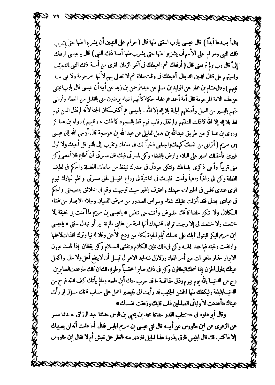 رح من الدنيا باللَّه يوم بيوم وذق مذاقعة ما قد حرب مِنْكَ أَيْنَ طَعْمُهُ وَمَا لَمْ يَأْتِكَ كَيْفَ لذته فرح من الدنيا بالبلغة وليكفك منها الخشن الجشب قد رأيت الى ما يصير اعْمَلْ عَلَى حِسَابٍ فَإِنَّكَ مَسْئُولٌ لَوْ رَأَتْ عيناك مَا أَعْدَدْتُ لِأَوْلِيَائِي الصَّالِحِينَ ذَابَ قَلْبُكَ وَزَهَقَتْ نَفْسُكَ وَقَالَ أَبُو دَاوُدَ فِي كِتَابِ الْقَدَرِ حَدَّثَنَا مُحَمَّدُ بْنُ يَحْيَى بْنِ فَارِسٍ حَدَّثَنَا عَبْدُ الرَّزَّاقِ حَدَّثَنَا مَعْمَرٌ عَنِ الزُّهْرِيِّ عَنْ ابن طاووس عن أبيه قال لقي عيسى بن مَرْيَمَ إِبْلِيسَ فَقَالَ أَمَا عَلِمْتَ أَنَّهُ لَنْ يُصِيبَكَ إِلَّا مَا كُتِبَ لَكَ قَالَ إِبْلِيسُ فارق بذروة هذا الجبل فتردى منه فانظر هل تعيش أم لا فقال ابن طاووس