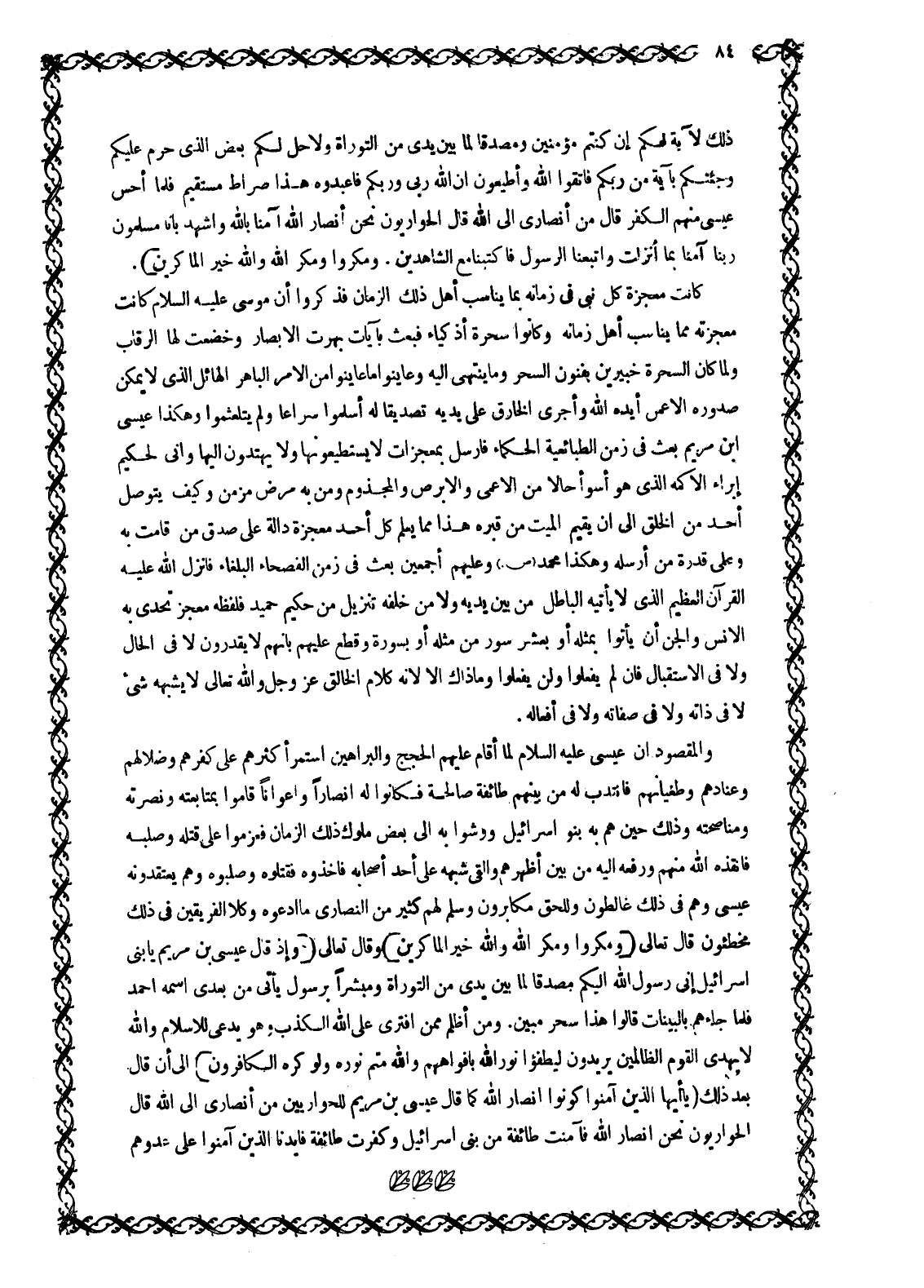 ذلِكَ لَآيَةً لَكُمْ إِنْ كُنْتُمْ مُؤْمِنِينَ وَمُصَدِّقاً لِما بَيْنَ يَدَيَّ مِنَ التَّوْراةِ وَلِأُحِلَّ لَكُمْ بَعْضَ الَّذِي حُرِّمَ عَلَيْكُمْ وَجِئْتُكُمْ بِآيَةٍ مِنْ رَبِّكُمْ فَاتَّقُوا اللَّهَ وَأَطِيعُونِ إِنَّ اللَّهَ رَبِّي وَرَبُّكُمْ فَاعْبُدُوهُ هَذَا صِراطٌ مُسْتَقِيمٌ فَلَمَّا أَحَسَّ عِيسى مِنْهُمُ الْكُفْرَ قال مَنْ أَنْصارِي إِلَى اللَّهِ قَالَ الْحَوارِيُّونَ نَحْنُ أَنْصارُ الله آمَنَّا بِاللَّهِ وَاشْهَدْ بِأَنَّا مُسْلِمُونَ رَبَّنا آمَنَّا بِما أَنْزَلْتَ وَاتَّبَعْنَا الرَّسُولَ فَاكْتُبْنا مَعَ الشَّاهِدِينَ. وَمَكَرُوا وَمَكَرَ الله وَالله خَيْرُ الْماكِرِينَ 3: 48- 54.