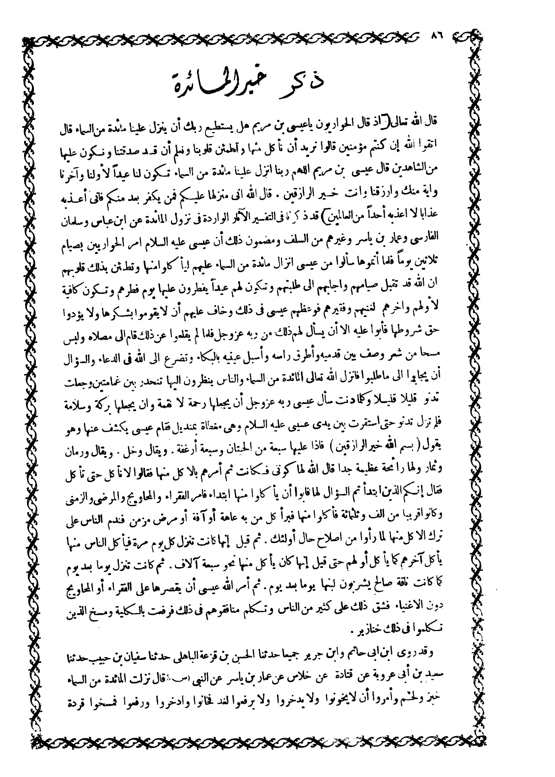 قَالَ اللَّهُ تَعَالَى إِذْ قَالَ الْحَوارِيُّونَ يَا عِيسَى ابْنَ مَرْيَمَ هَلْ يَسْتَطِيعُ رَبُّكَ أَنْ يُنَزِّلَ عَلَيْنا مائِدَةً مِنَ السَّماءِ قَالَ اتَّقُوا اللَّهَ إِنْ كُنْتُمْ مُؤْمِنِينَ قالُوا نُرِيدُ أَنْ نَأْكُلَ مِنْها وَتَطْمَئِنَّ قُلُوبُنا وَنَعْلَمَ أَنْ قَدْ صَدَقْتَنا وَنَكُونَ عَلَيْها مِنَ الشَّاهِدِينَ قَالَ عِيسَى ابْنُ مَرْيَمَ اللَّهُمَّ رَبَّنا أَنْزِلْ عَلَيْنا مائِدَةً مِنَ السَّماءِ تَكُونُ لَنا عِيداً لِأَوَّلِنا وَآخِرِنا وَآيَةً مِنْكَ وَارْزُقْنا وَأَنْتَ خَيْرُ الرَّازِقِينَ. قَالَ اللَّهُ إِنِّي مُنَزِّلُها عَلَيْكُمْ فَمَنْ يَكْفُرْ بَعْدُ مِنْكُمْ فَإِنِّي أُعَذِّبُهُ عَذاباً لَا أُعَذِّبُهُ أَحَداً من الْعالَمِينَ 5: 112- 115 قَدْ ذَكَرْنَا فِي التَّفْسِيرِ الْآثَارَ الْوَارِدَةَ فِي نُزُولِ الْمَائِدَةِ عَنِ ابْنِ عَبَّاسٍ وَسَلْمَانَ الْفَارِسِيِّ وَعَمَّارِ بْنِ يَاسِرٍ وَغَيْرِهِمْ مِنَ السَّلَفِ وَمَضْمُونُ ذَلِكَ أَنَّ عِيسَى عَلَيْهِ السَّلَامُ أَمَرَ الْحَوَارِيِّينَ بِصِيَامِ ثَلَاثِينَ يَوْمًا فَلَمَّا أَتَمُّوهَا سَأَلُوا مِنْ عِيسَى إِنْزَالَ مَائِدَةٍ مِنَ السَّمَاءِ عَلَيْهِمْ لِيَأْكُلُوا مِنْهَا وَتَطْمَئِنَّ بِذَلِكَ قُلُوبُهُمْ أَنَّ اللَّهَ قَدْ تَقَبَّلَ صِيَامَهُمْ وَأَجَابَهُمْ إِلَى طَلِبَتِهِمْ وَتَكُونَ لَهُمْ عِيدًا يُفْطِرُونَ عَلَيْهَا يَوْمَ فِطْرِهِمْ وَتَكُونَ كَافِيَةً لأولهم وآخرهم لغنيهم وفقيرهم فوعظهم عيسى فِي ذَلِكَ وَخَافَ عَلَيْهِمْ أَنْ لَا يَقُومُوا بِشُكْرِهَا وَلَا يُؤَدُّوا حَقَّ شُرُوطِهَا فَأَبَوْا عَلَيْهِ إِلَّا أَنْ يَسْأَلَ لَهُمْ ذَلِكَ مِنْ رَبِّهِ عَزَّ وَجَلَّ فَلَمَّا لَمْ يُقْلِعُوا عَنْ ذَلِكَ قَامَ إِلَى مُصَلَّاهُ وَلَبِسَ مِسْحًا مِنْ شَعْرٍ وَصَفَّ بَيْنَ قَدَمَيْهِ وَأَطْرَقَ رَأْسَهُ وَأَسْبَلَ عَيْنَيْهِ بِالْبُكَاءِ وَتَضَرَّعَ إِلَى اللَّهِ فِي الدُّعَاءِ وَالسُّؤَالِ أَنْ يُجَابُوا إِلَى مَا طَلَبُوا فَأَنْزَلَ اللَّهُ تَعَالَى الْمَائِدَةَ مِنَ السَّمَاءِ وَالنَّاسُ يَنْظُرُونَ إِلَيْهَا تَنْحَدِرُ بَيْنَ غَمَامَتَيْنِ وَجَعَلَتْ تَدْنُو قَلِيلًا قَلِيلًا وكلما دنت سأل عيسى رَبَّهُ عَزَّ وَجَلَّ أَنْ يَجْعَلَهَا رَحْمَةً لَا نِقْمَةً وَأَنْ يَجْعَلَهَا بَرَكَةً وَسَلَامَةً فَلَمْ تَزَلْ تَدْنُو حَتَّى اسْتَقَرَّتْ بَيْنَ يَدَيْ عِيسَى عَلَيْهِ السَّلَامُ وَهِيَ مُغَطَّاةٌ بِمَنْدِيلٍ فَقَامَ عِيسَى يَكْشِفُ عَنْهَا وَهُوَ يَقُولُ (بِسْمِ اللَّهِ خَيْرُ الرَّازِقِينَ) فَإِذَا عَلَيْهَا سَبْعَةٌ مِنَ الْحِيتَانِ وَسَبْعَةُ أَرْغِفَةٍ. وَيُقَالُ وَخَلٌّ. وَيُقَالُ وَرُمَّانٌ وَثِمَارٌ وَلَهَا رَائِحَةٌ عَظِيمَةٌ جِدًّا قَالَ اللَّهُ لَهَا كُونِي فَكَانَتْ ثُمَّ أَمَرَهُمْ بِالْأَكْلِ مِنْهَا فَقَالُوا لَا نَأْكُلُ حتى تأكل فقال إنكم الذين ابتدأ تم السُّؤَالَ لَهَا فَأَبَوْا أَنْ يَأْكُلُوا مِنْهَا ابْتِدَاءً فامر الفقراء والمحاويج والمرضى والزمنى وكانوا قريبا مِنْ أَلْفٍ وَثَلَاثِمِائَةٍ فَأَكَلُوا مِنْهَا فَبَرَأَ كُلُّ مَنْ بِهِ عَاهَةٌ أَوْ آفَةٌ أَوْ مَرَضٌ مُزْمِنٌ فَنَدِمَ النَّاسُ عَلَى تَرْكِ الْأَكْلِ مِنْهَا لِمَا رَأَوْا مِنْ إِصْلَاحِ حَالِ أُولَئِكَ. ثُمَّ قِيلَ إِنَّهَا كَانَتْ تَنْزِلُ كُلَّ يَوْمٍ مَرَّةً فَيَأْكُلُ النَّاسُ مِنْهَا يَأْكُلُ آخِرُهُمْ كَمَا يَأْكُلُ أَوَّلُهُمْ حَتَّى قِيلَ إِنَّهَا كَانَ يَأْكُلُ مِنْهَا نَحْوُ سَبْعَةِ آلَافٍ. ثُمَّ كَانَتْ تَنْزِلُ يَوْمًا بَعْدَ يَوْمٍ كَمَا كَانَتْ نَاقَةُ صَالِحٍ يَشْرَبُونَ لَبَنَهَا يَوْمًا بَعْدَ يَوْمٍ. ثُمَّ أَمَرَ اللَّهُ عِيسَى أَنْ يَقْصُرَهَا عَلَى الْفُقَرَاء
